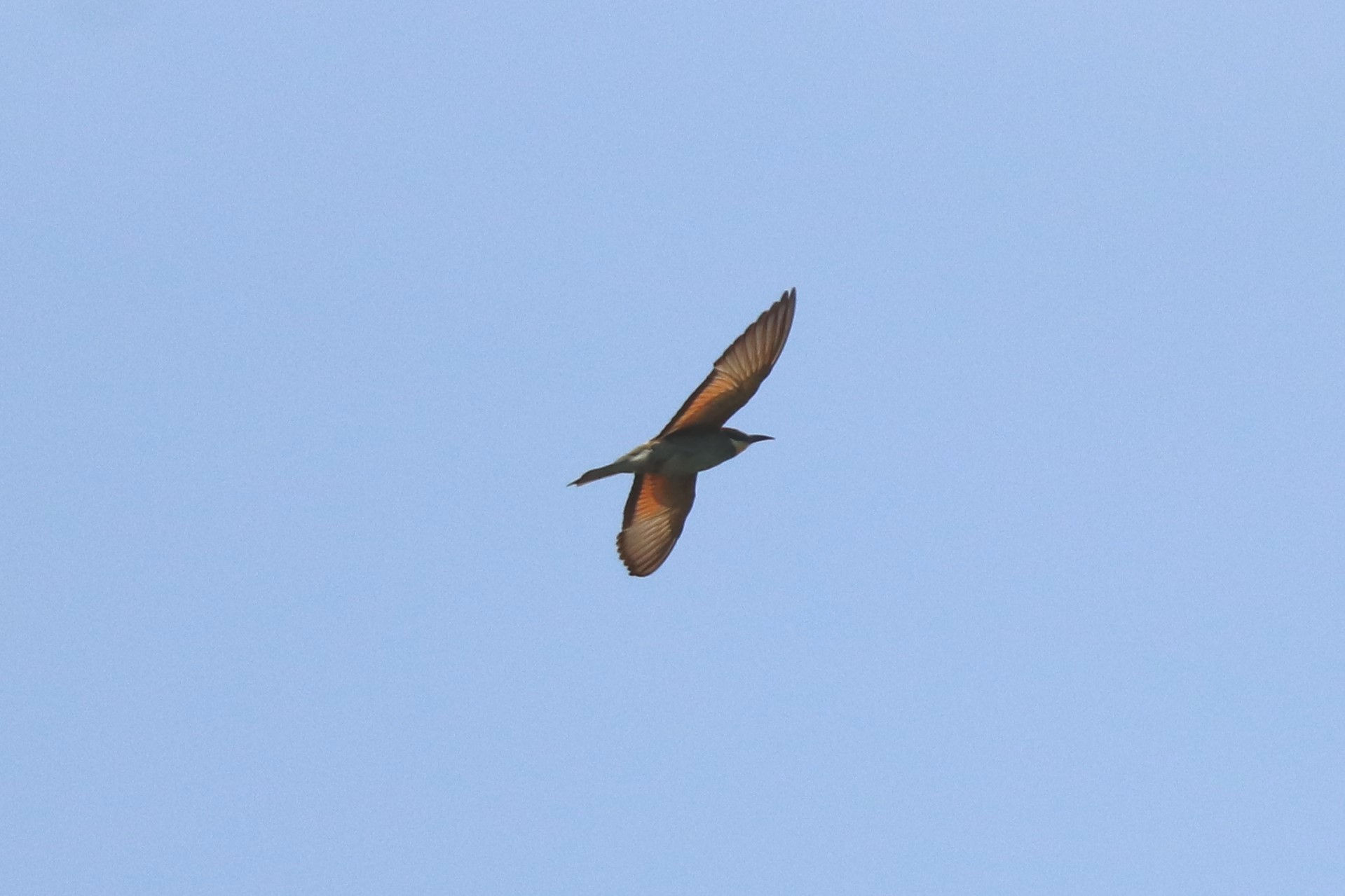 Wenn eine Gruppe Bienenfresser über den Bäumen kreist, dann ist das ein unheimlich schöner und faszinierender Anblick. Mit ihren dreieckigen Flügeln wirken sie im Flug wie riesige Schwalben. Die dreieckigen Flügel sind Orange und haben schwarze Ränder. Wenn sie von der Sonne angestrahlt werden, sind sie leicht durchsichtig und leuchten in der Sonne. Das läßt den Bienenfresser sogar im Flug noch exotisch erscheinen.