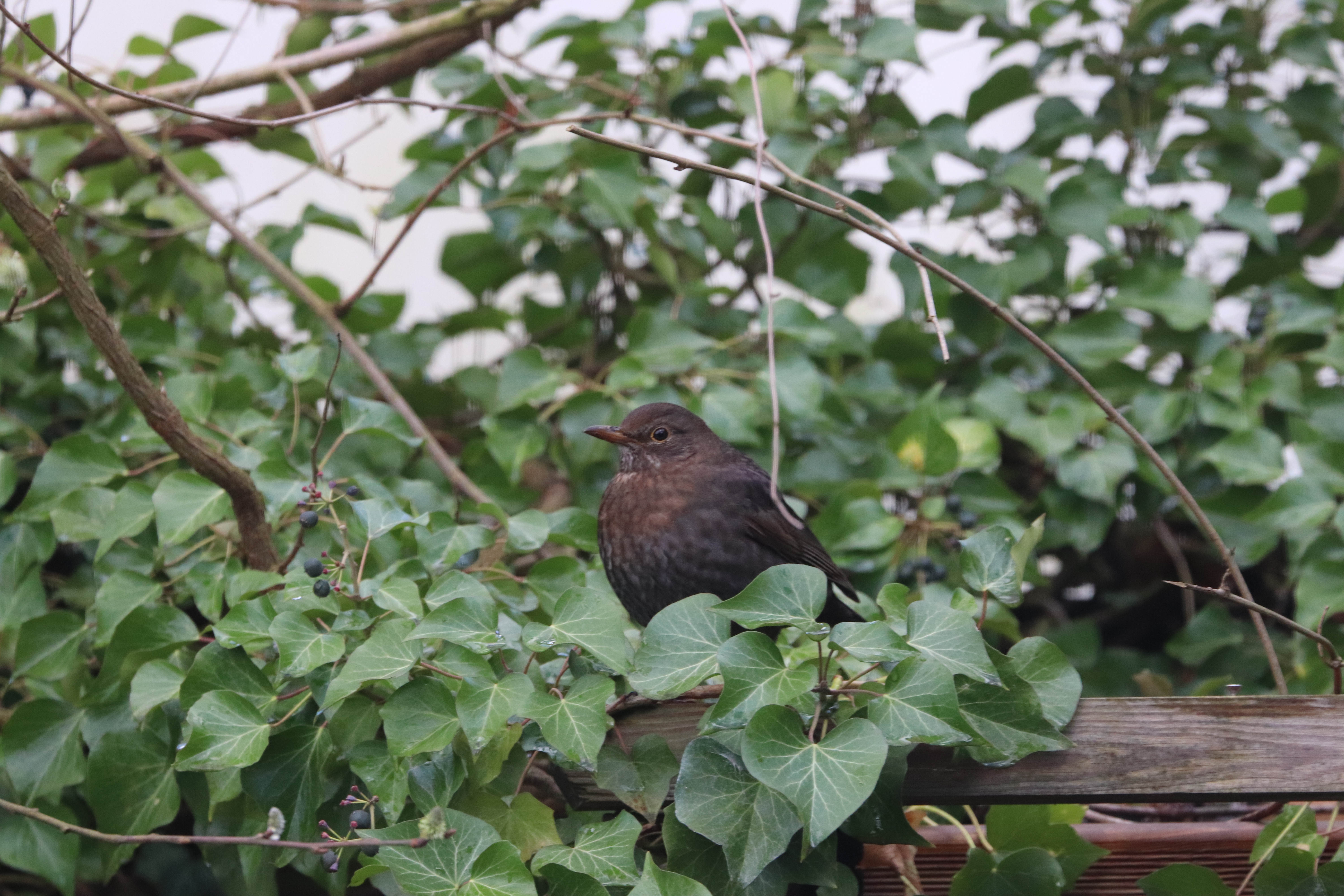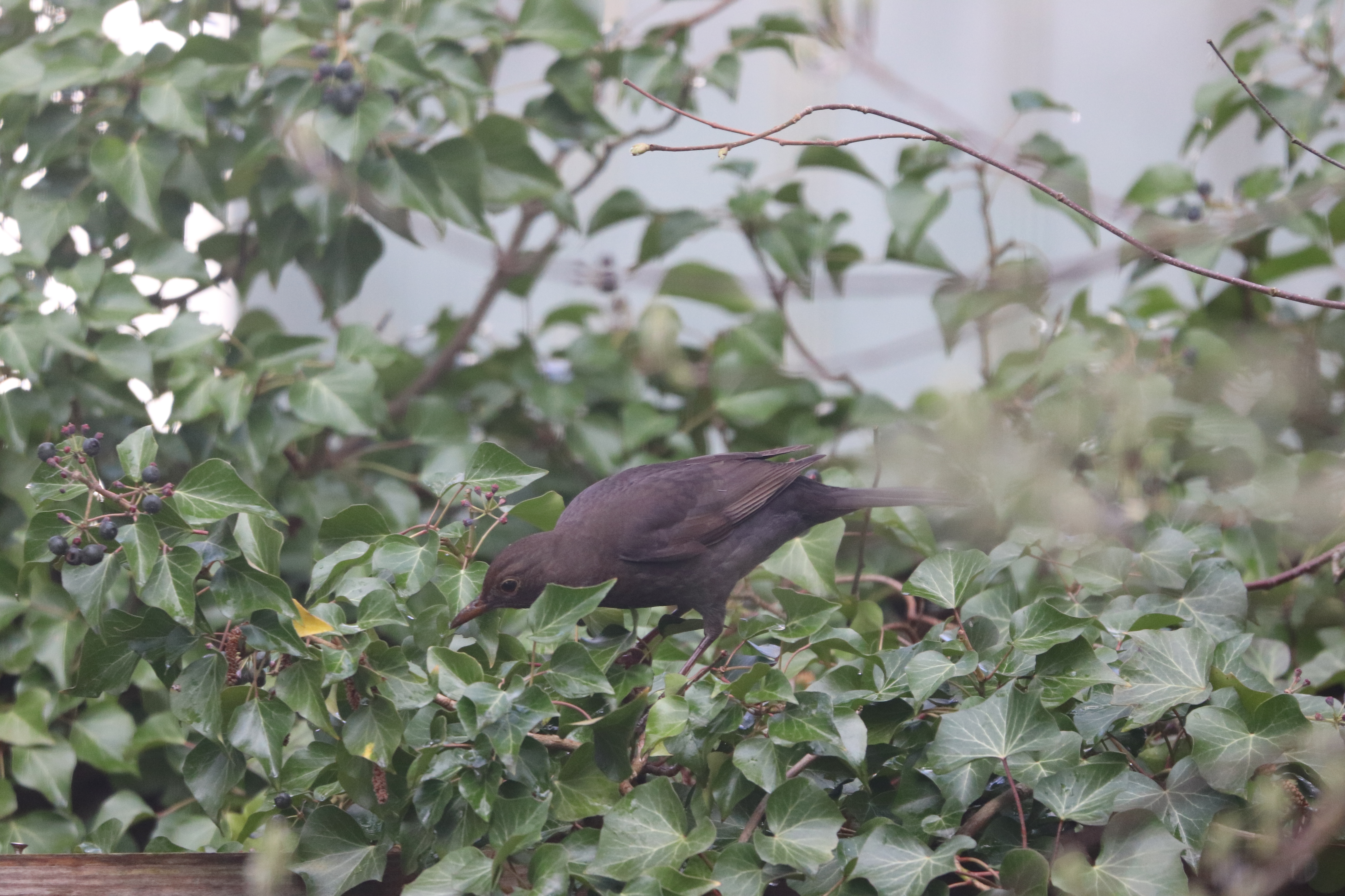 - Die Amseln fressen gerne Beeren. Wie hier vom Efeu