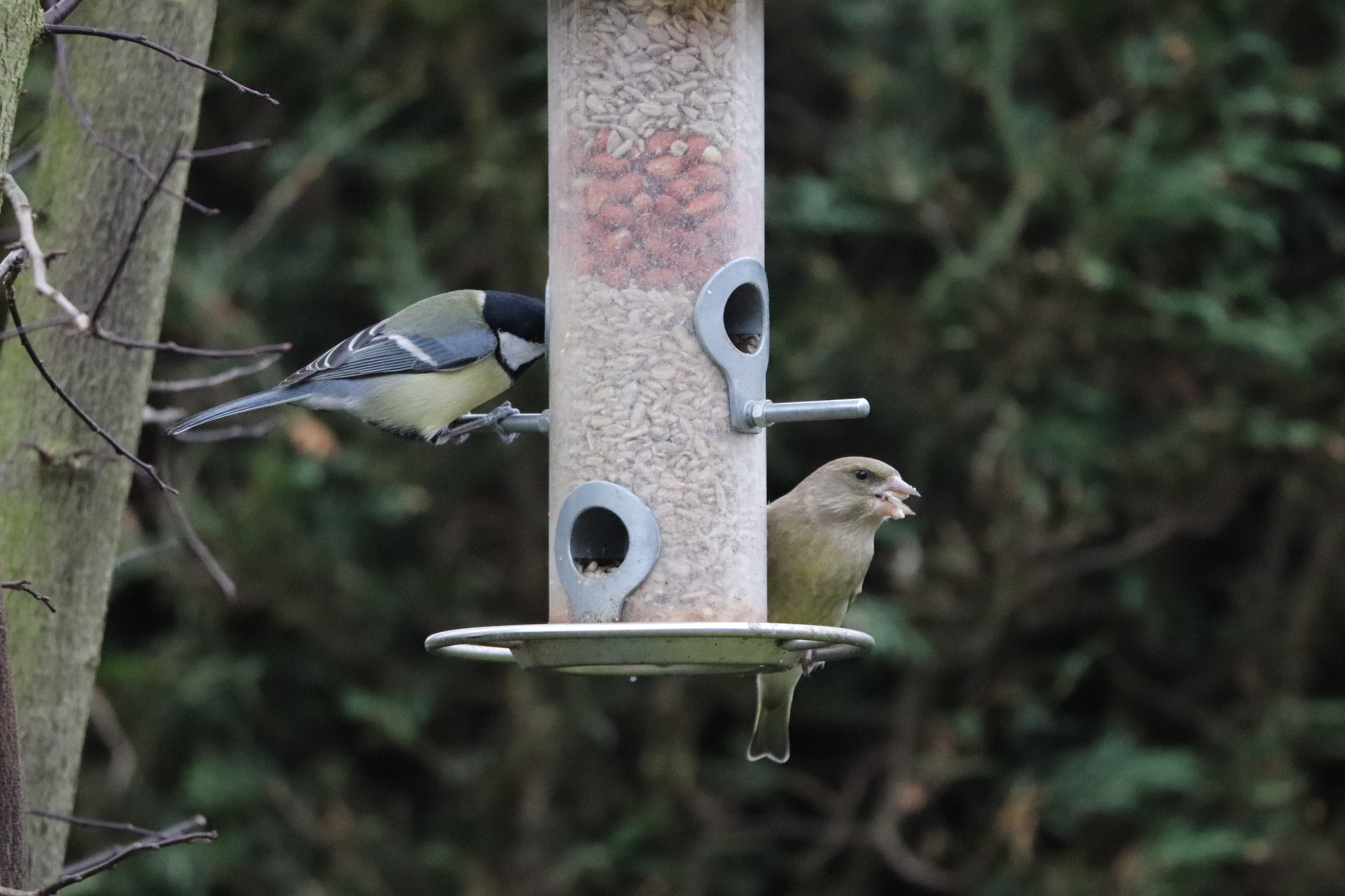 - Kohlmeise und Grünfink gemeinsam an der Futterstation