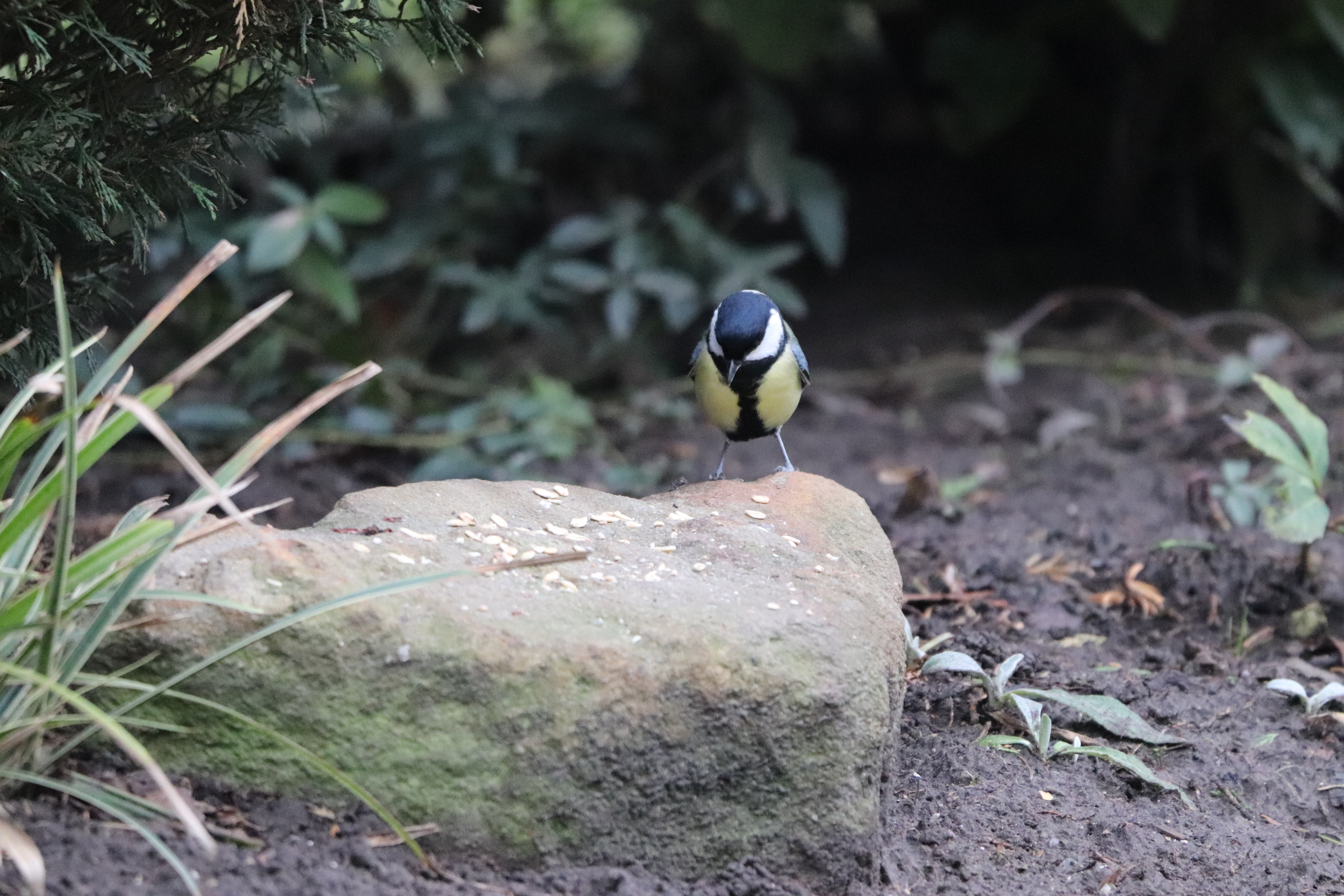 - Die Kohlmeise begutachtet den leeren Stein. Die Ringeltaube hat ihn am Morgen leer gefressen.