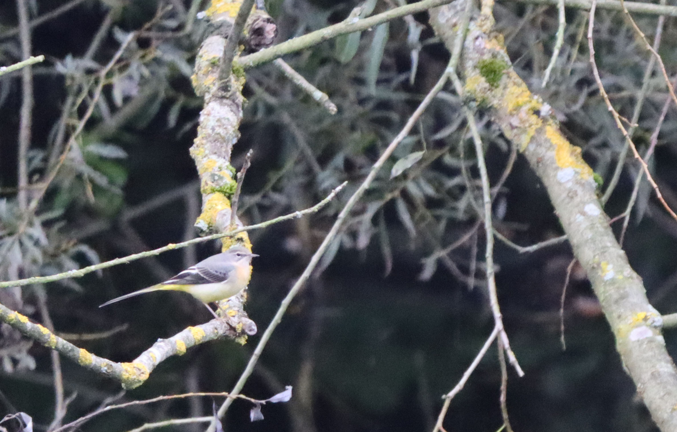 - Die Gebirgsstelze sitzt links oben auf dem Ast und ist auf dem grauen Ast mit den gelben Flechten hervorragend getarnt!