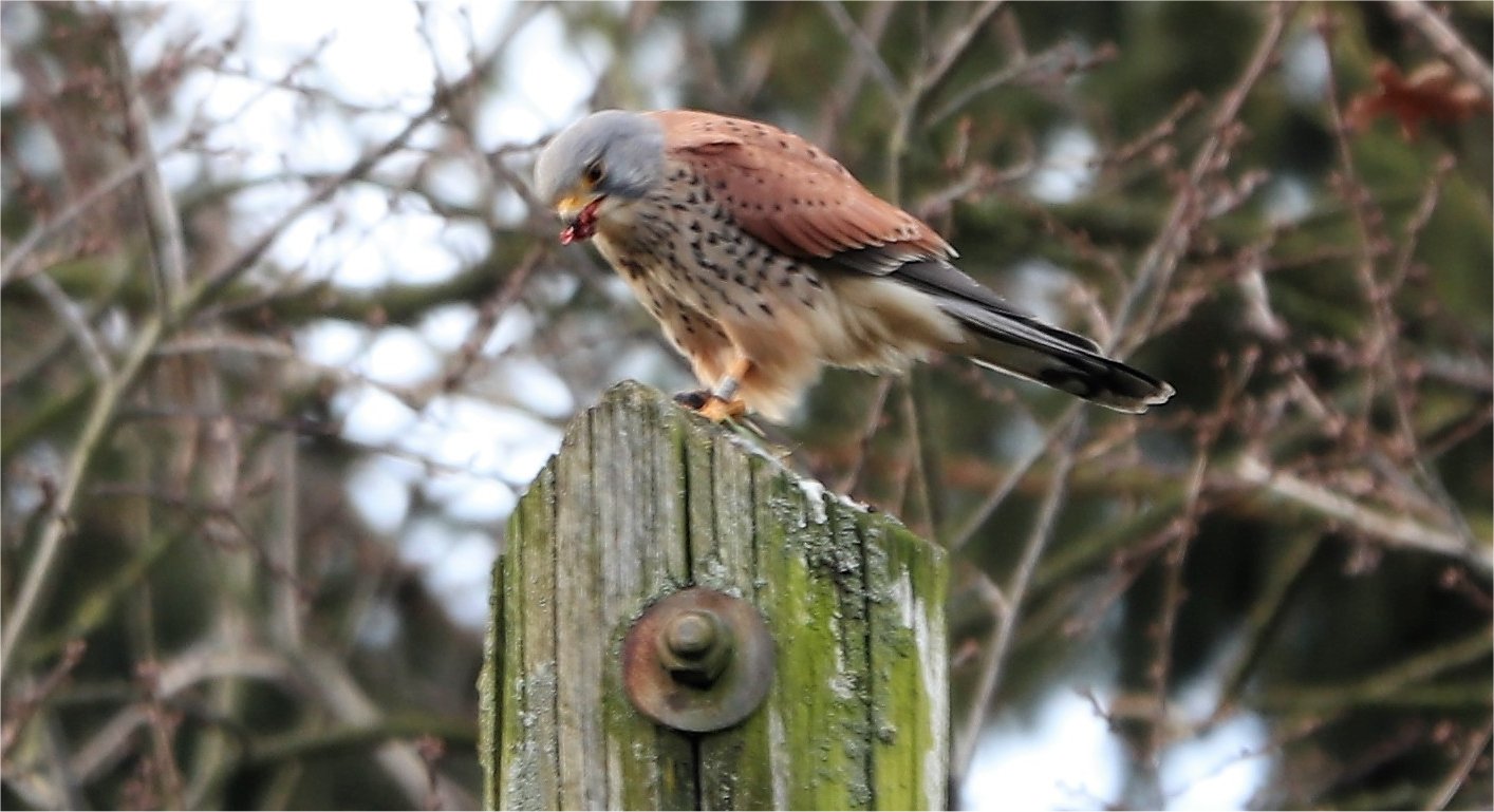 Als ich diesmal noch weiter den Berg hinauf gewandert bin, konnte ich auch einen Turmfalken in seinem Revier und bei der Jagd beobachten. Der männliche Turmfalke war auch erfolgreich und hat eine Maus gefangen, die er dann auf einem Stromleitungsmast gefressen hat.