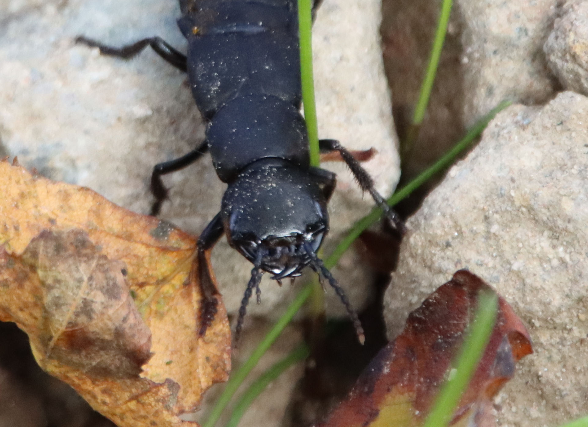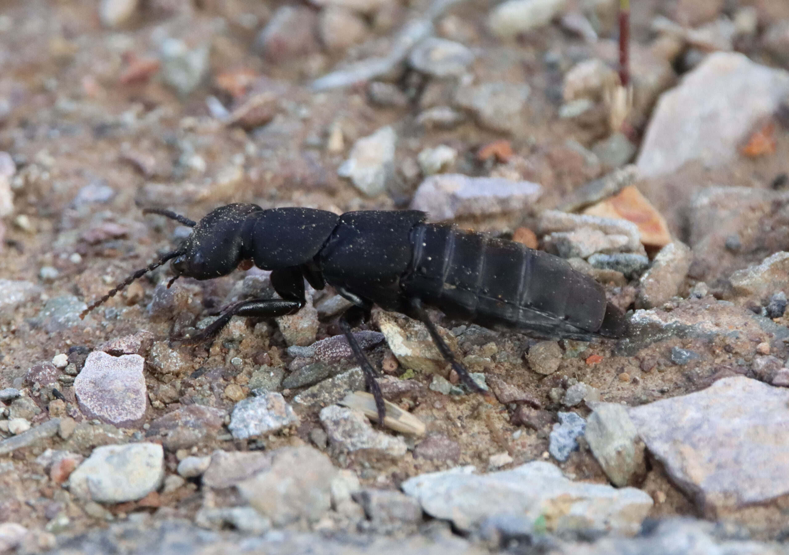 Schwarzer Moderkäfer: Der spitz zulaufende Hinterleib mit den sechs Segmenten kennzeichnet den Moderkäfer