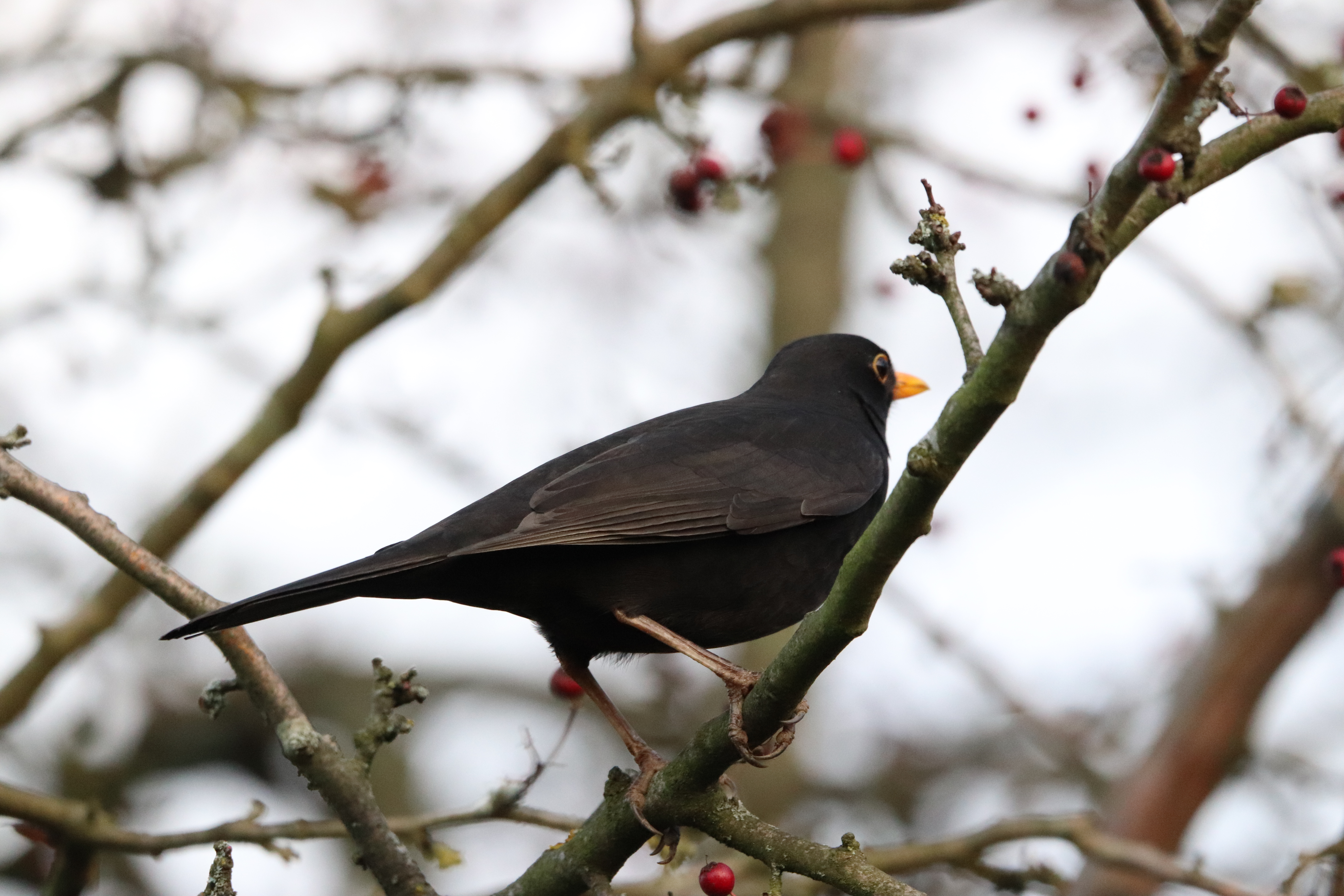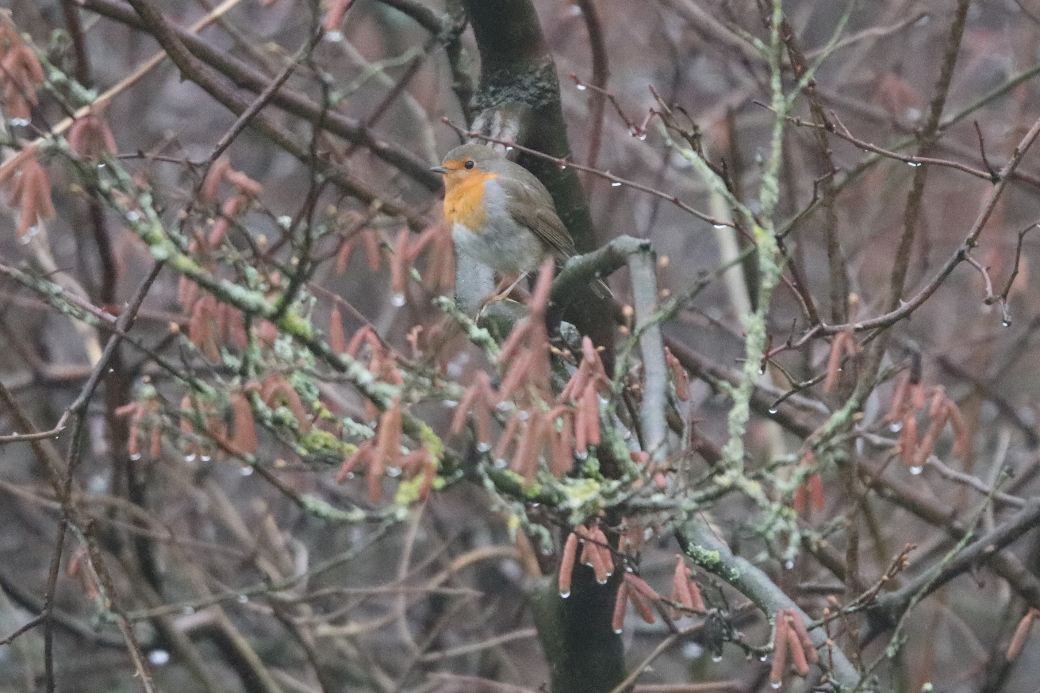 Auf meinem Spaziergang habe ich dann noch sehr schöne Beobachtungen gemacht. Ich sah einen Mäusebussard, der eine Maus gefangen hatte. Und ich sah den männlichen Hausrotschwanz wieder! Wieder an der Stelle mit den Zaunpfählen und wieder ließ er mich nah heran. Diesmal musste er sich die Zaunpfähle aber teilen. Ich dachte mit seiner Partnerin. Da ich erst einen braunen Vogel sah. Aber es war ein Rotkehlchen. Auch ein Gewinner der Vogelzählung. Der Winter war gut für die Rotkehlchen.