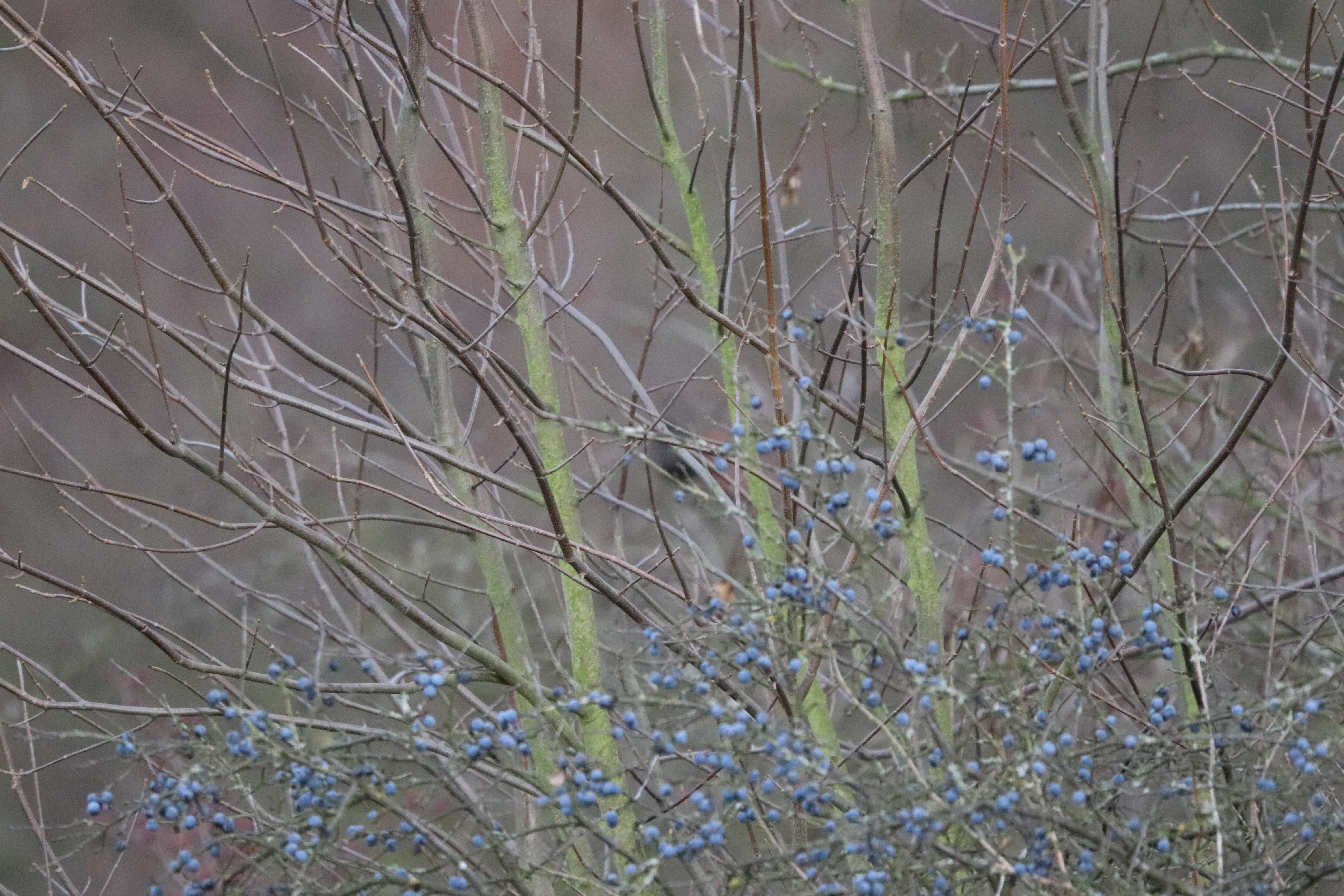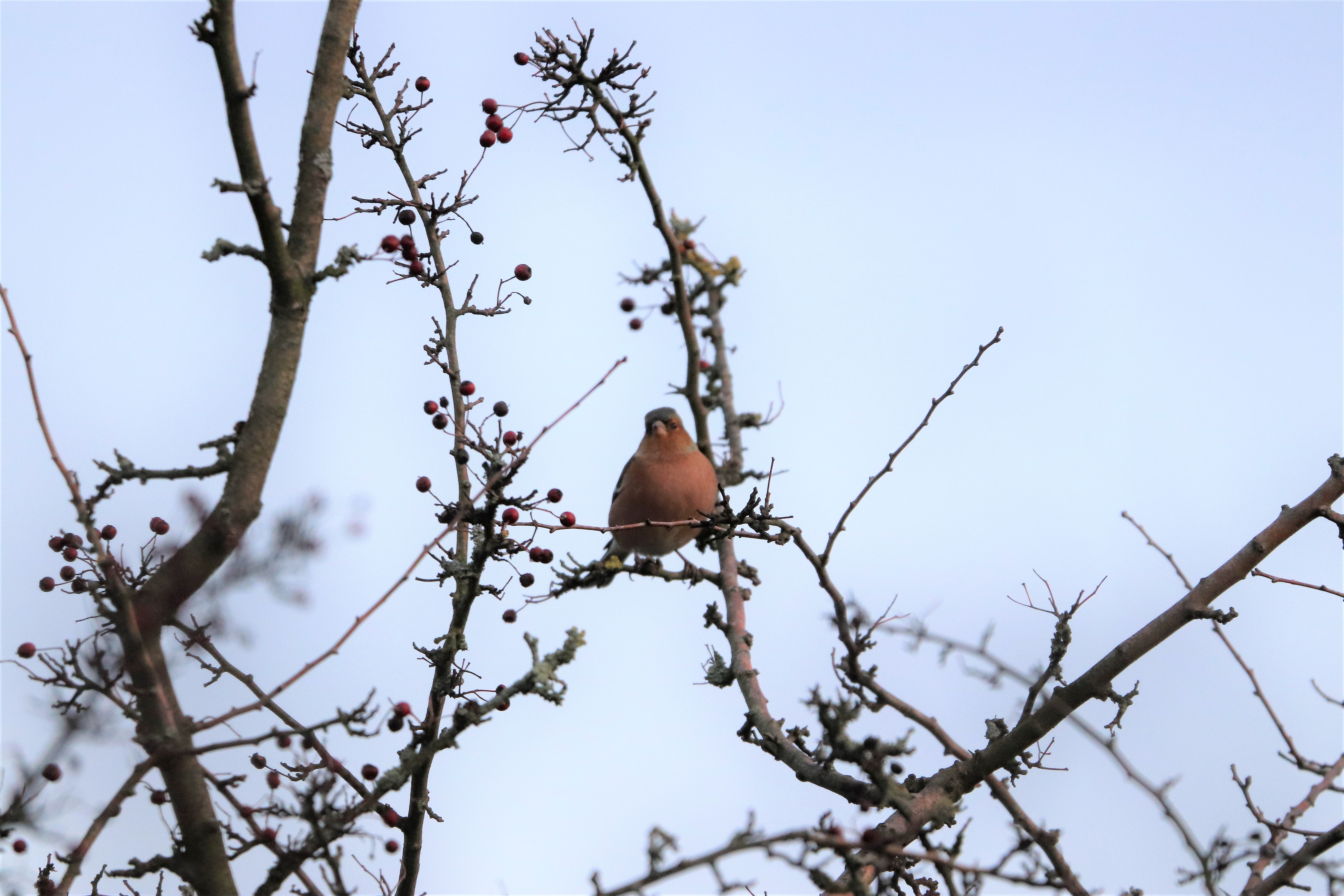 In Langenberg gibt es nicht nur in den Gärten die Vogelbeeren, es gibt auch noch ursprüngliche Hecken mit Brombeersträuchern an den Wiesen und Wegen. In diesen Hecken gibt es einige Ebereschen die im Moment noch Beeren tragen. Und einen Apfelbaum, der noch kleine Äpfel trägt. Diese Bäume ziehen viele Vögel an. Besonders große Gruppen von Kohl- und Blaumeisen. Wenn es Beeren gibt, schlagen sie gerne zu. Aber auch die Trupps von den kleinen Schwanzmeisen zieht man häufig.