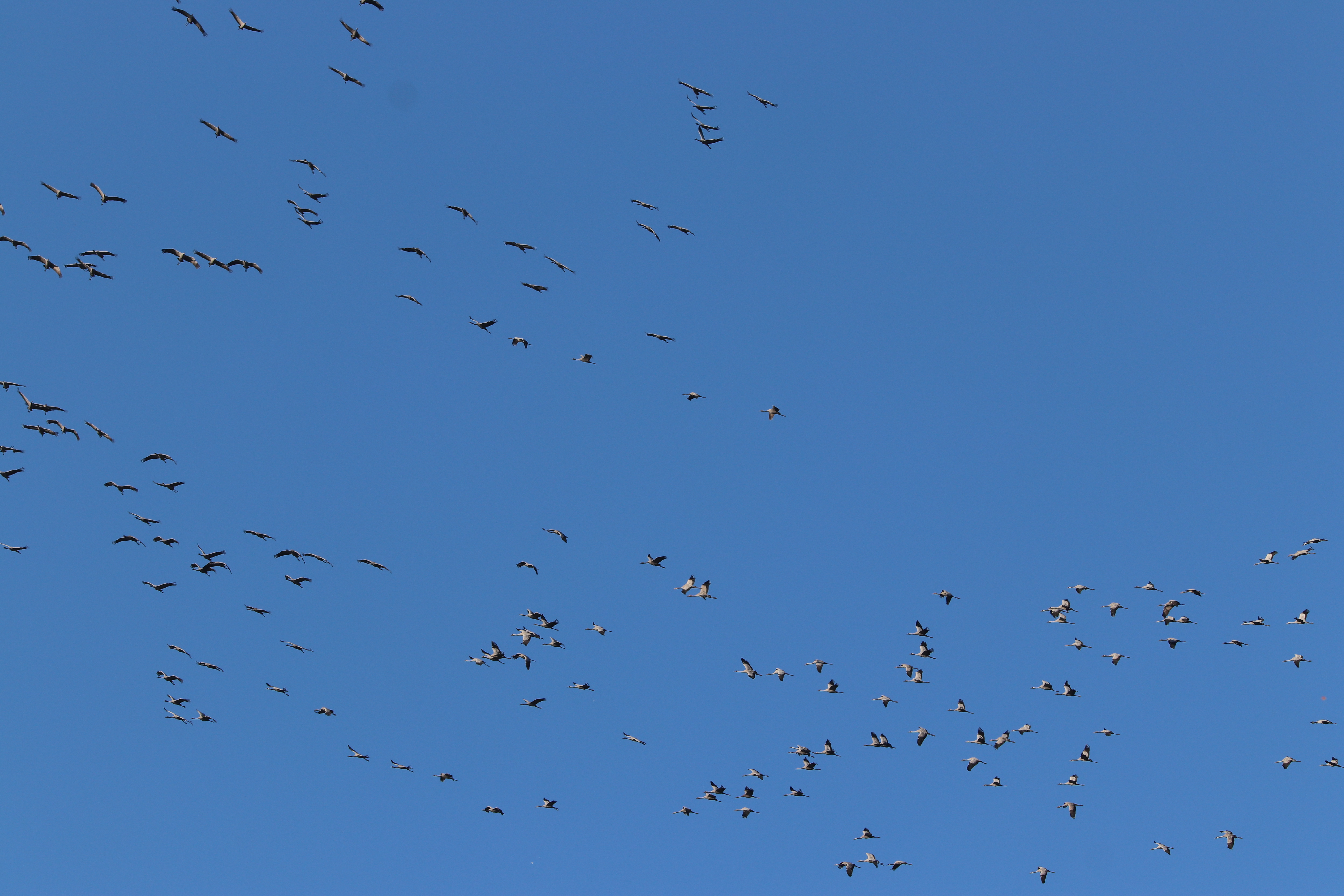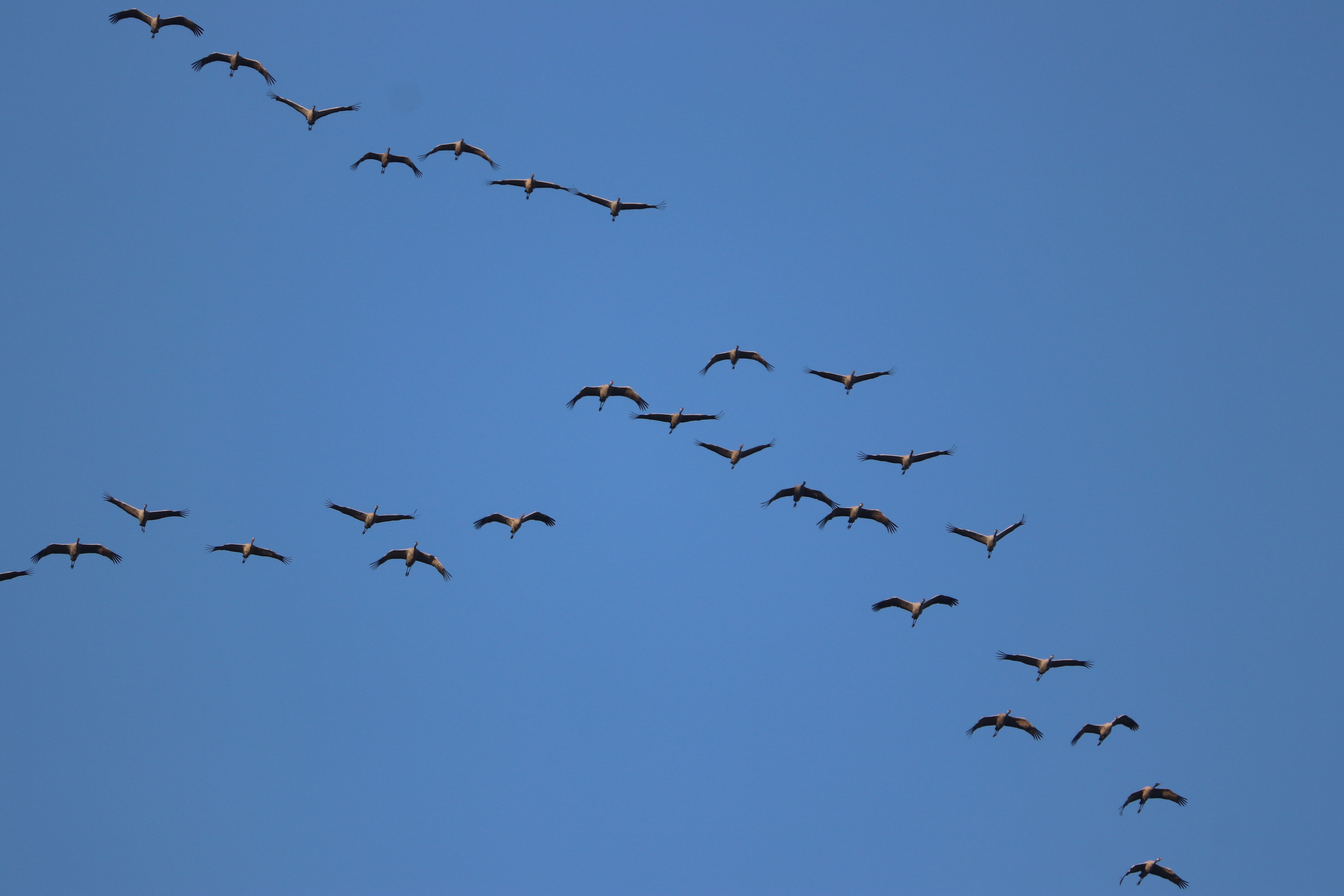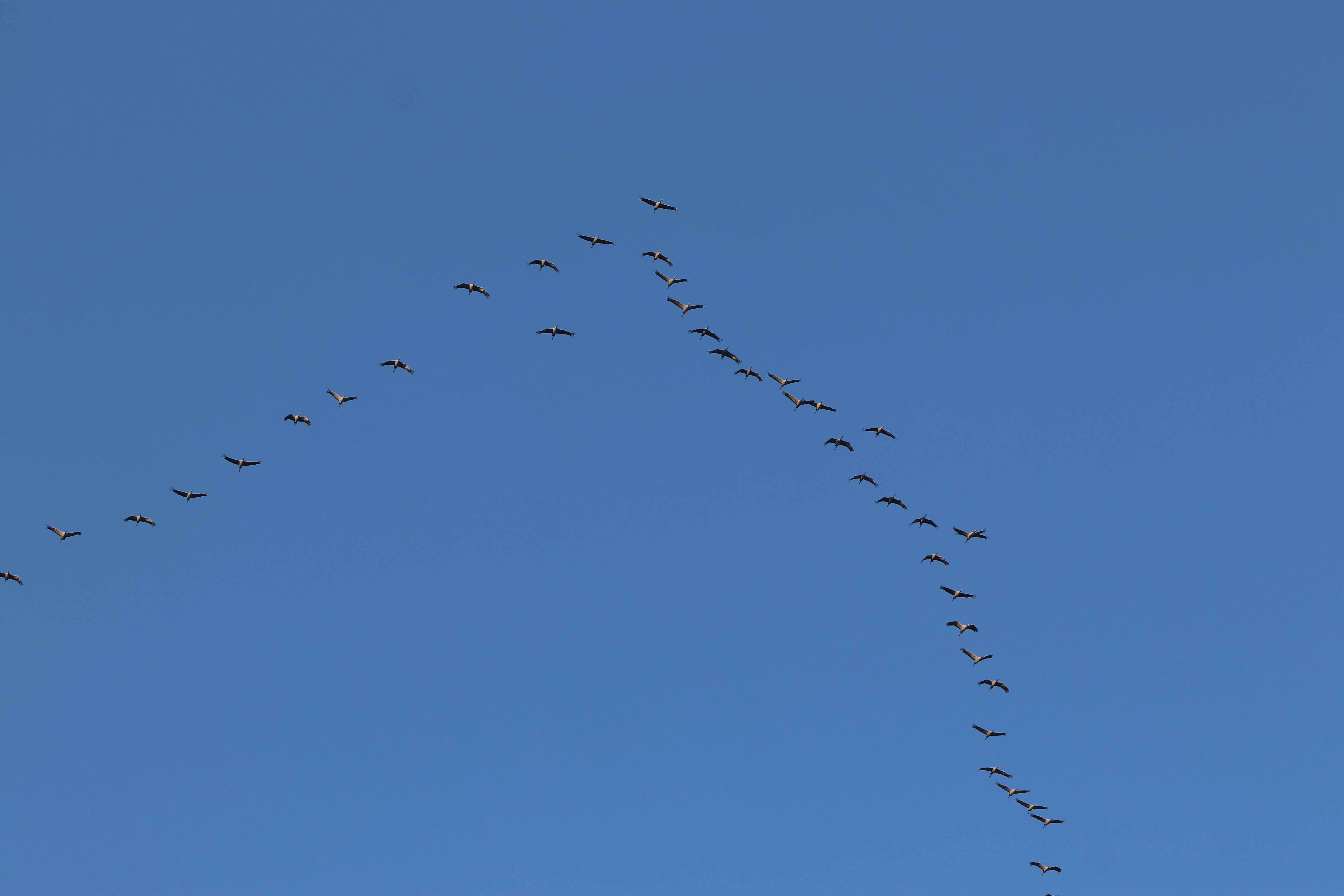 Am Sonntag konnte ich an einem sehr großen Trupp das Gegenteil beobachten. Die Flugformation war völlig aufgelöst und es wurde im Schwarm weiter geflogen. Was man selten sieht. Die Formation wird sonst nur aufgelöst, um an einer Stelle an Höhe zu gewinnen oder sich neu zu formieren.