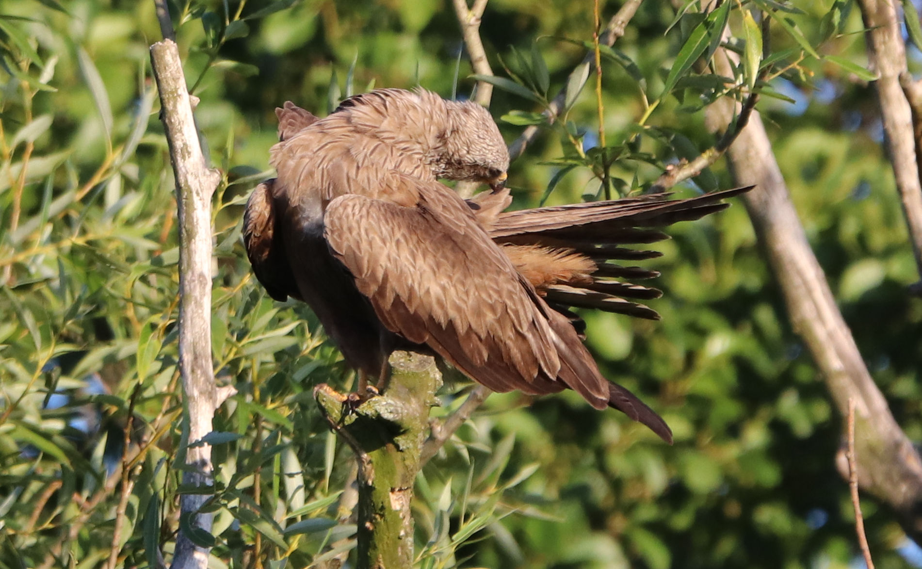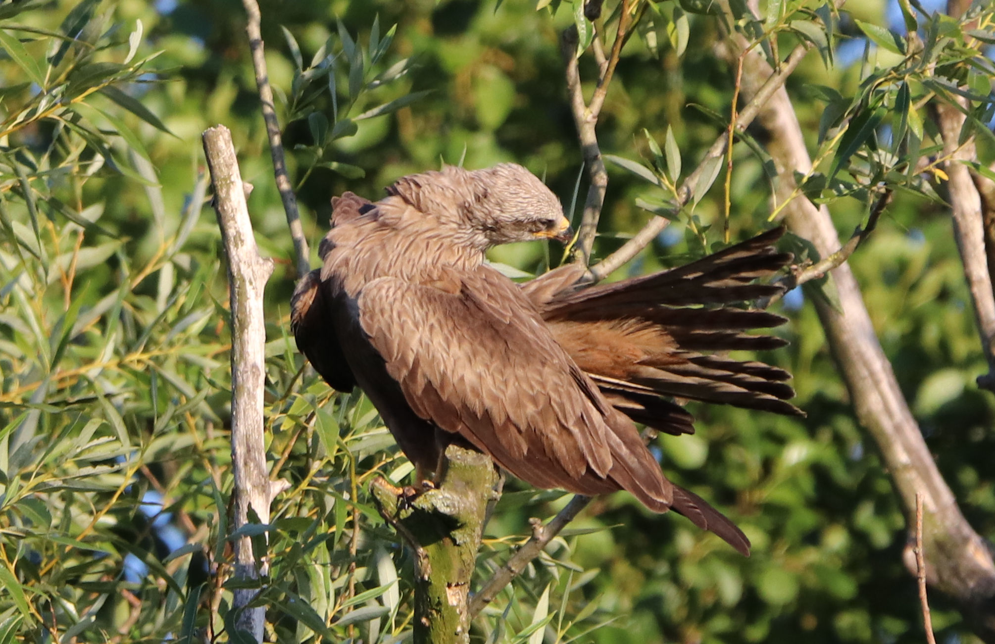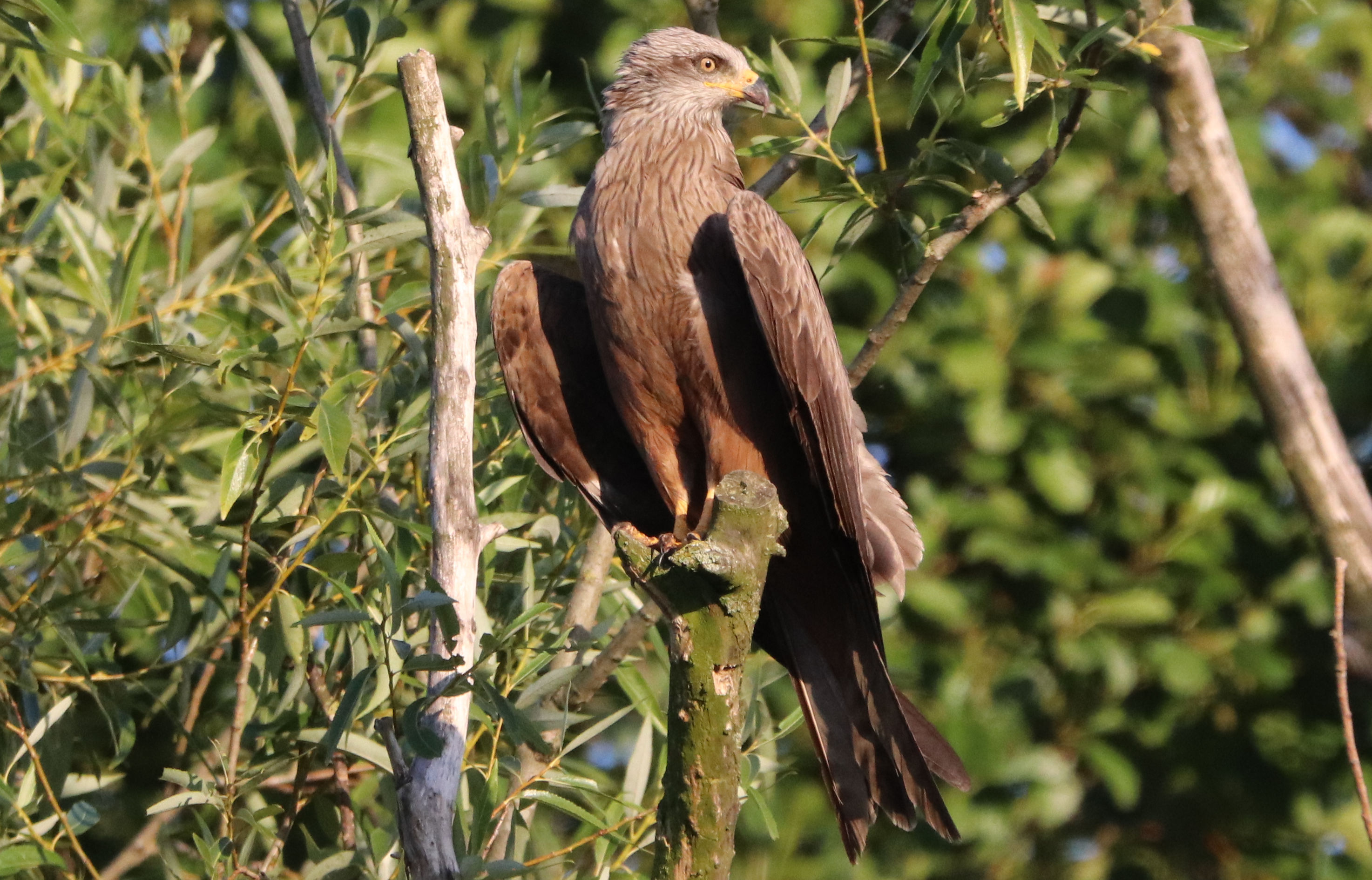 Der Schwarzmilan ist einer der Altvögel und gehört zum Jungvogel, denn ich vor kurzem fotografiert habe. Am Nachmittag hatte ich die beiden Altvögel zusammen mit dem Jungvogel noch im Flug gesehen. Sie schraubten sich in der Thermik immer weiter nach oben und verschwanden dann in Richtung Süden. Die Altvögel fliegen noch oft mit dem Jungvogel zusammen, als würden sie ihm noch Unterricht geben.