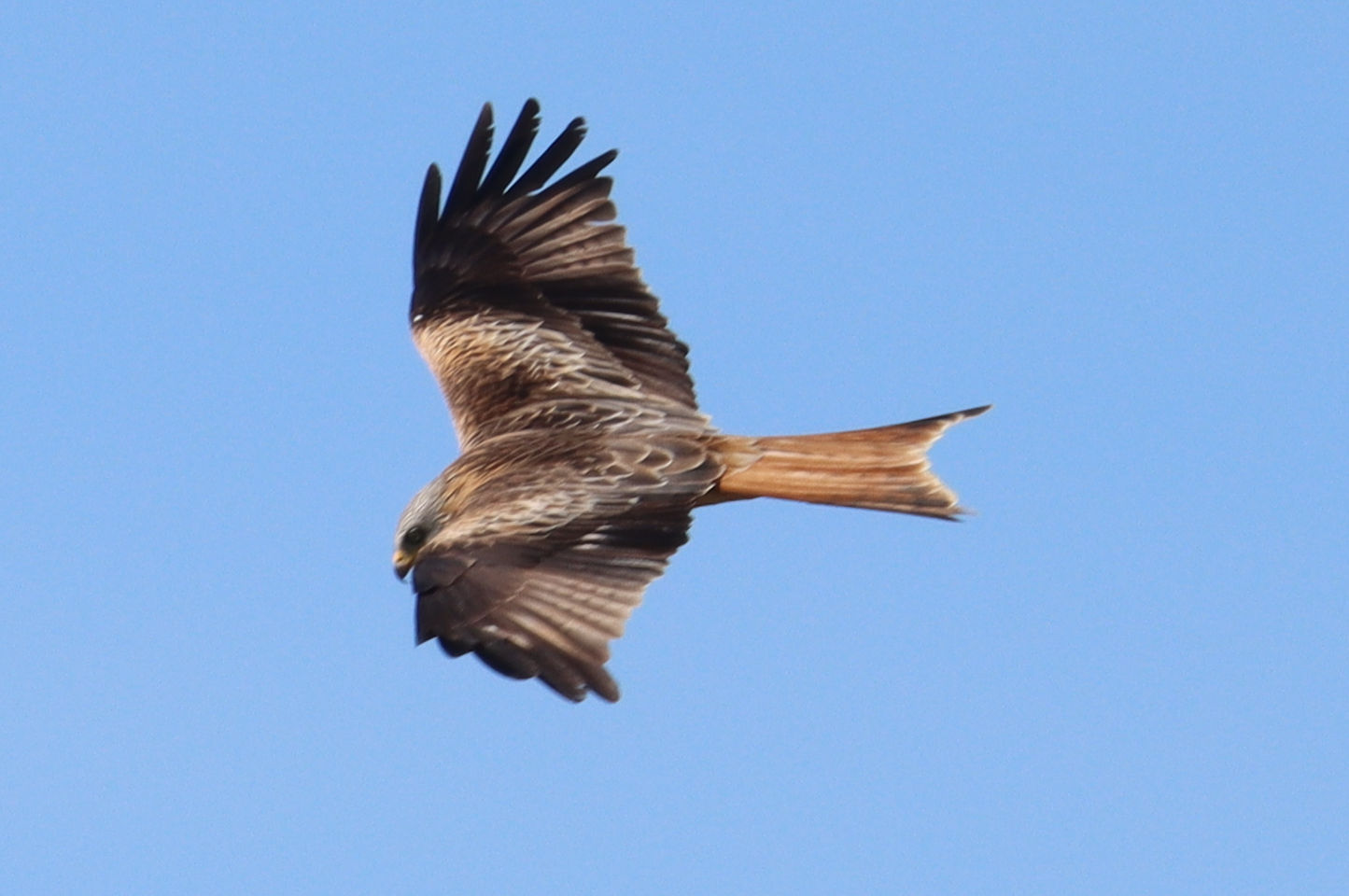 - Im niedrigen Suchflug fliegt der Rotmilan über die Felder