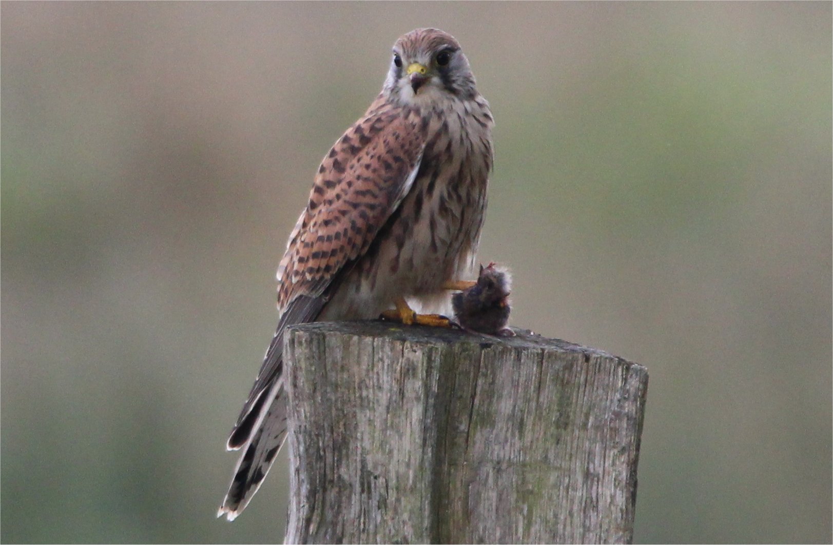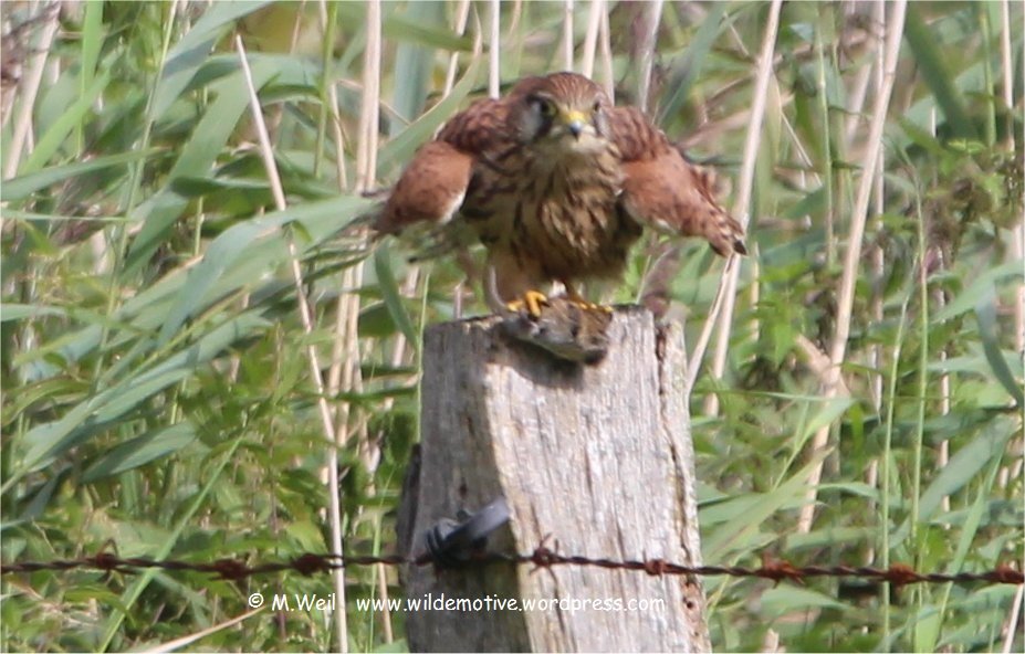 Als ich sie das erste Mal sah, saß sie auf einen Zaunpfahl und flog von dort auf die Wiese und hatte tatsächlich auf dieser kurzen Entfernung die Maus gefangen. Anschließend flog sie den kurzen Weg zurück auf den Pfahl und präsentierte nicht nur ihre Beute, sie drohte auch in meine Richtung. Sie wollte ganz klar zeigen, das es ihre Maus ist! Das sieht man auf dem ersten Bild. Die weiteren Bilder sind vom letzten Wochenende. Wo sie nicht nur die Maus gefangen hat, sondern auch sonst sehr aktiv war und häufig zu sehen war. An der Beobachtungshütte am großen Stausee, am Aussichtsturm und an einem weiteren Teich.