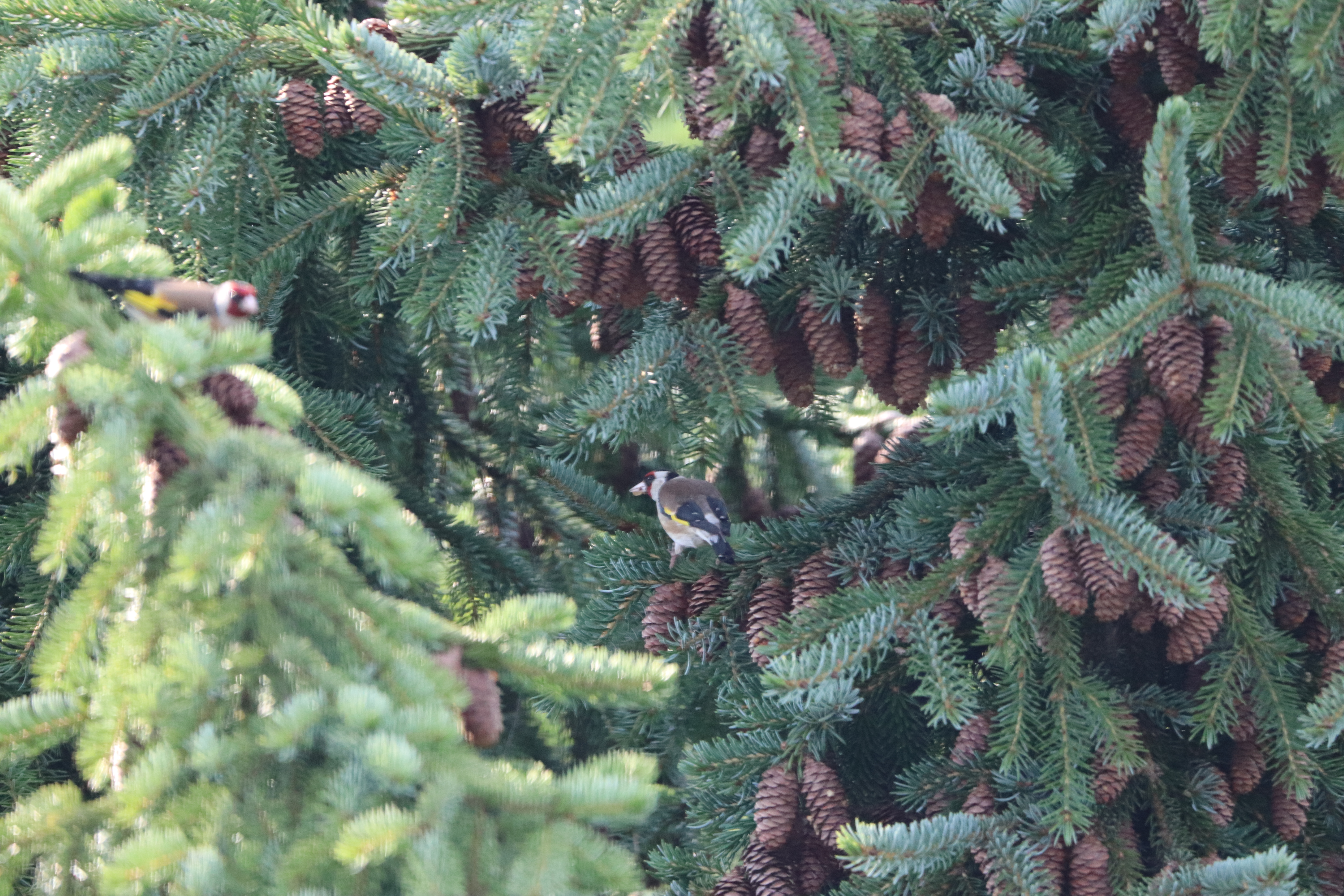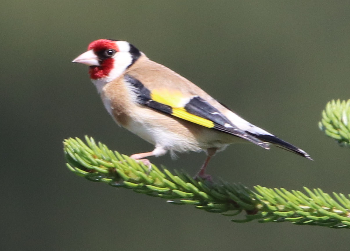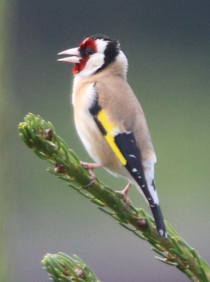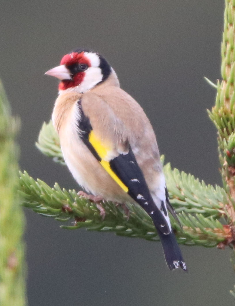 Ein anderer Fink war in den letzten Tagen immer wieder zu Besuch, der Stieglitz (Carduelis Carduelis) oder Distelfink. Der Stieglitz interessiert sich für die Samen in Tannenzapfen. Der Stieglitz ist ähnlich scharf auf Samen wie der Dompfaff. Es ist die Hauptnahrung dieser beiden Finkenvögel.