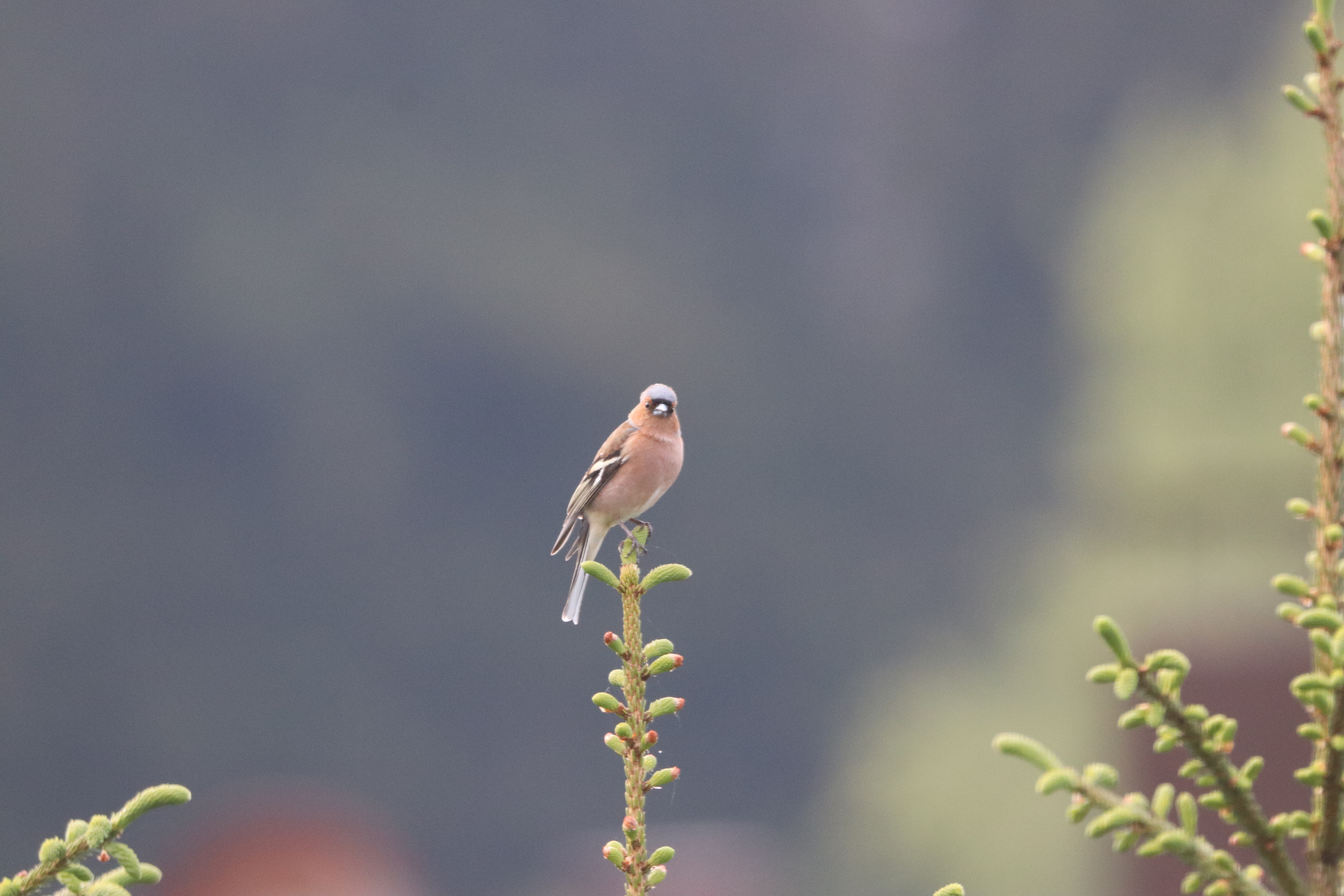- Das Buchfink-Männchen nutzt auch die Tannenspitze