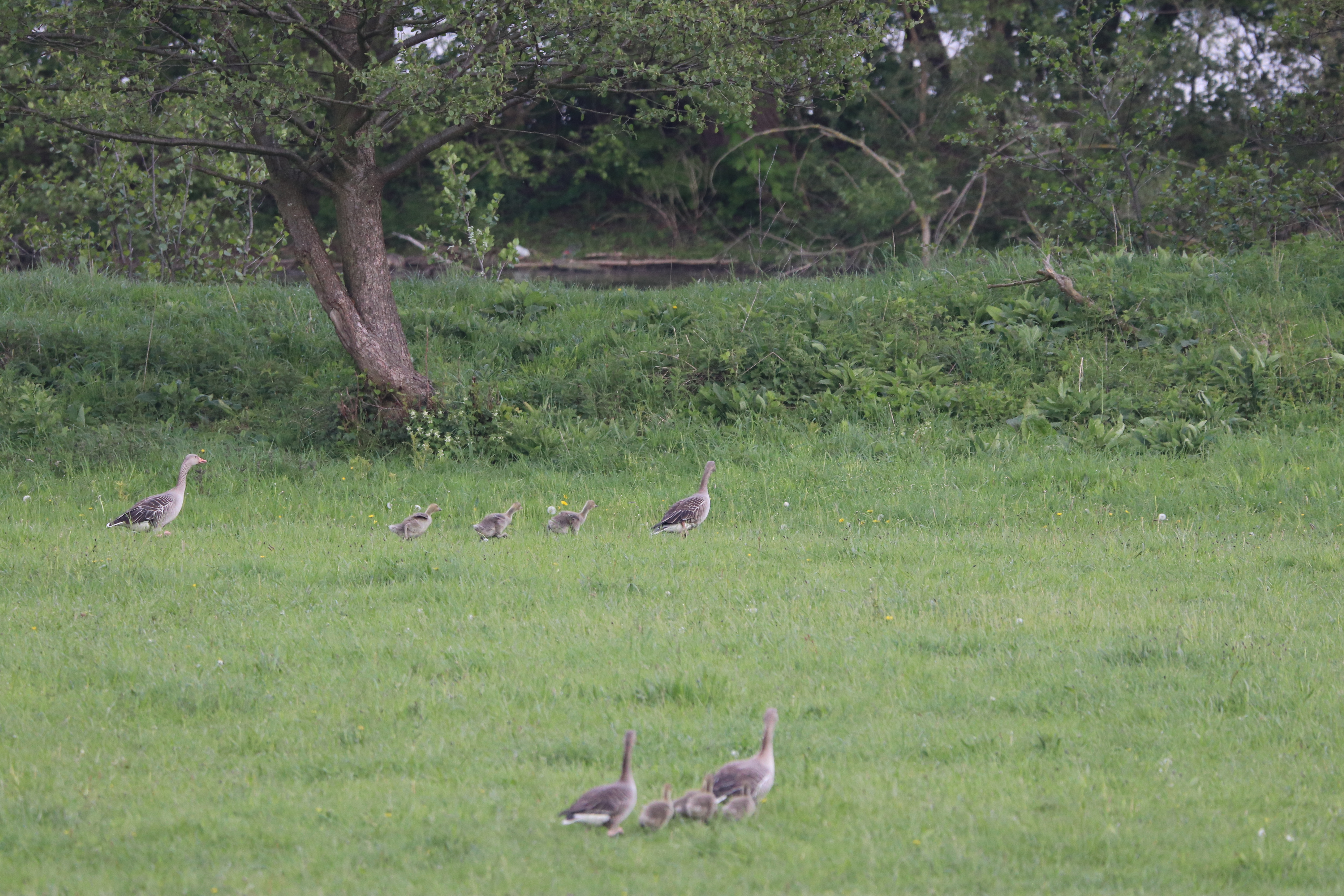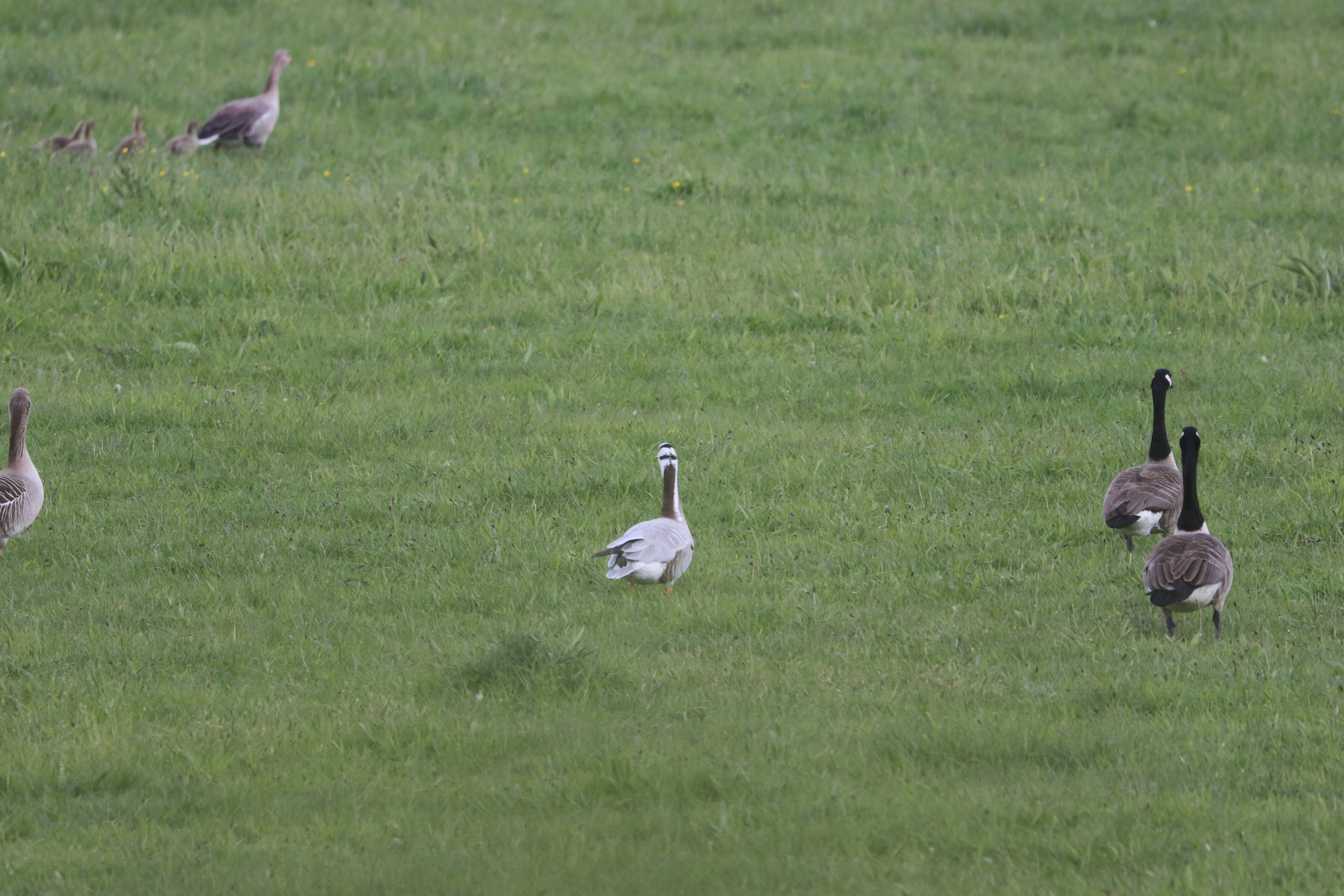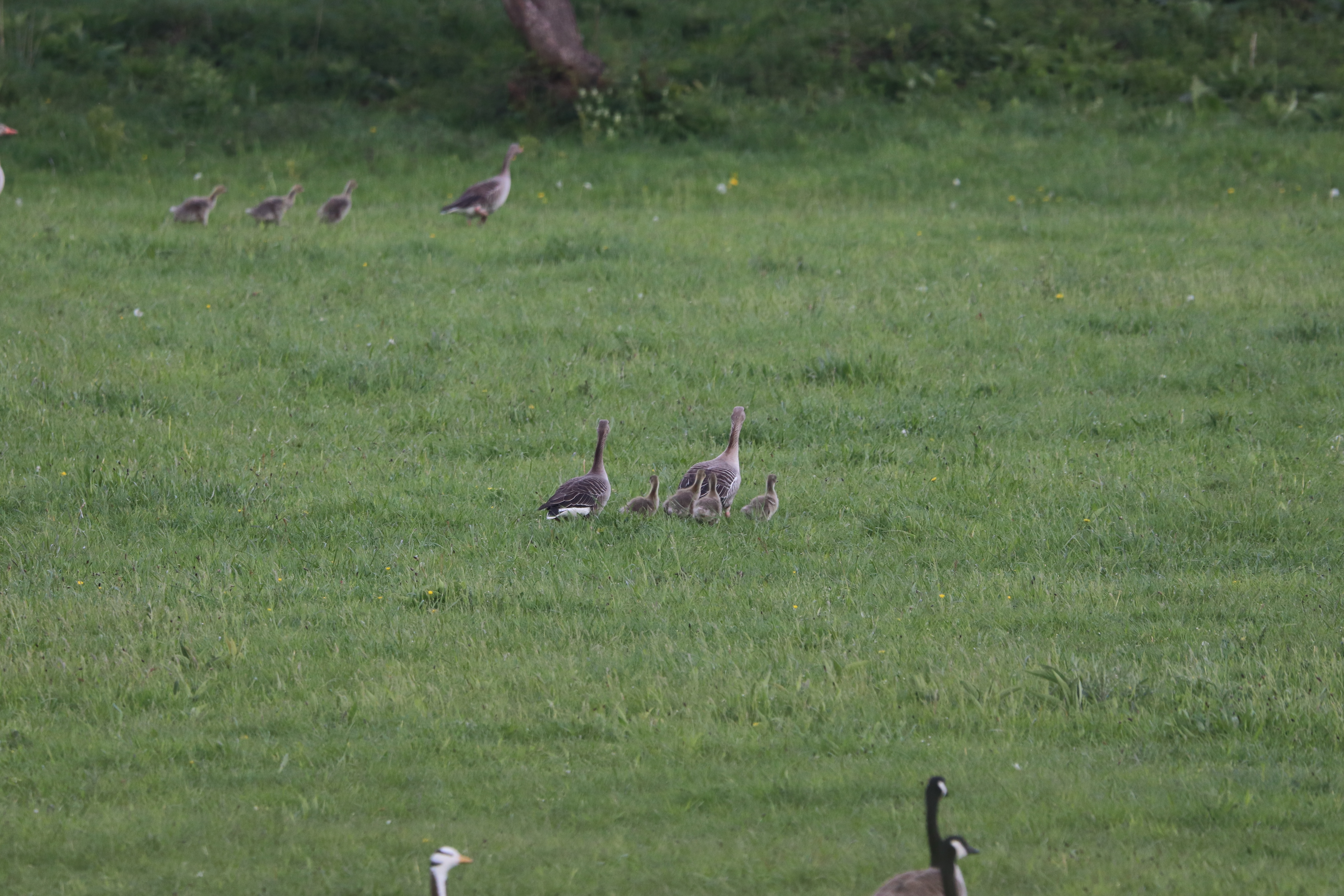 Außerdem gibt es noch viele Gänse an der Kiebitzwiese. Neben den Graugänsen und Kanadagänsen auch eine einzelne Streifengans. Die sich unter die Kanadagänse gemischt hat. Sie ist meine Lieblingsgans. Ein echter Star unter den Vögeln. Siehe auch ==> Die Streifengans