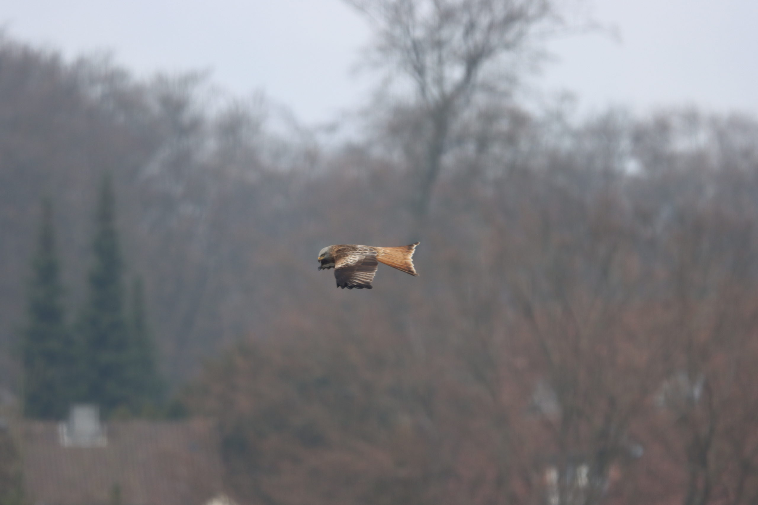 Später konnte ich noch ein anderes Schauspiel am Himmel beobachten. Fünf Mäusebussarde sammelten sich und flogen zusammen über dem Tal. Ob es sich dabei um Balzflüge handelte kann ich nicht sagen. Sie versuchten sich gegenseitig im Flug immer sehr nahe zu kommen, das man denken konnte, sie wollten sich berühren. Da einige Mäusebussarde kleiner wirkten, könnte es sich aber vielleicht auch um eine Familie gehandelt haben. Ein Paar mit drei Jungvögeln aus dem letzten Jahr wäre anhand der Größenverhältnisse durchaus möglich gewesen.