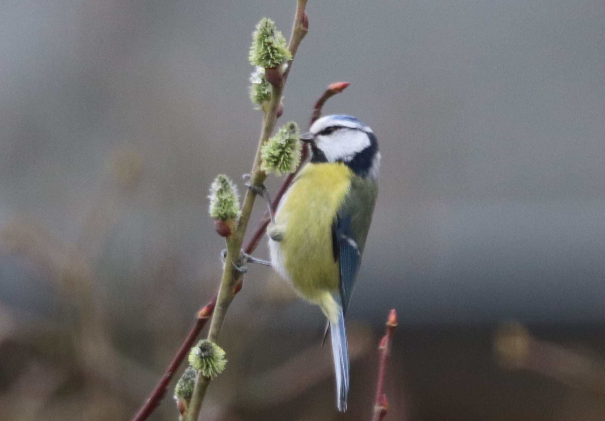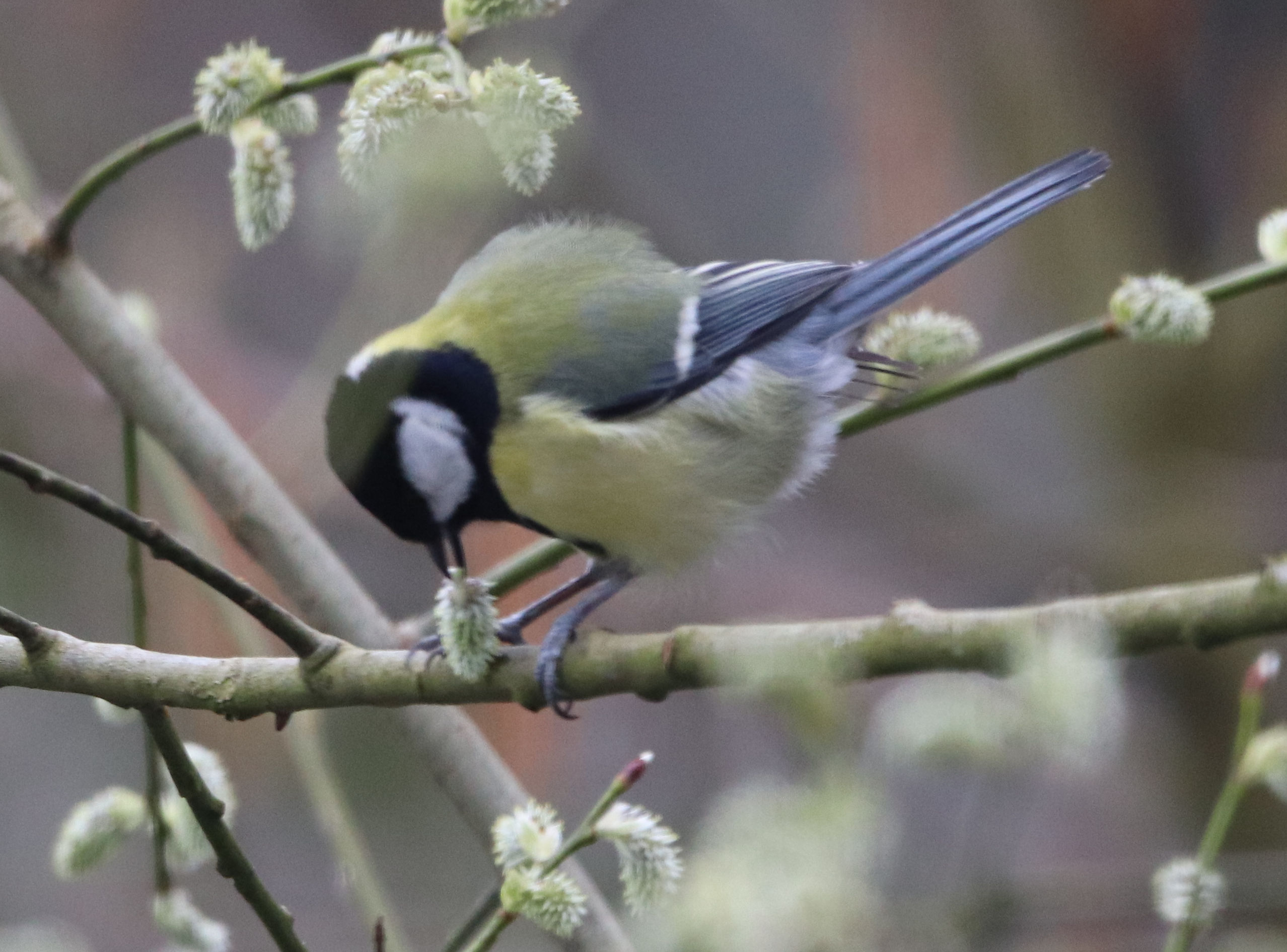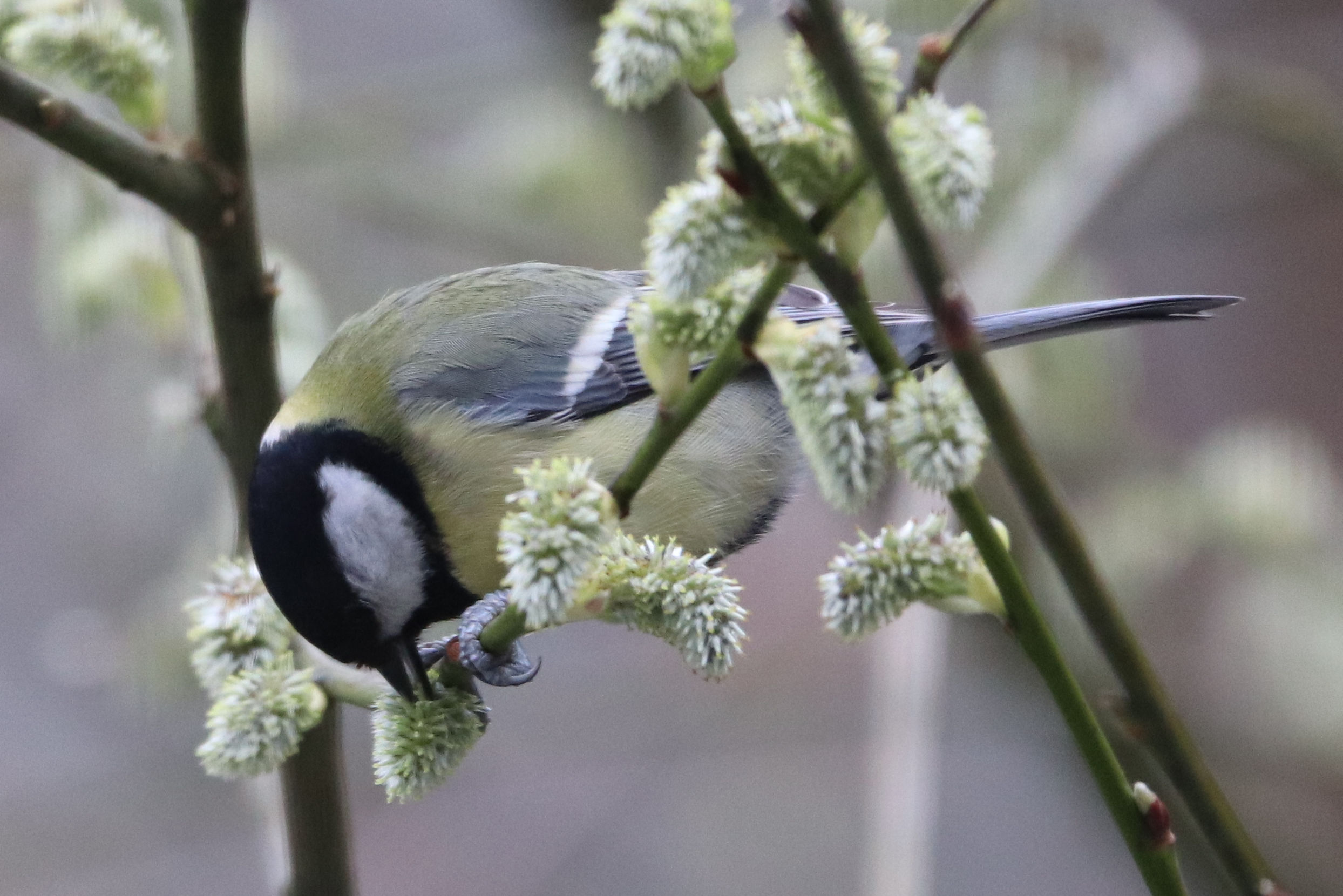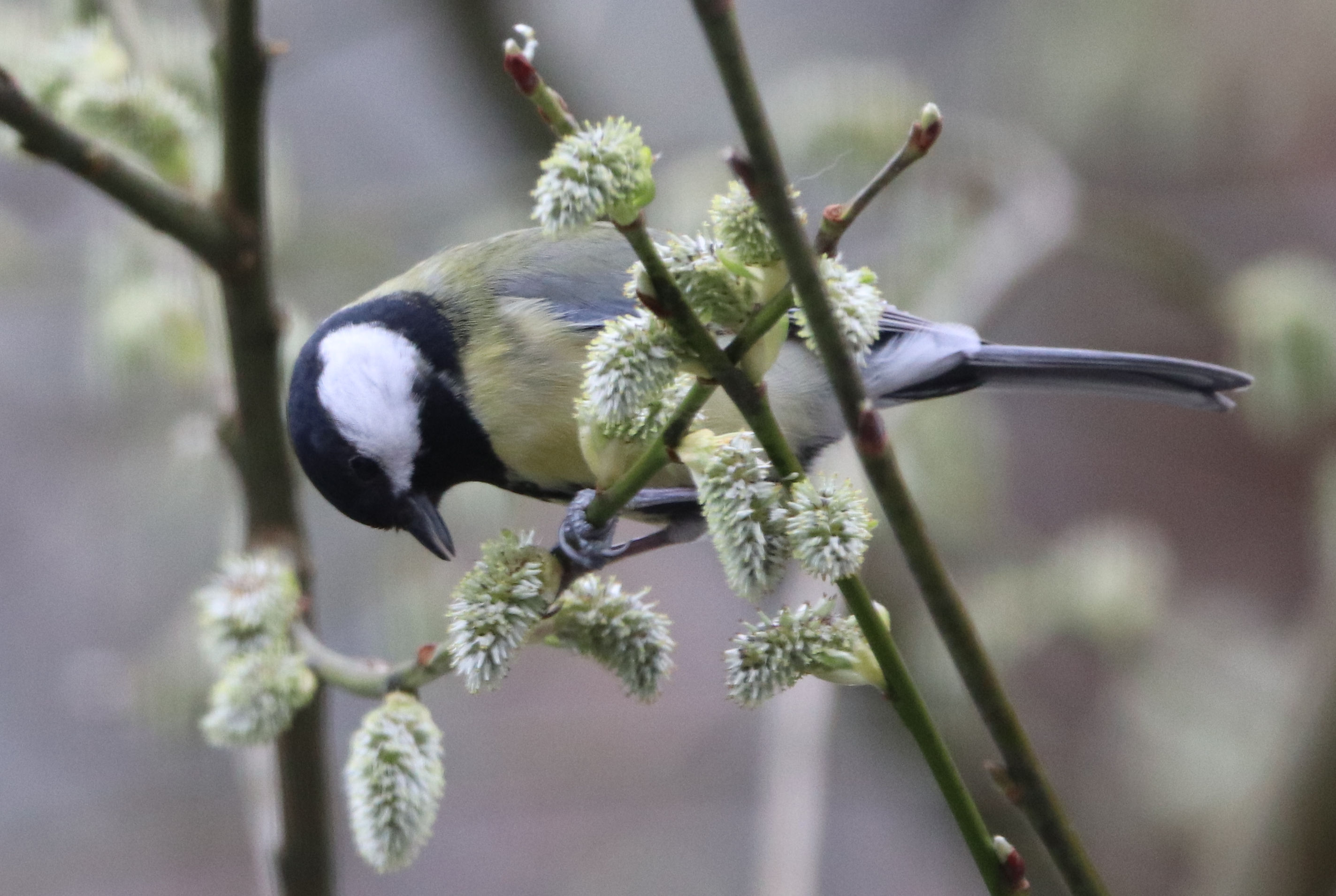 Die Meisen scheinen die Weidenkätzchen als Nahrungsquelle zu sehen. Das habe ich vorher noch nie beobachtet.