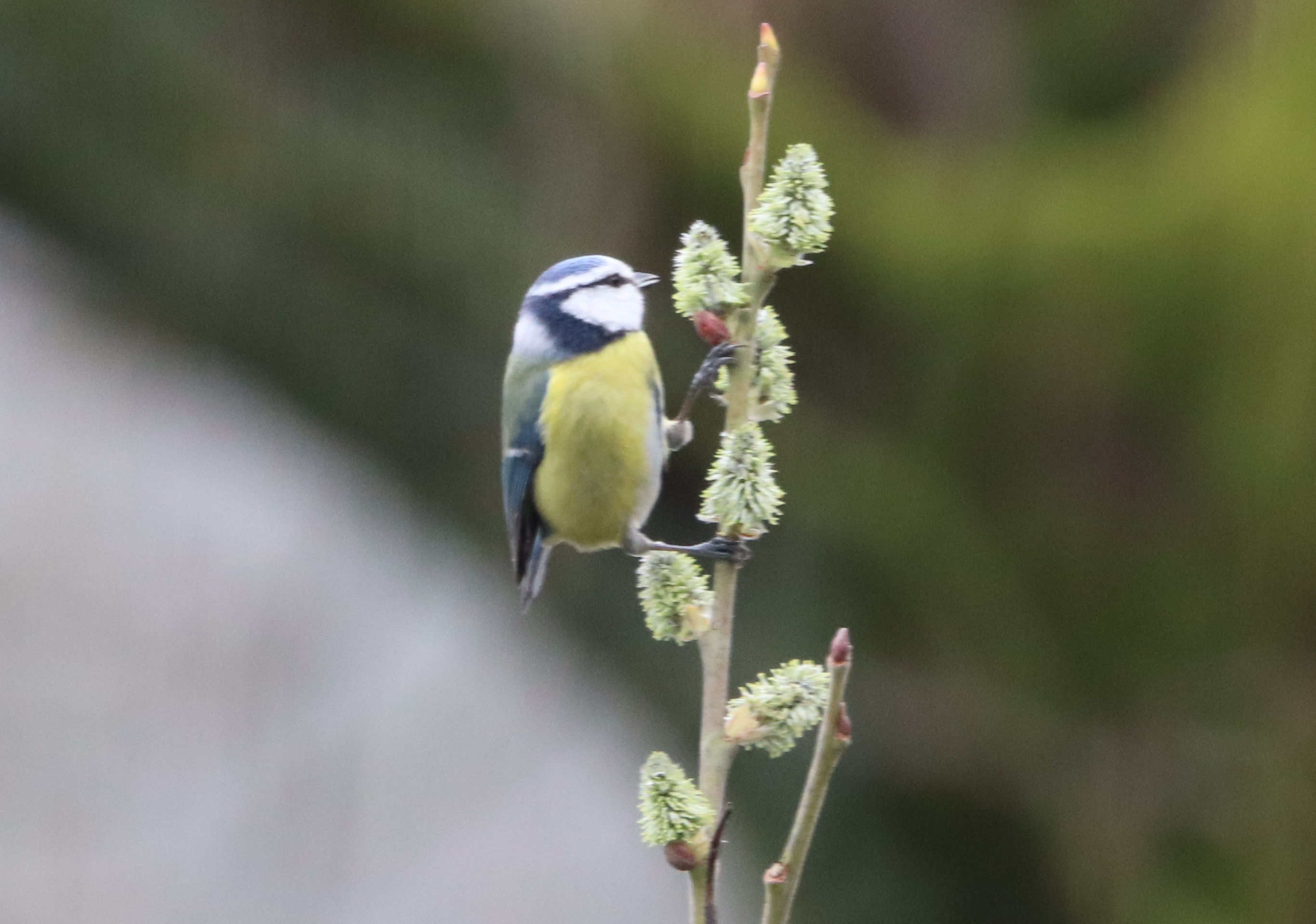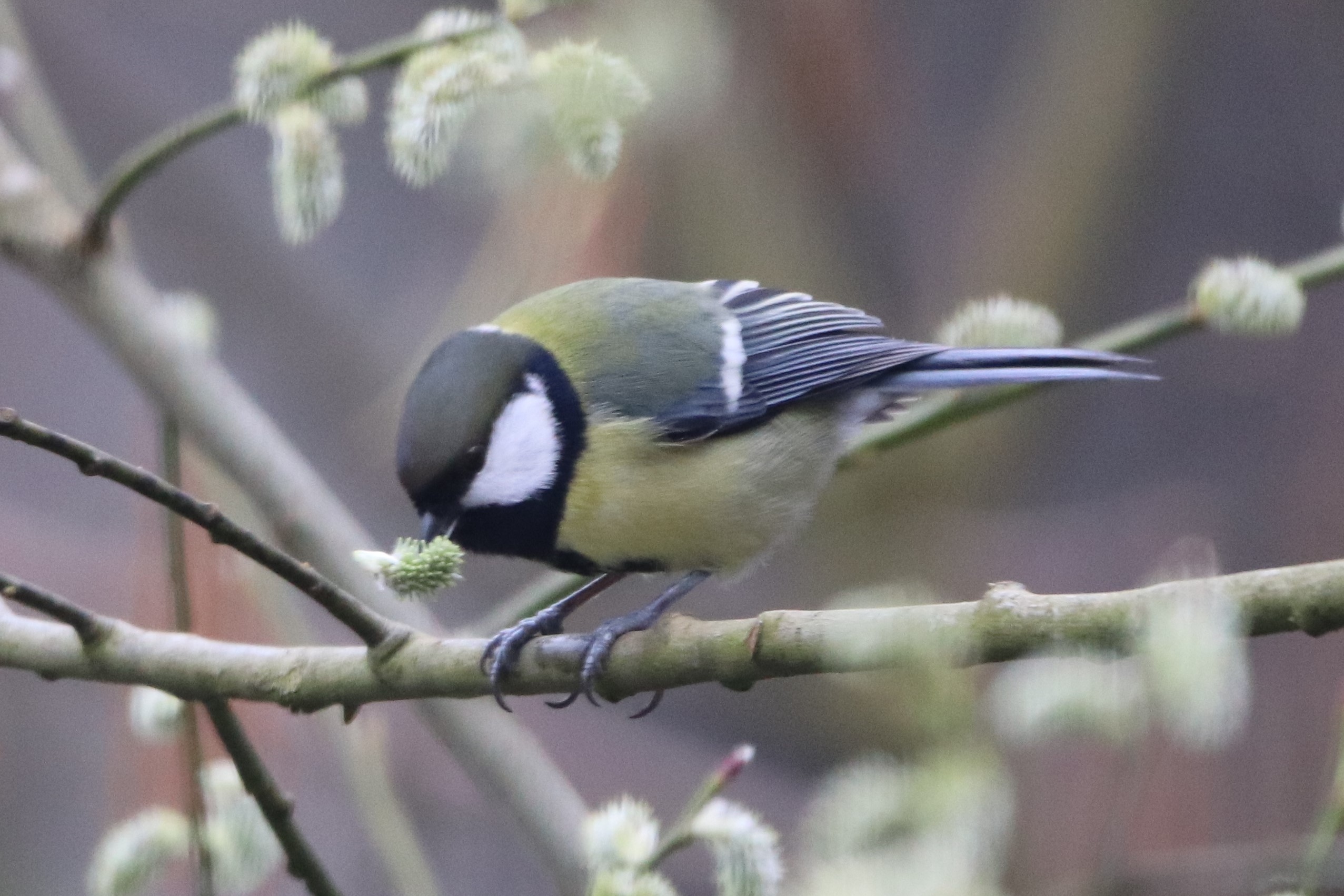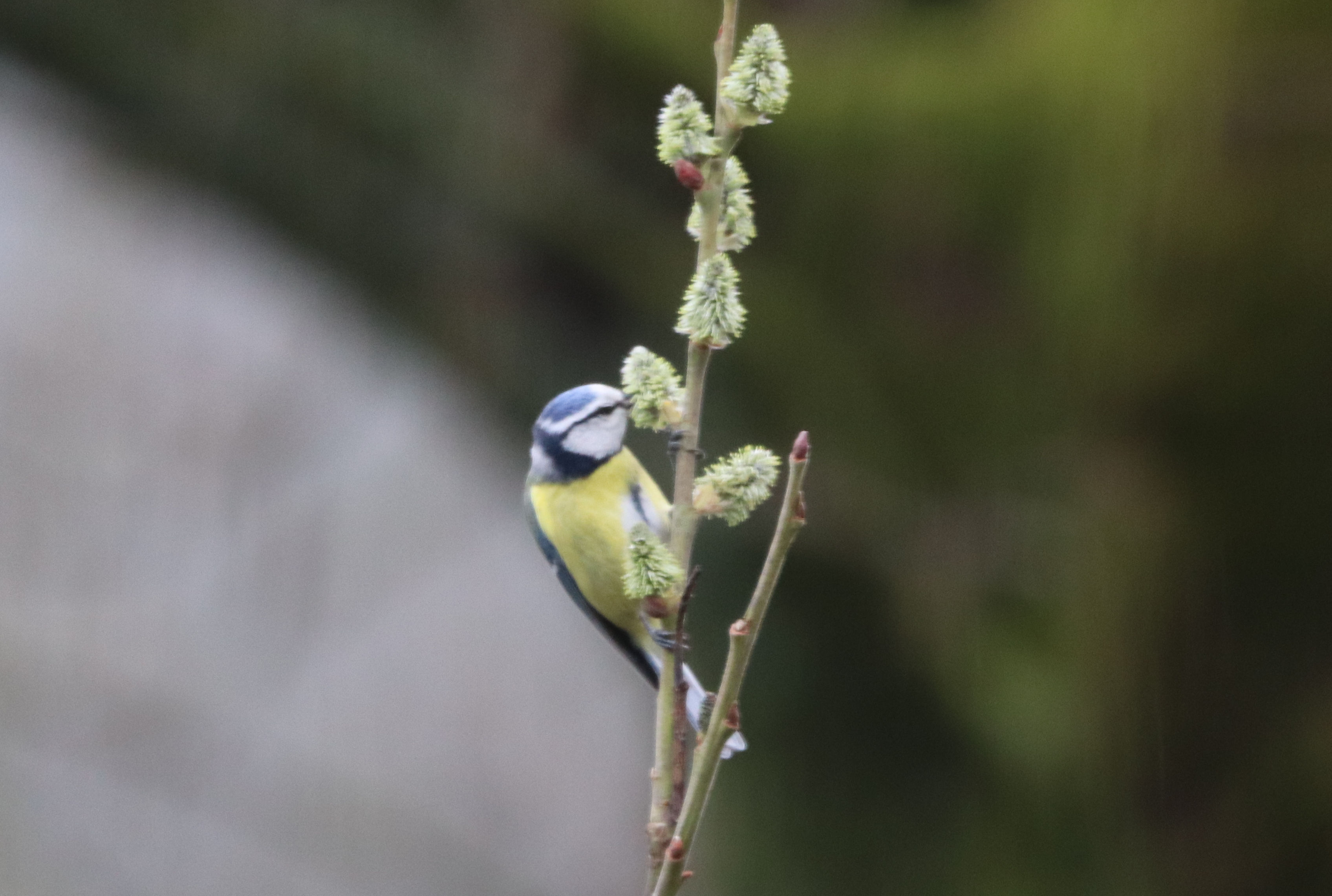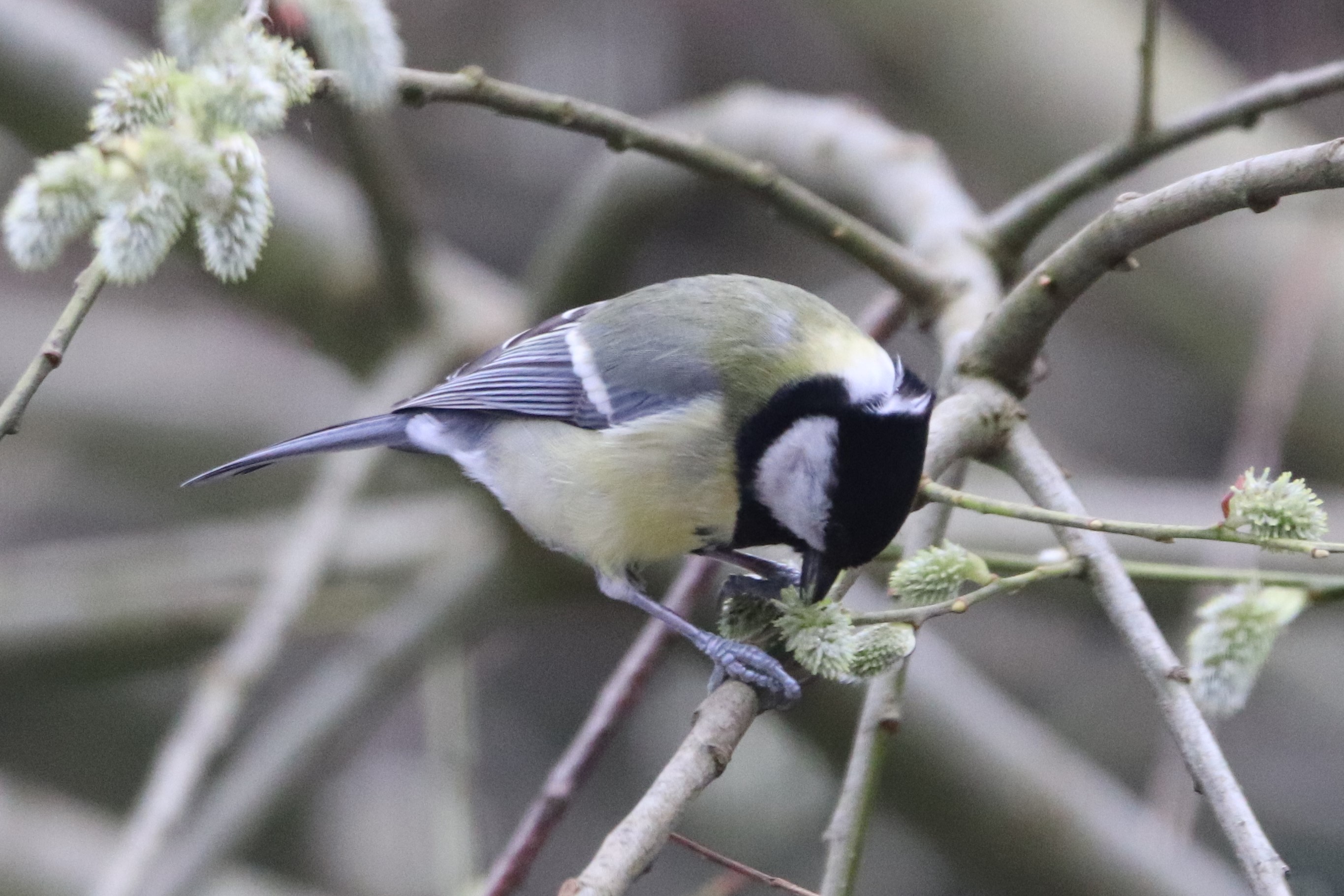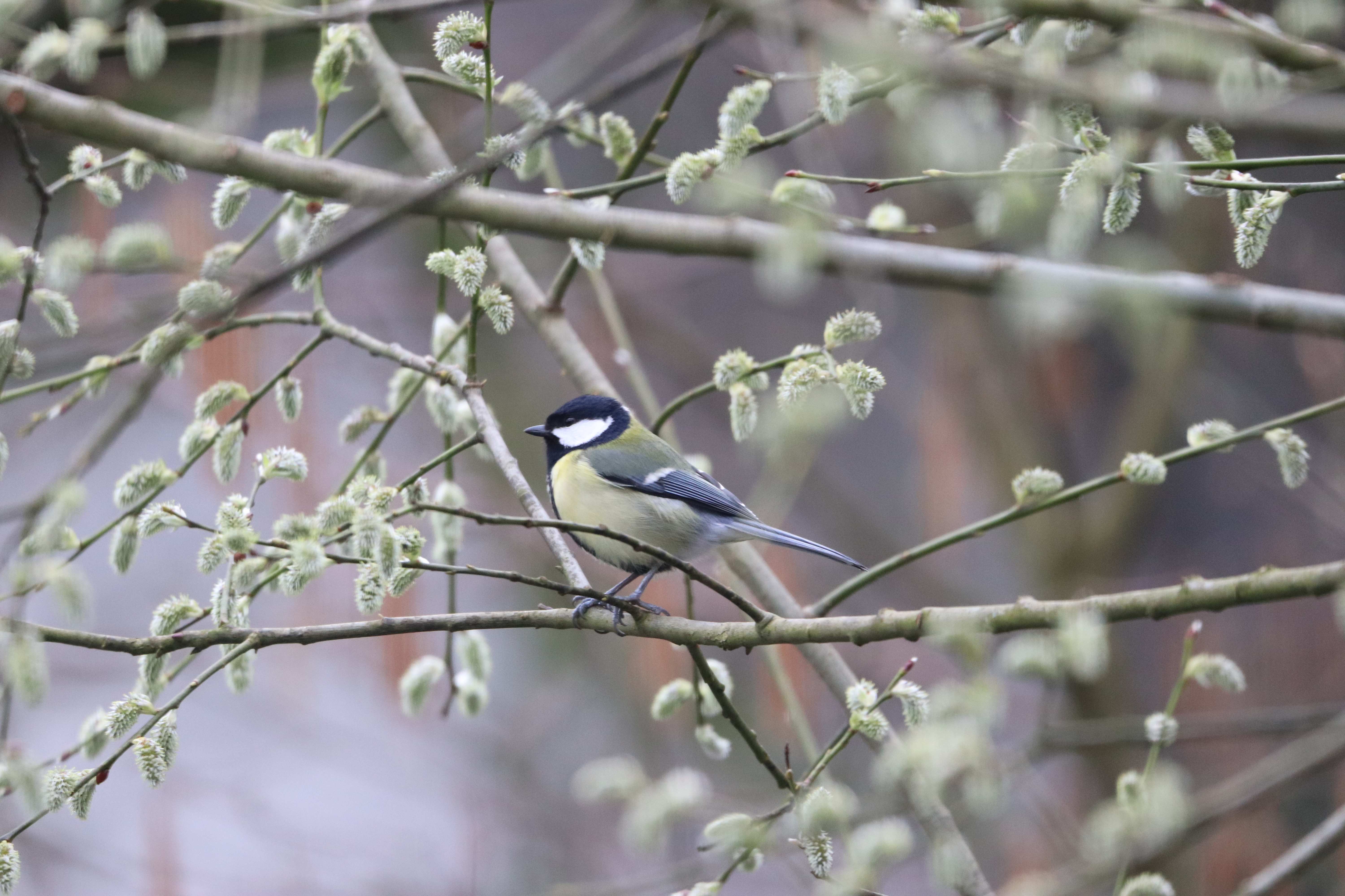 Die Meisen scheinen die Weidenkätzchen als Nahrungsquelle zu sehen. Das habe ich vorher noch nie beobachtet.