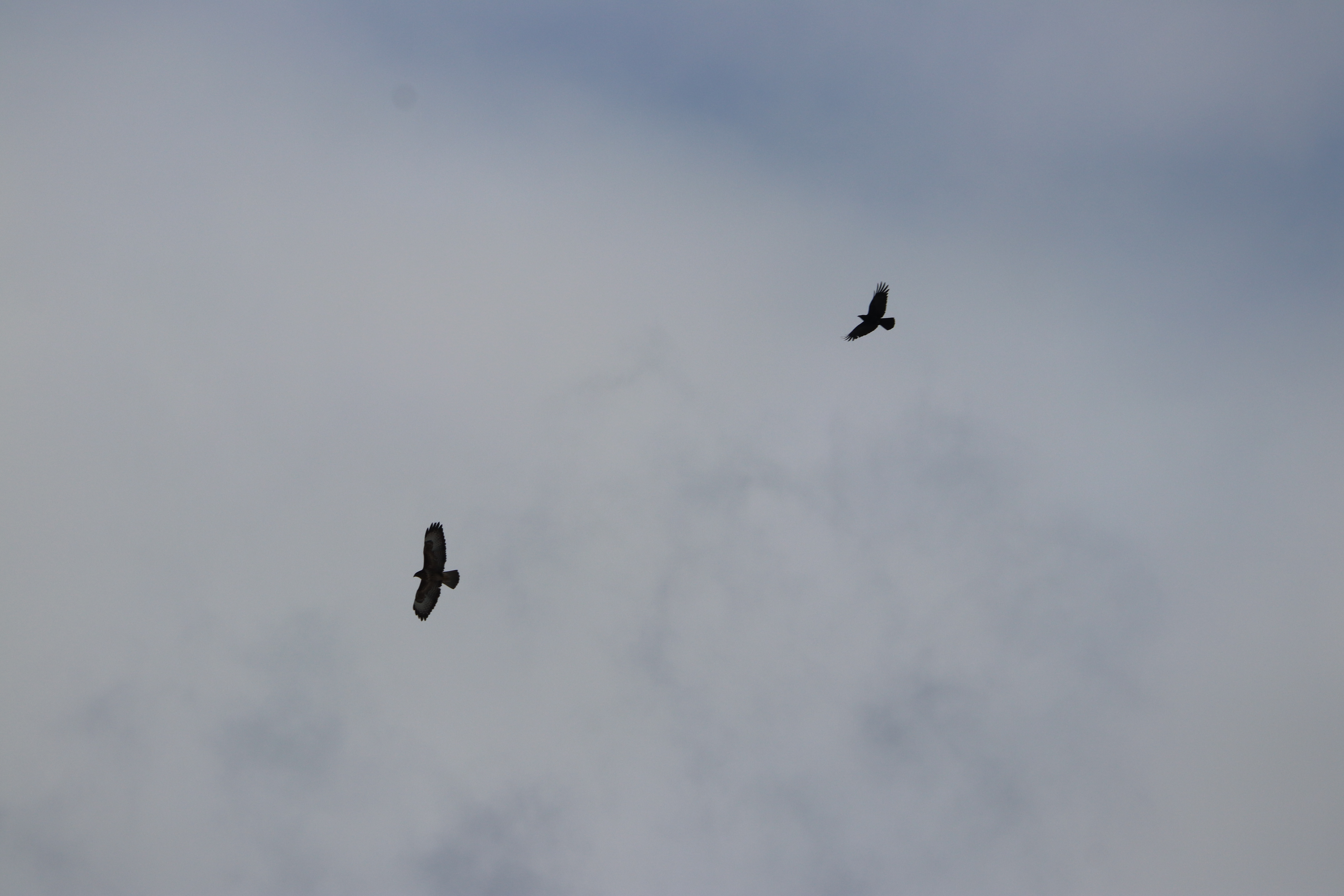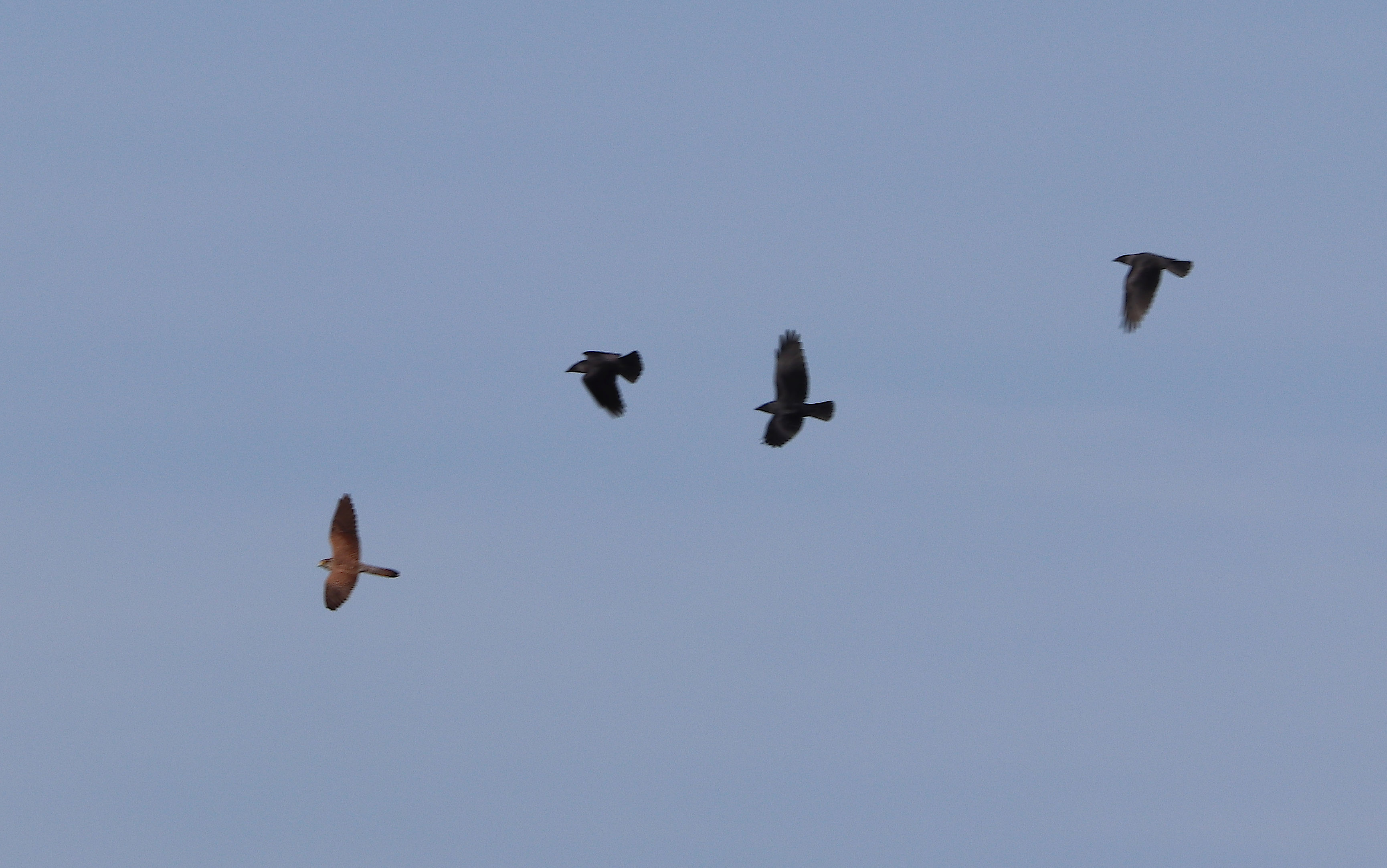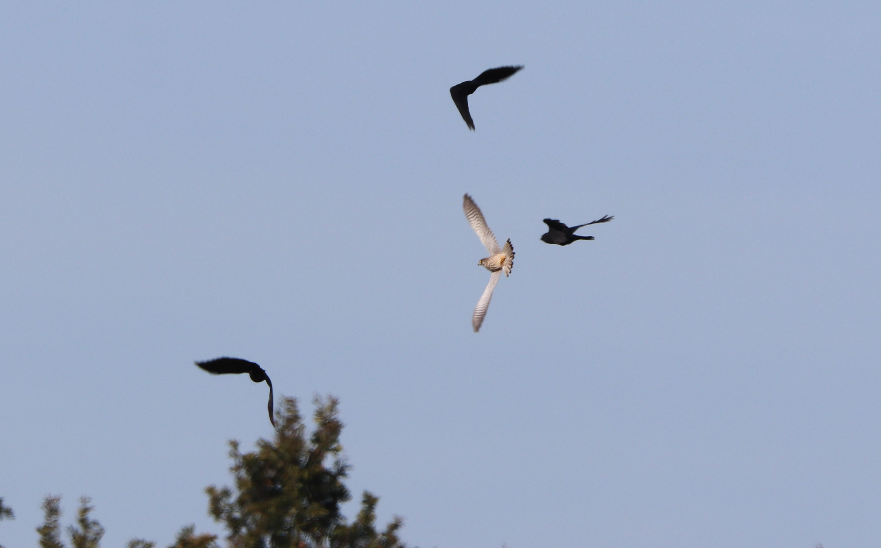 Das tat er solange, bis ihn zwei Rabenkrähen entdeckten und ihn hassten. Sie jagten den Rotmilan so lange, bis er aus dem Tal weit nach oben geflogen war. Die Rabenkrähen können nicht nur zur Beute des Rotmilans werden, sie sind bei Aas auch seine Nahrungskonkurrenten. Und die Rabenkrähen sind um Langenberg sehr verbreitet.