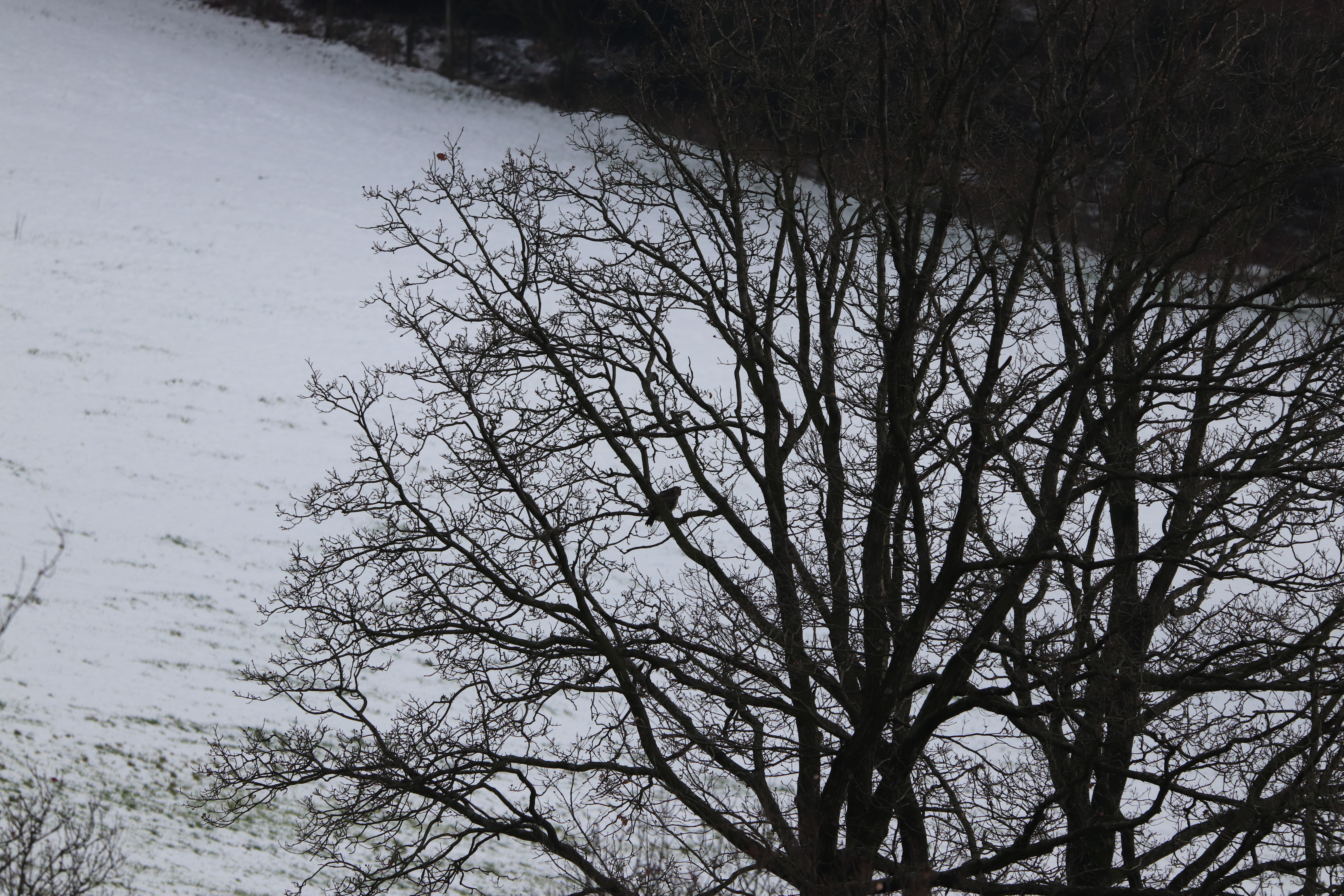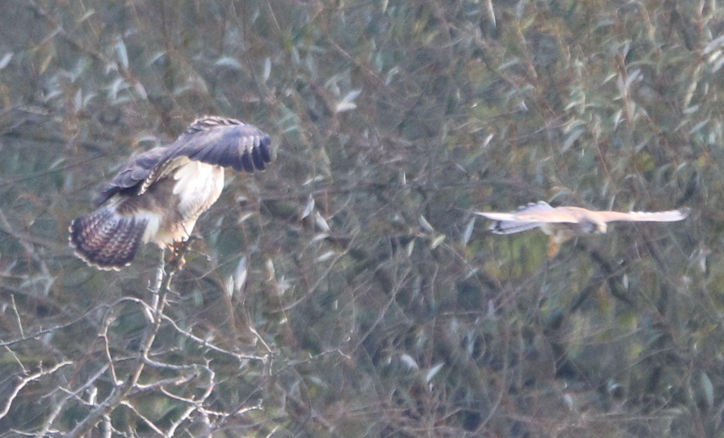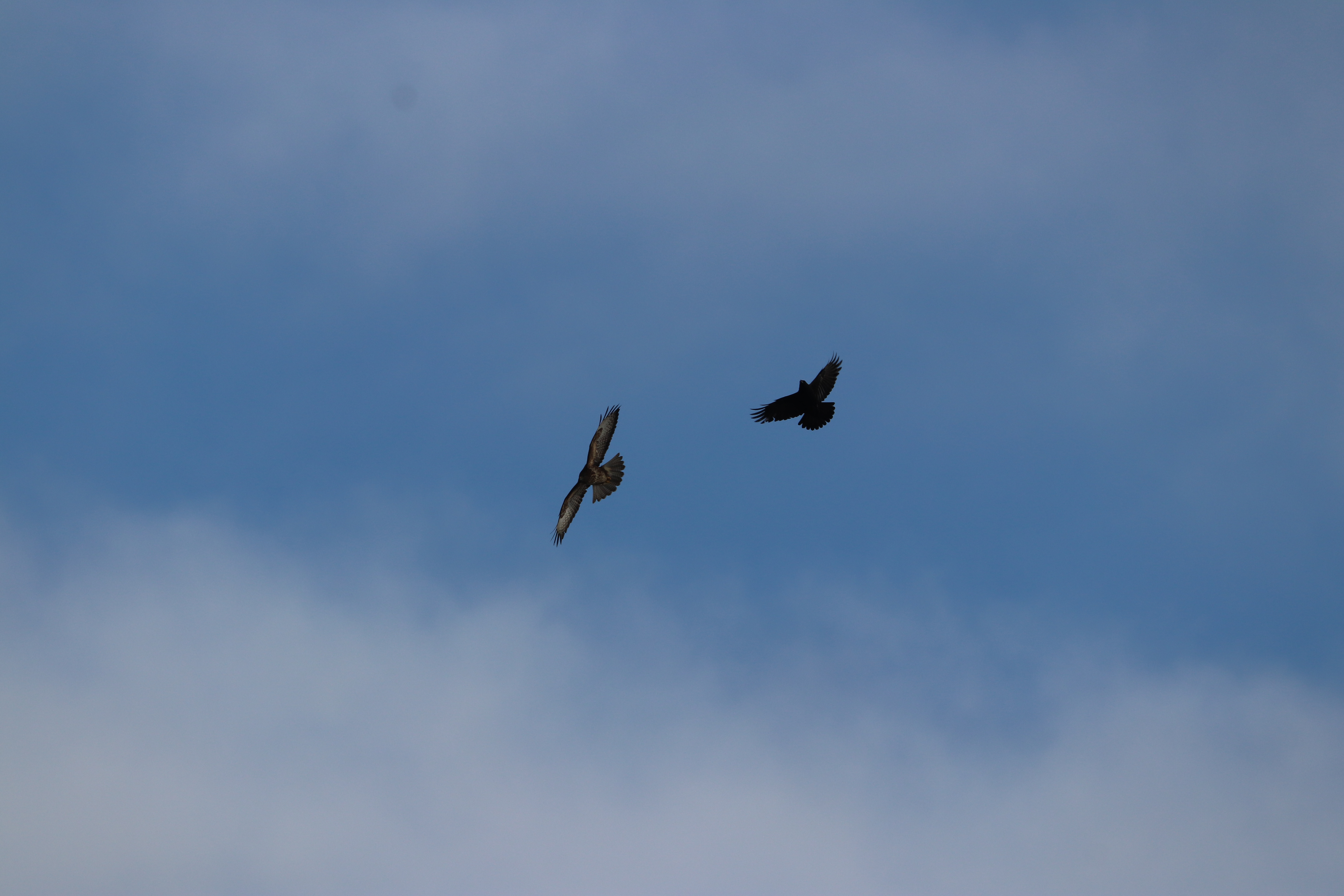 Das tat er solange, bis ihn zwei Rabenkrähen entdeckten und ihn hassten. Sie jagten den Rotmilan so lange, bis er aus dem Tal weit nach oben geflogen war. Die Rabenkrähen können nicht nur zur Beute des Rotmilans werden, sie sind bei Aas auch seine Nahrungskonkurrenten. Und die Rabenkrähen sind um Langenberg sehr verbreitet.