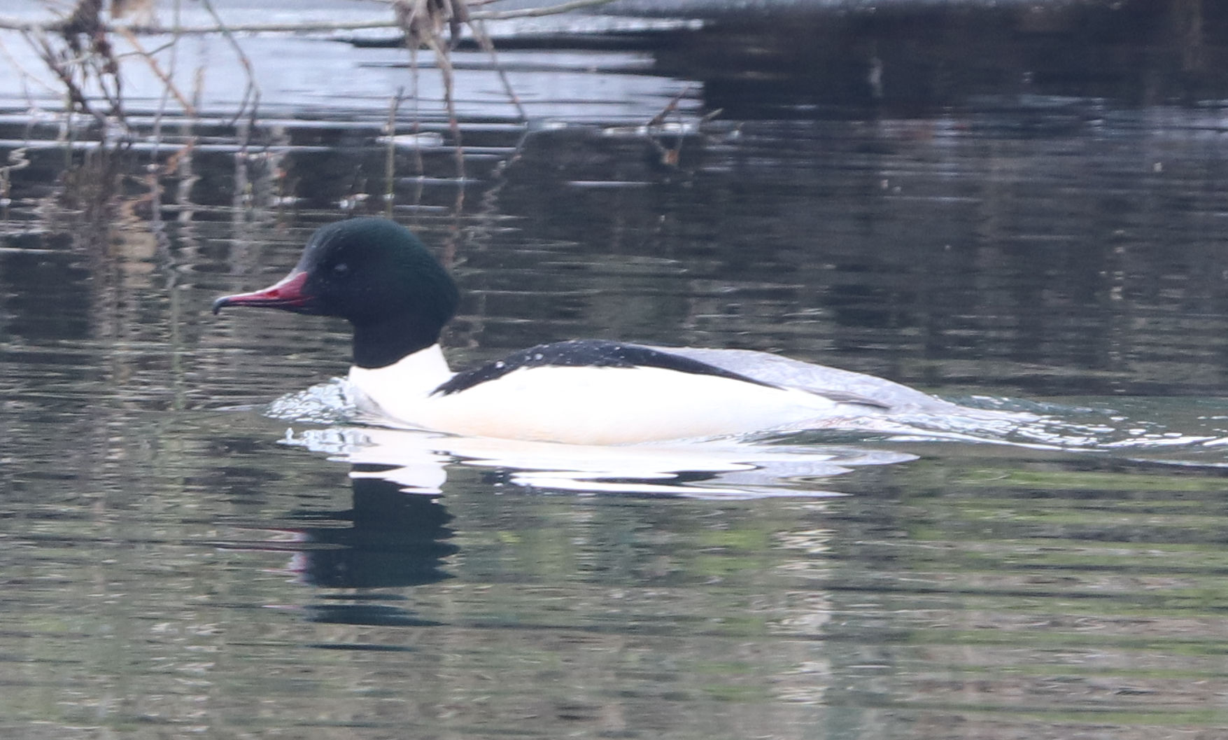 Aber nebenan an der Rammbachmündung war die Ruhr überraschenderweise ein ganzes Stück Eisfrei. Nur am Uferrand waren noch Eisflächen. Und sofort sah ich einen männlichen Gänsesäger, der wahrscheinlich als Wintergast an der Ruhr ist. Ein Stück weiter schwamm ein Rostgans-Paar und auch einige Reiherenten waren wieder zu sehen.