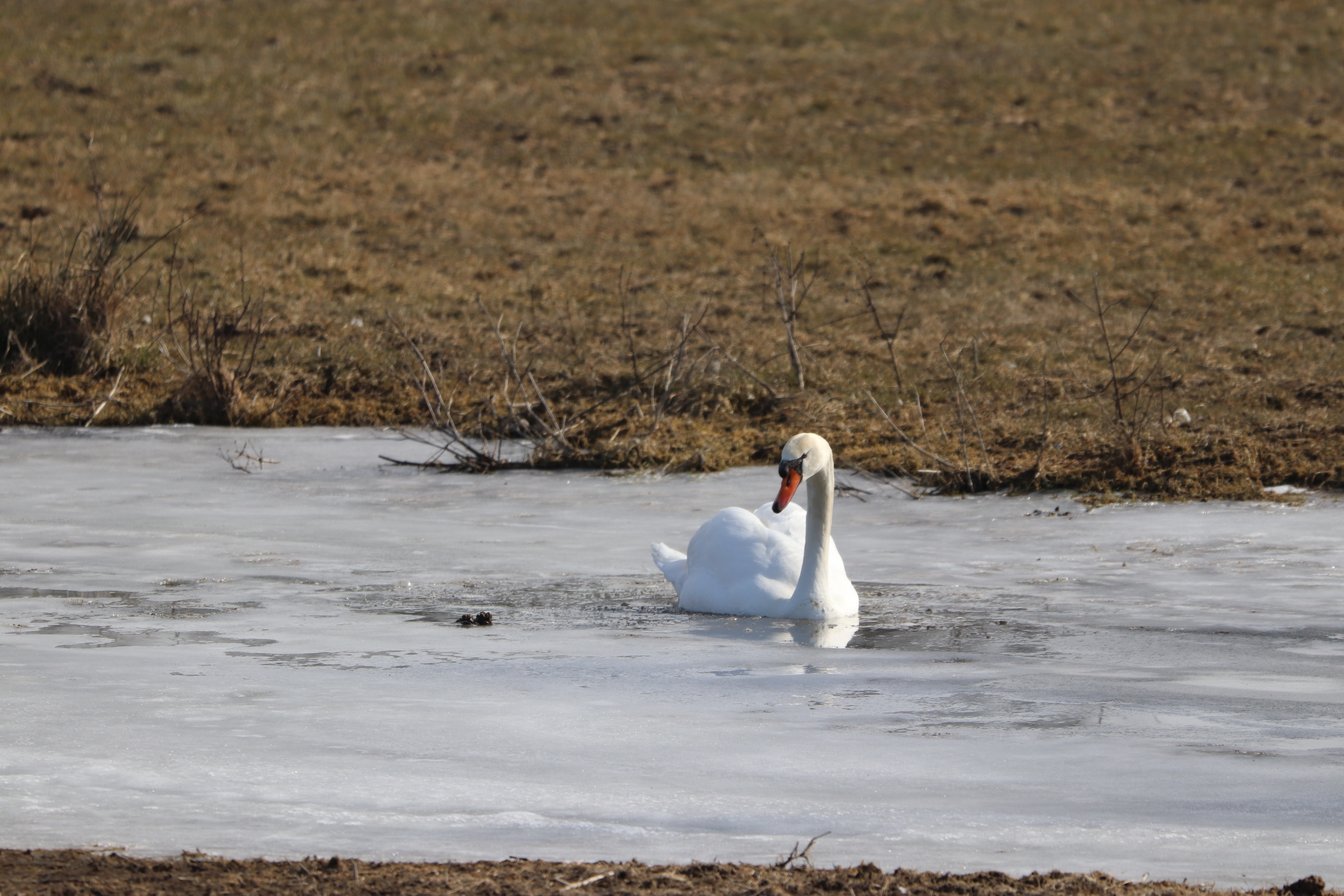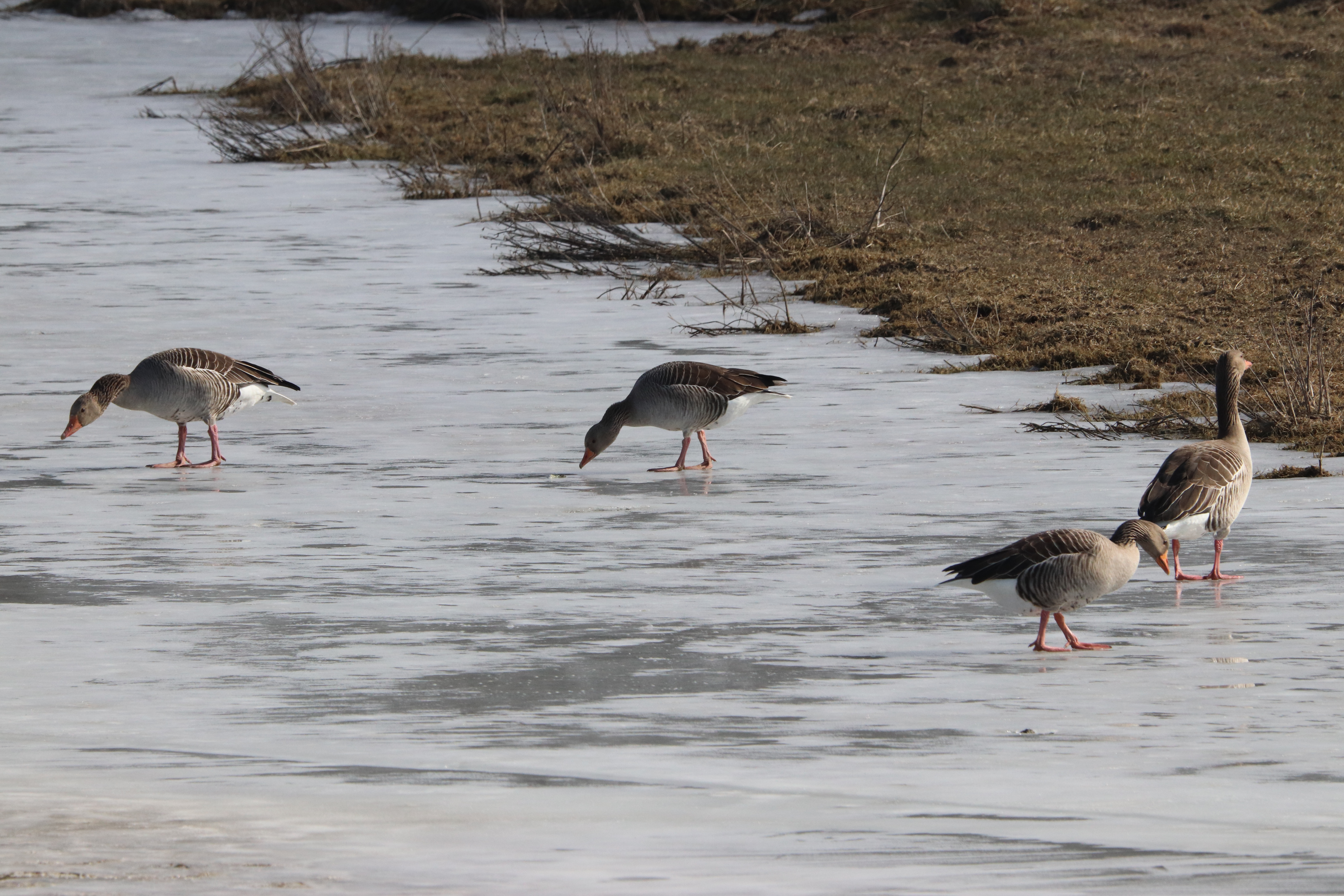 Zurück an der Kiebitzwiese liefen mittlerweile ein paar Graugänse über das Eis und die Höckerschwäne waren aufgewacht. Es war ja auch schon Mittag.