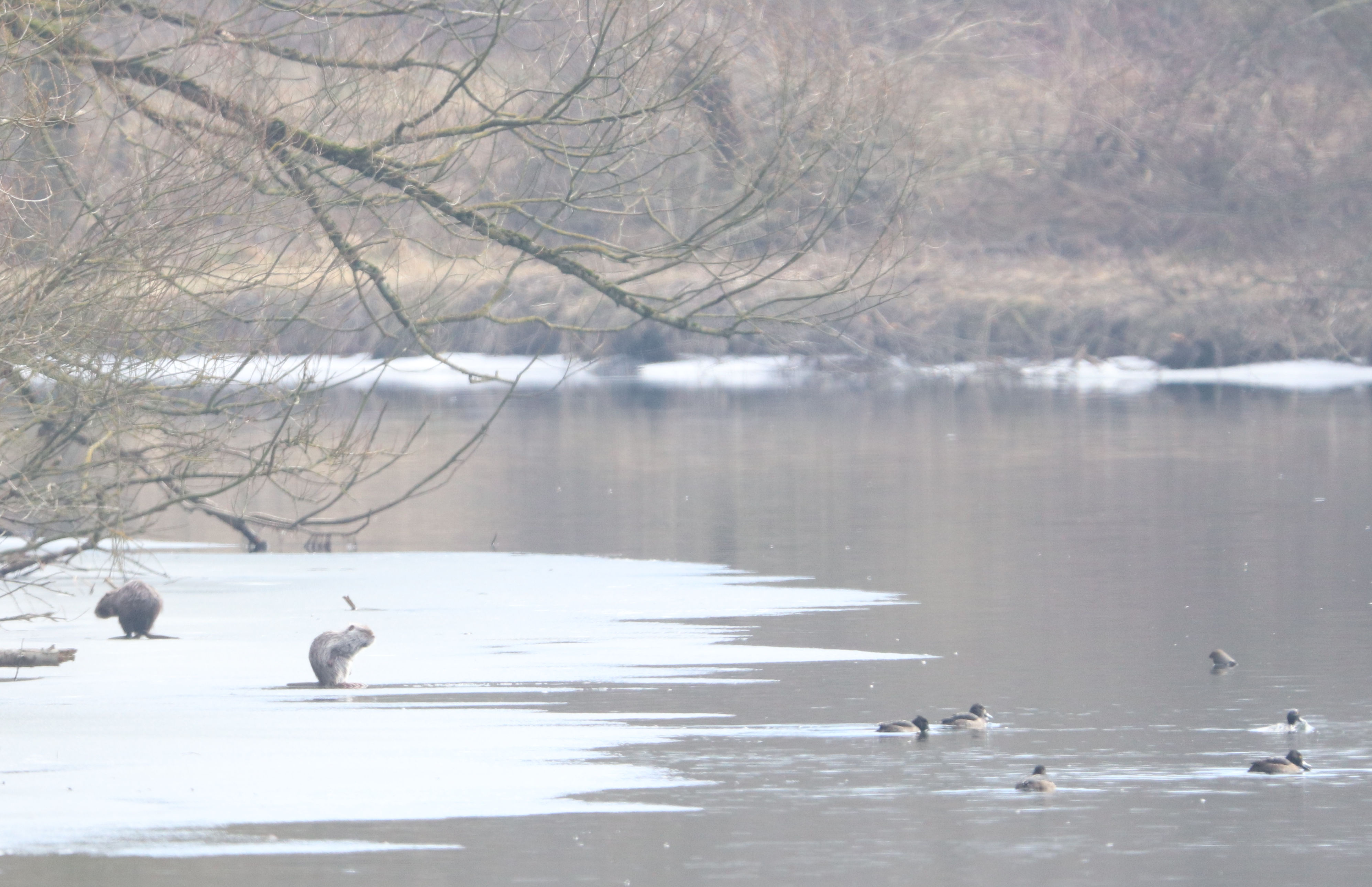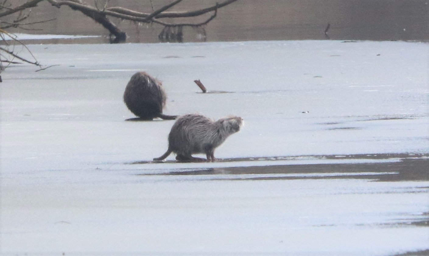 Auf einer Eisfläche entdeckte ich dann noch zwei Nutrias. Das weiße und braune Nutria von der Kiebitzwiese. Beitrag Nutrias