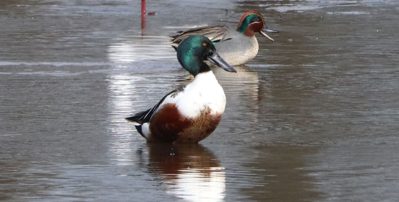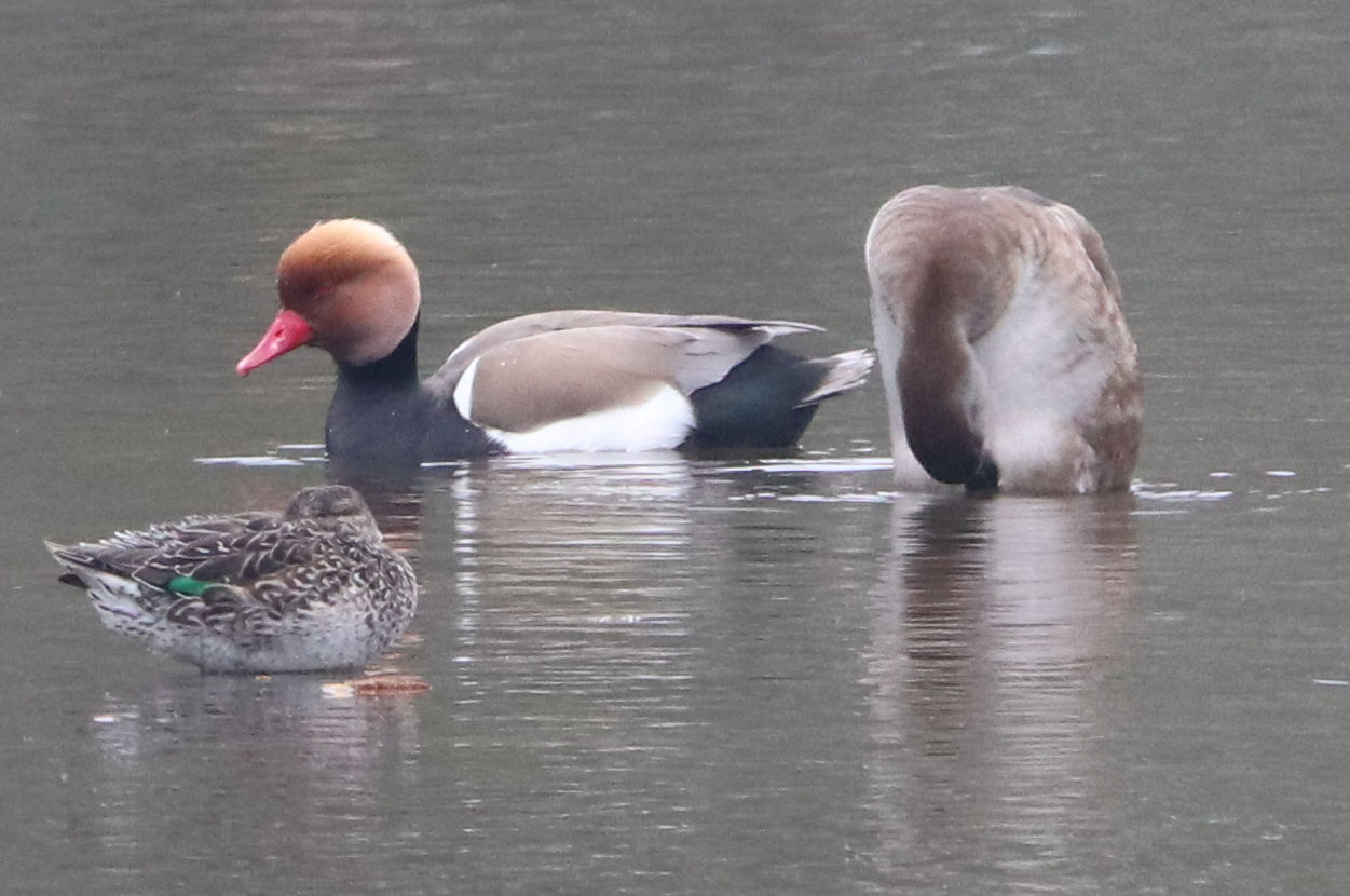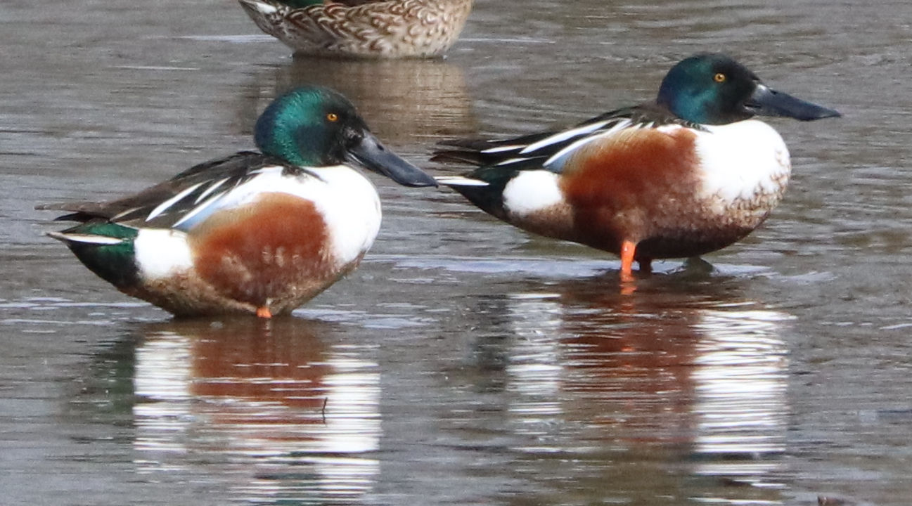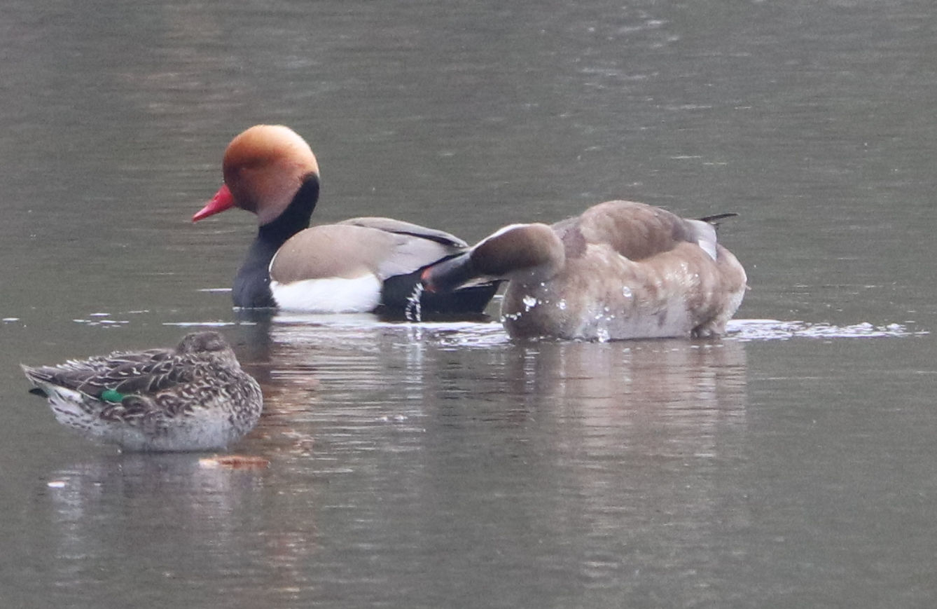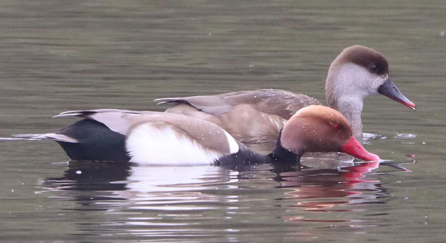 - Zwei Männchen vom letzten Jahr. Ein weiteres Kolbenenten-Paar ist noch in den Rieselfeldern, ich konnte es am Samstag aber nicht sehen. Ein weiteres Paar wurde am Sonntag in der Disselmersch an der Lippe gesehen. Vielleicht das dritte Paar, das weiter gezogen ist.