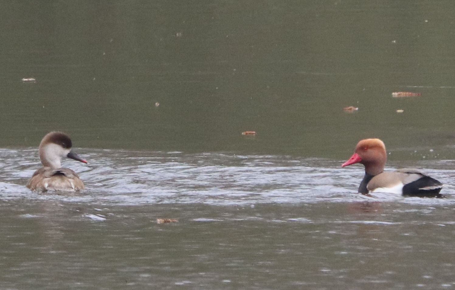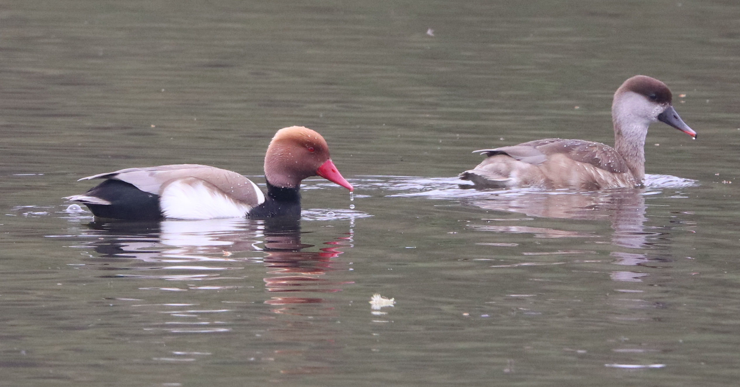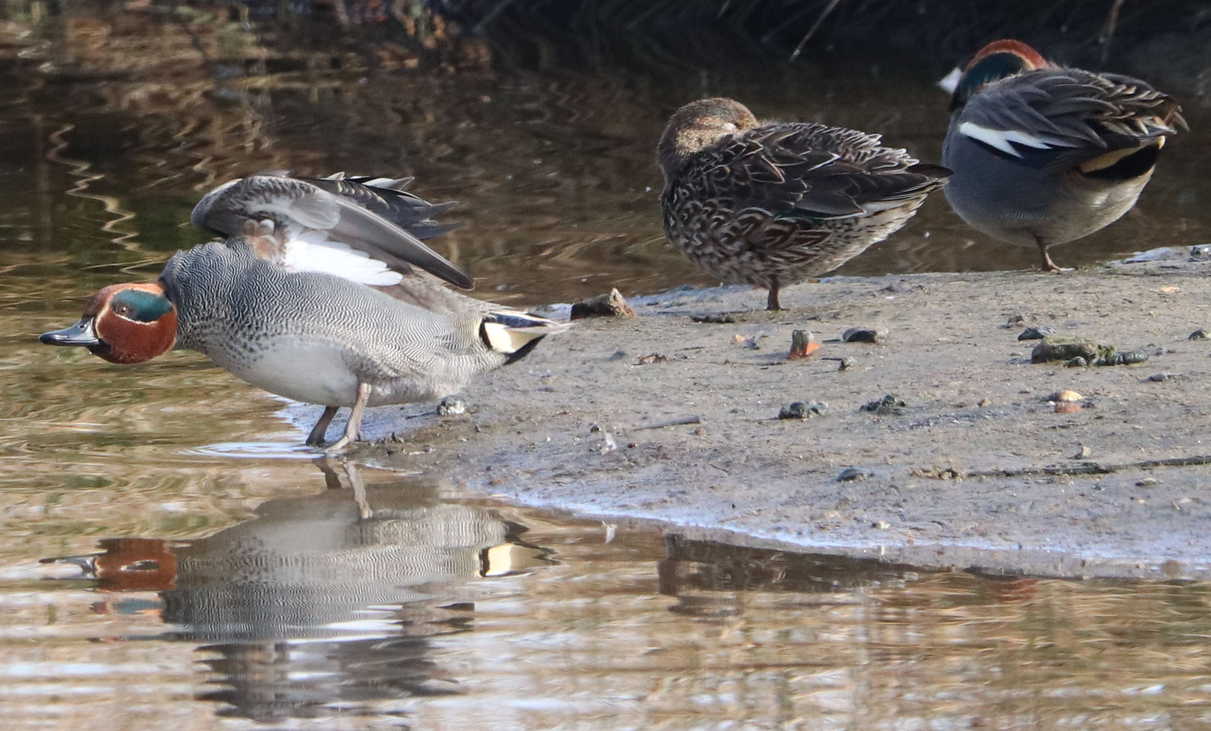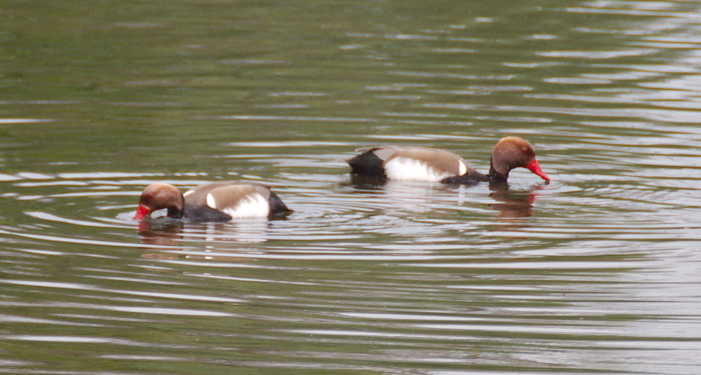 - Zwei Männchen vom letzten Jahr. Ein weiteres Kolbenenten-Paar ist noch in den Rieselfeldern, ich konnte es am Samstag aber nicht sehen. Ein weiteres Paar wurde am Sonntag in der Disselmersch an der Lippe gesehen. Vielleicht das dritte Paar, das weiter gezogen ist.