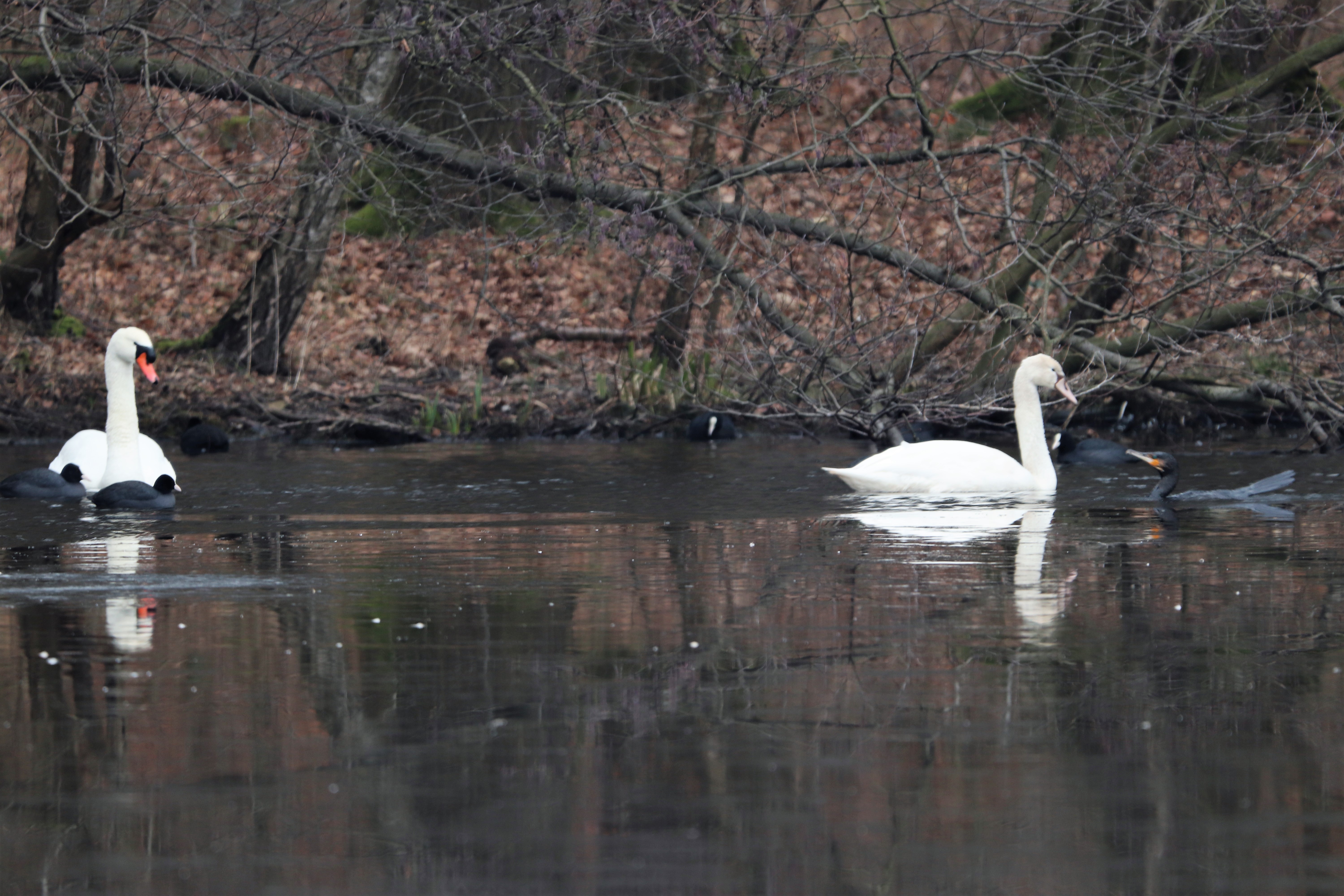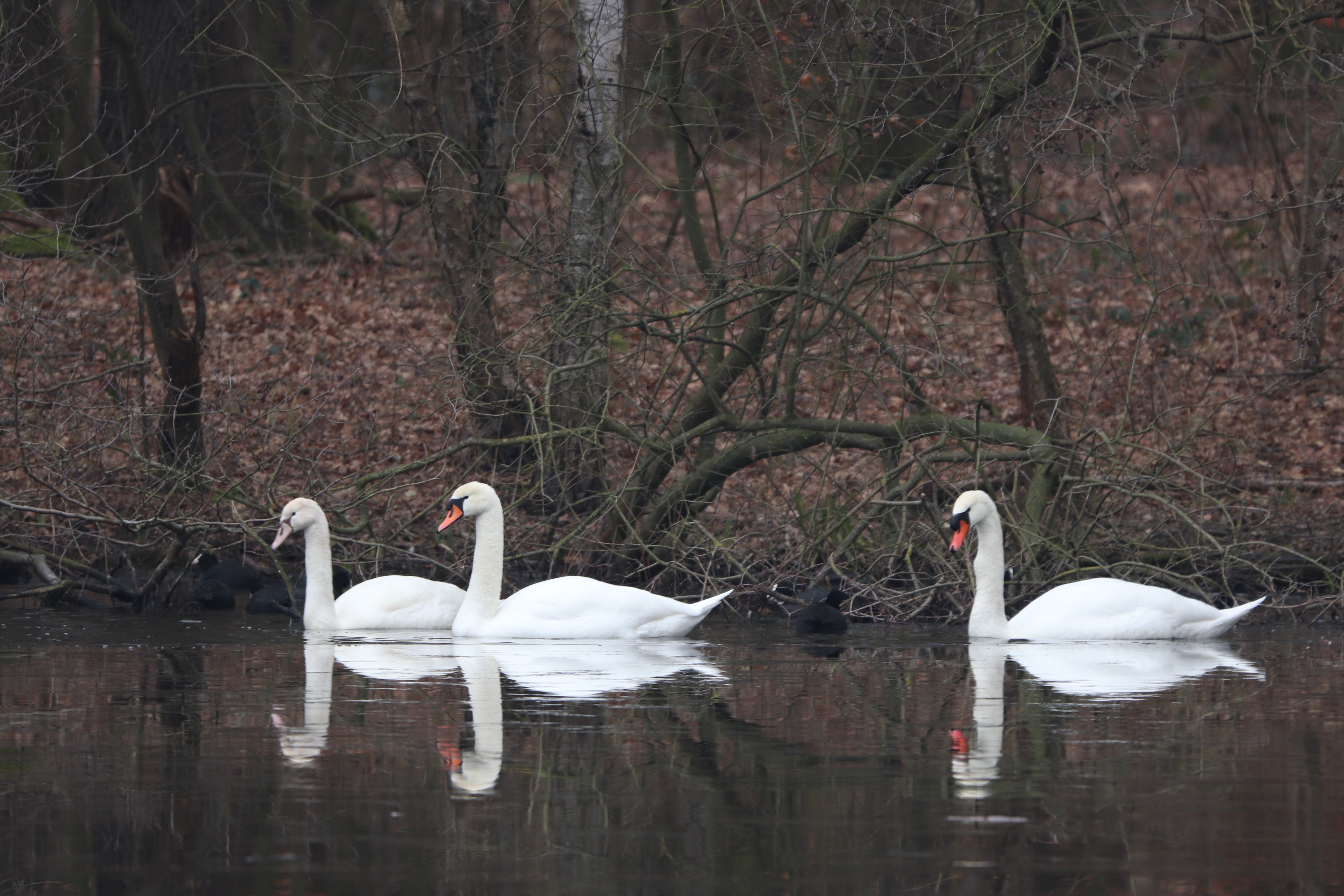 Auch die anderen Vögel, die ich beim letzten Mal gesehen habe, waren nicht da. Die quirligen Schwanzmeisen, der Gimpel, der Schwarm der Erlen- und Birkenzeisige. Nur die Schwanenfamilie und die Bläßhühner auf dem Beversee. Die Schwanenfamilie ist im Zusammenspiel mit der Eisfläche einfach wunderschön. Deshalb gibt es in den nächsten Tagen einen eigenen Beitrag dazu.