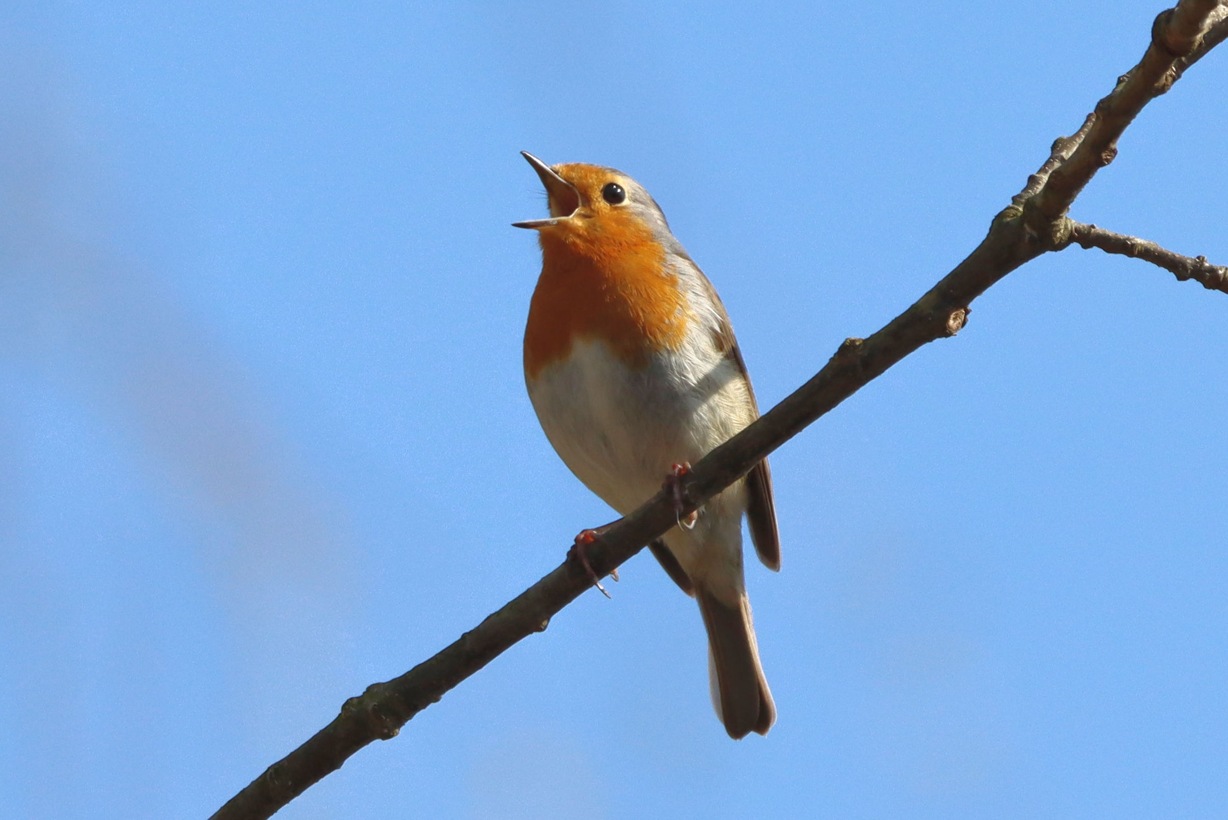 - Das Rotkehlchen singt aus voller Kehle