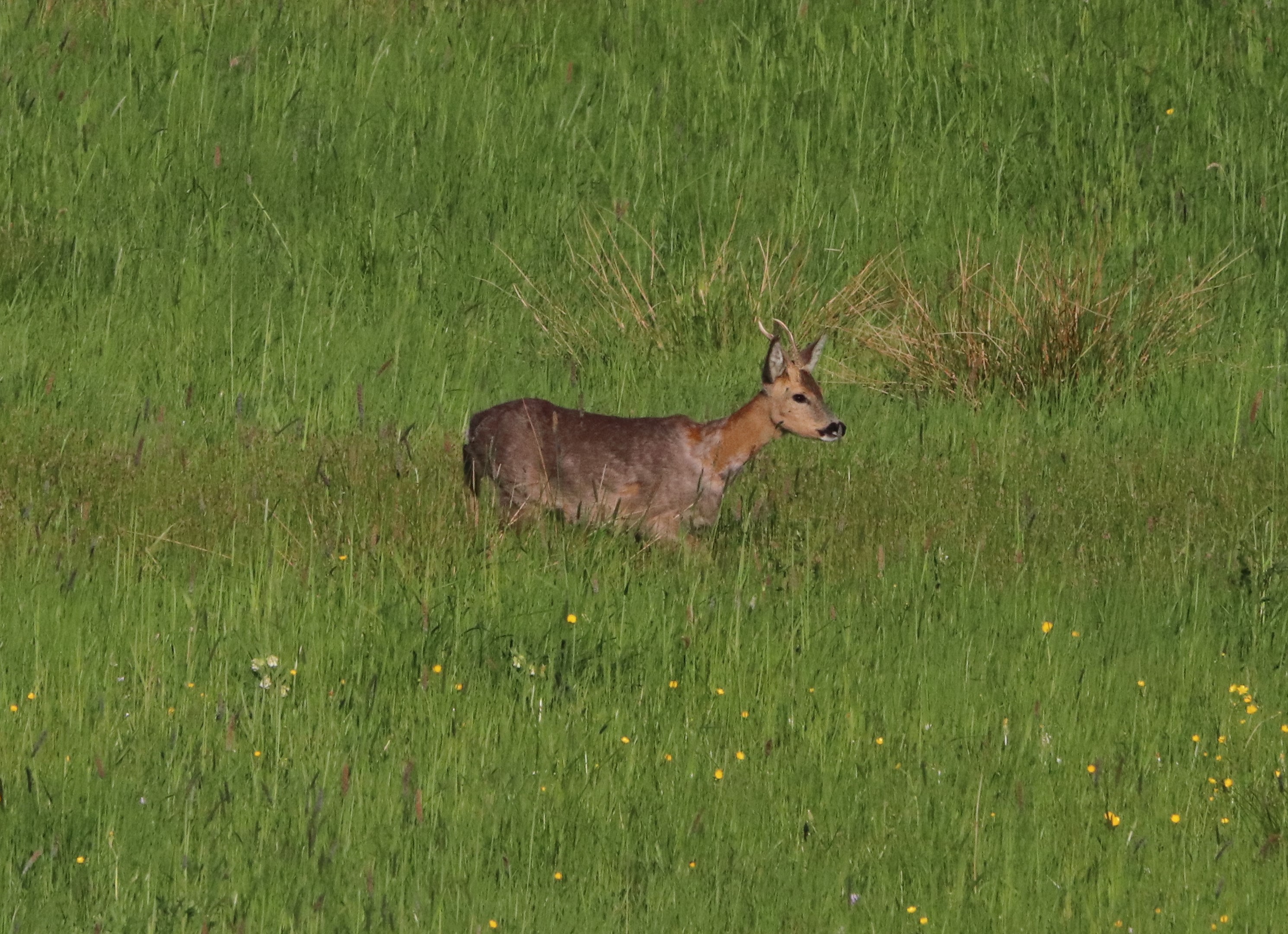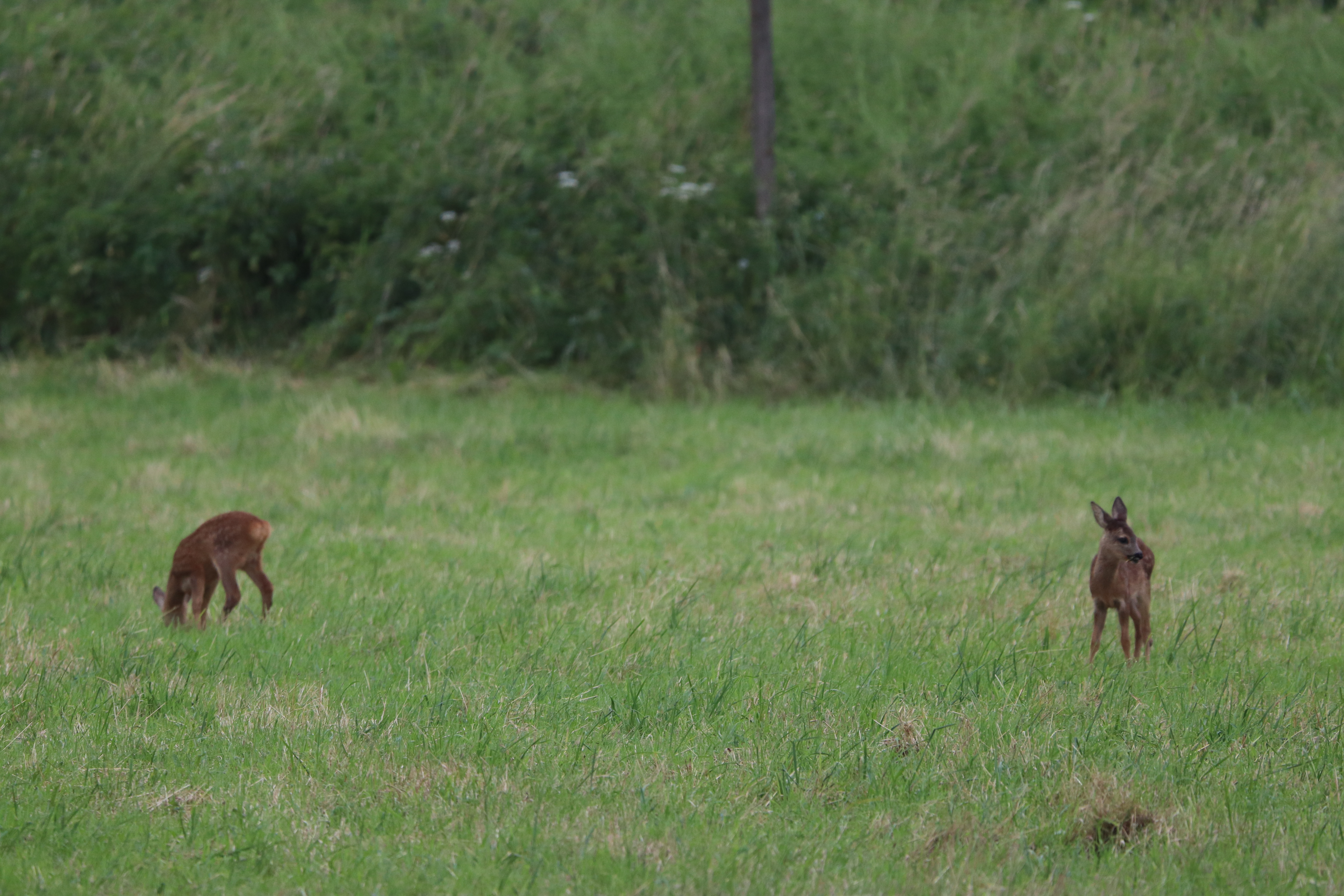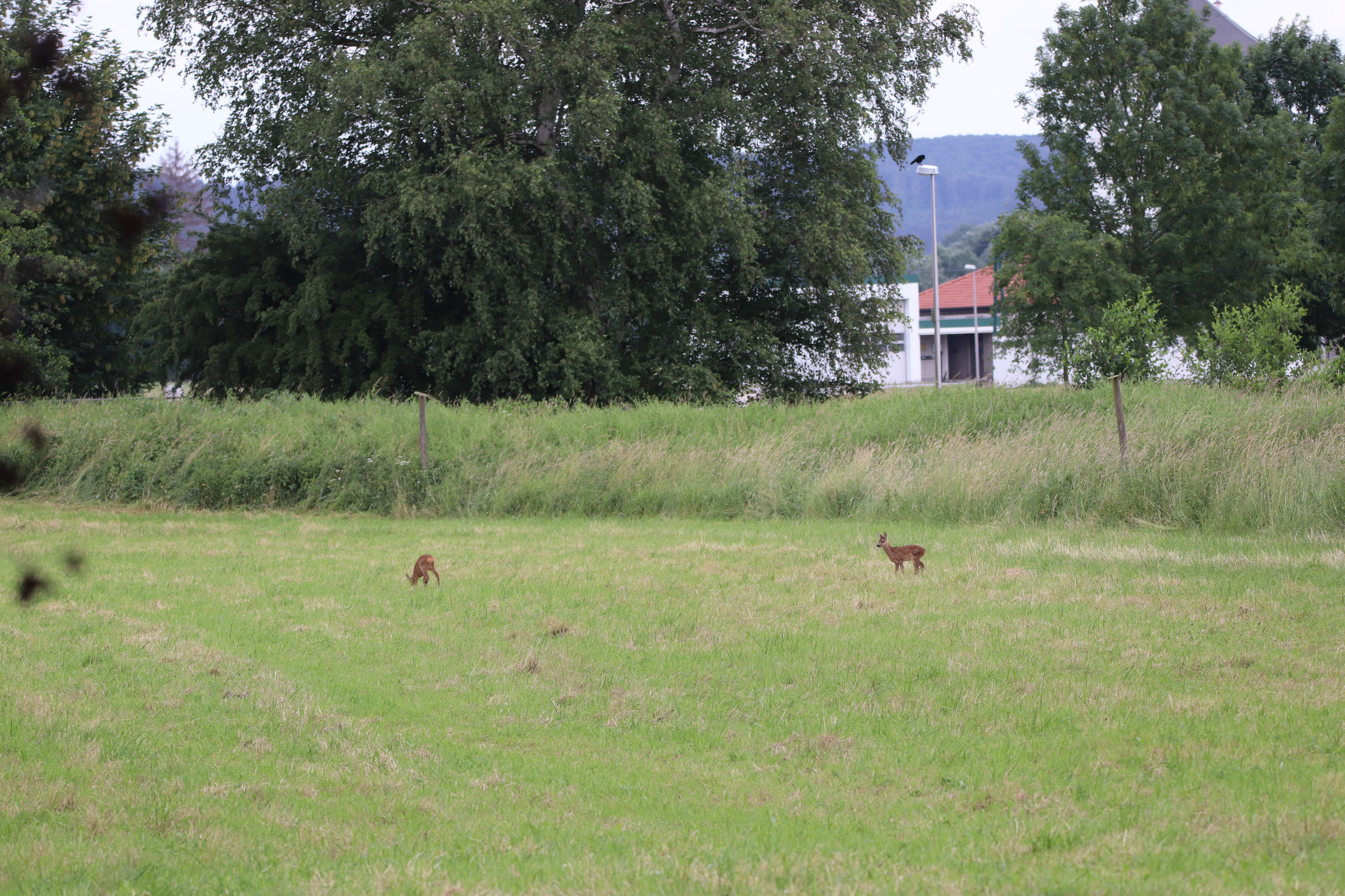 Alleine war auch ein Reh an der Kiebitzwiese zu sehen. Die Ricke fraß schon am Nachmittag an einem Gebüsch. Sie war wenig scheu und bewegte sich nicht von der Stelle. Sie ließ mich ziemlich nah herankommen, ohne eine Reaktion zu zeigen. Auf die gemähte Wiese traute sich das Reh aber nicht. Das war dann doch zu unsicher und zu offen. Auch wenn das getrocknete Heu lockte und immer wieder von ihr beäugt wurde.
