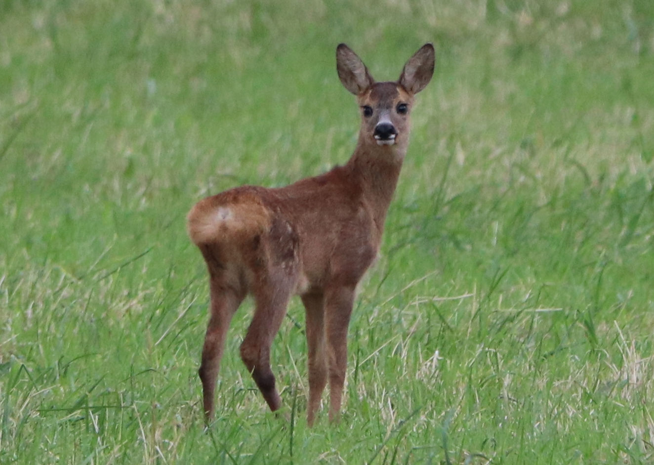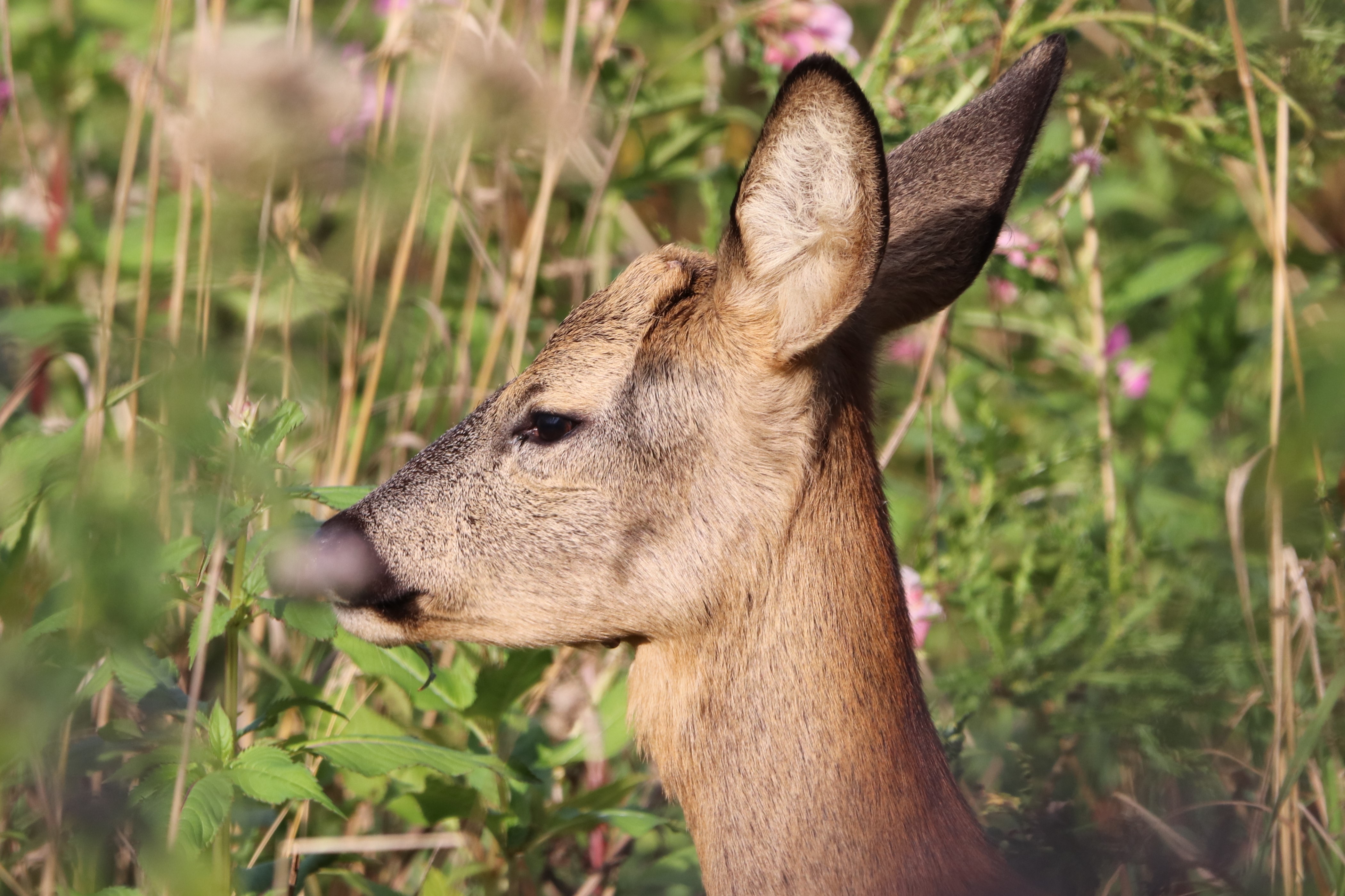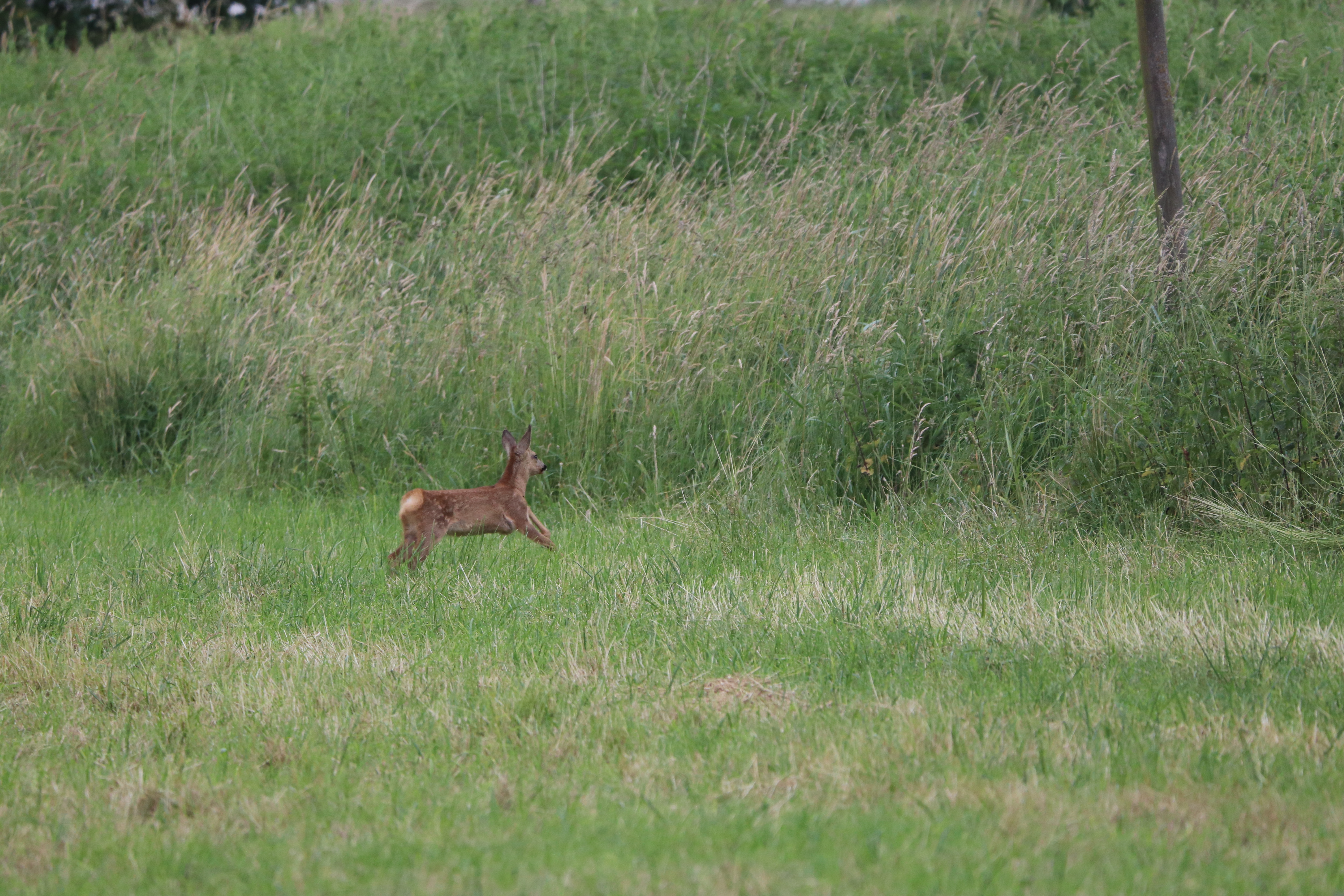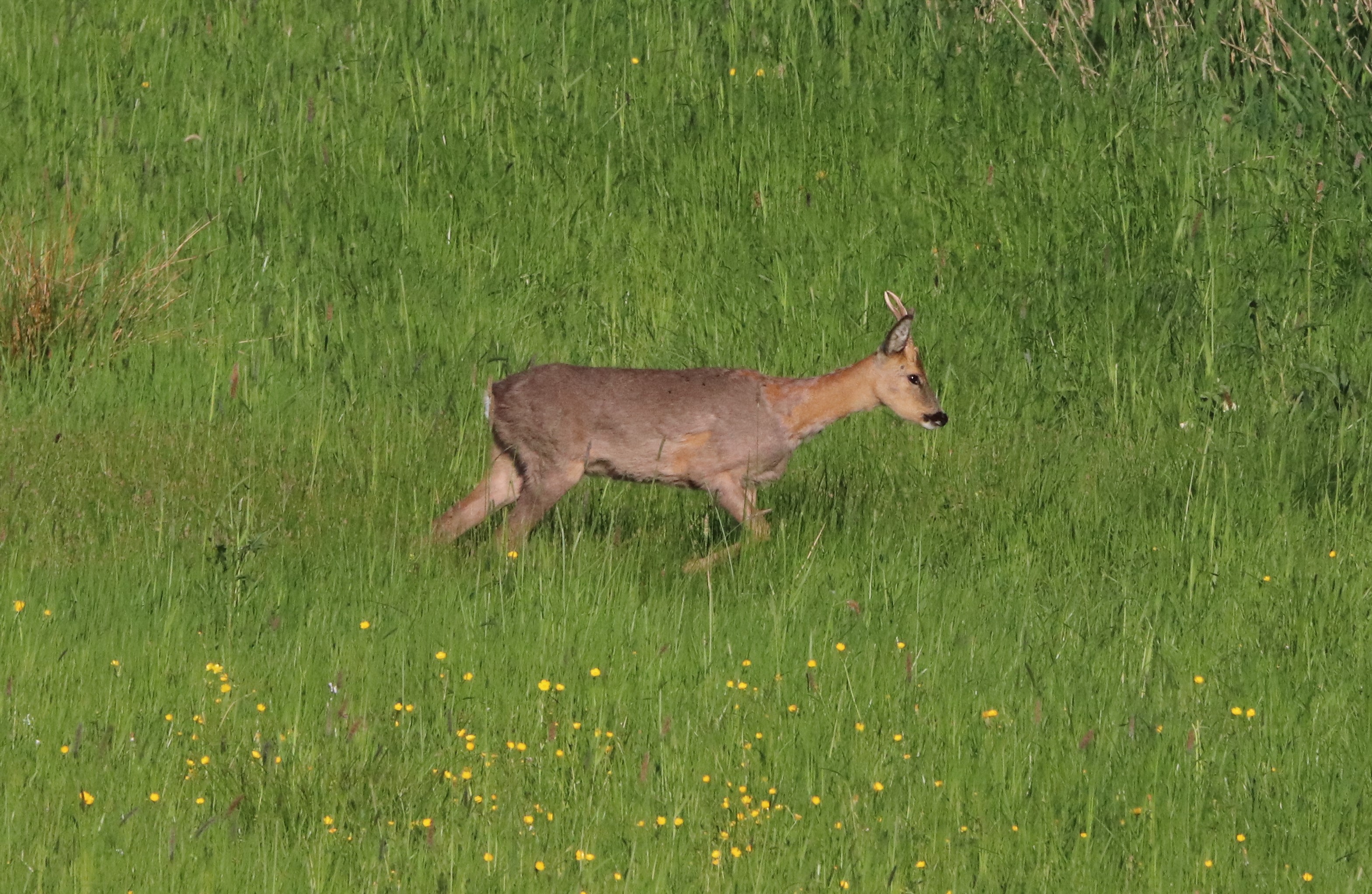 Alleine war auch ein Reh an der Kiebitzwiese zu sehen. Die Ricke fraß schon am Nachmittag an einem Gebüsch. Sie war wenig scheu und bewegte sich nicht von der Stelle. Sie ließ mich ziemlich nah herankommen, ohne eine Reaktion zu zeigen. Auf die gemähte Wiese traute sich das Reh aber nicht. Das war dann doch zu unsicher und zu offen. Auch wenn das getrocknete Heu lockte und immer wieder von ihr beäugt wurde.