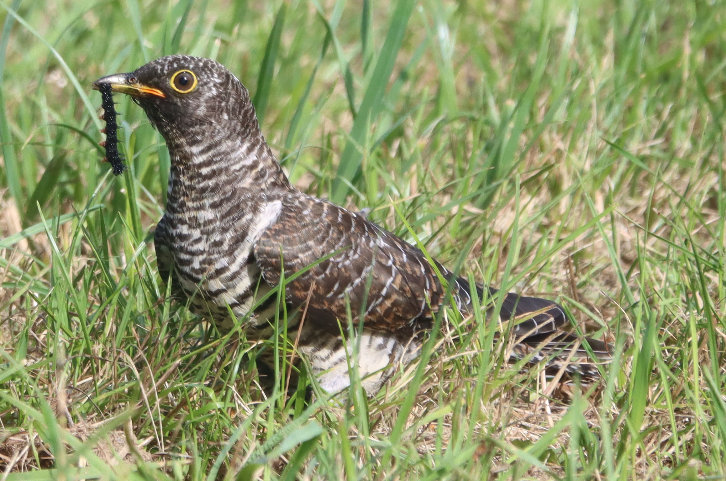 Denn die Hauptnahrung der Kuckucke sind dagegen borstige, haarige Raupen. Der junge Kuckuck jagt und frißt diese Raupen sofort, nachdem er flügge und selbstständig ist. Das kann man auch auf meinen Fotos sehen. Er ist halt ein Kuckuck, während ihn seine Pflegeeltern sozusagen mit Schonkost großgezogen haben. Der junge Vogel hat sich alles von ihnen gemerkt. Wie sie sich anhören, wie sie aussehen und wo sie ihr Nest gebaut haben. Und nächstes Jahr im Frühling wird er an seinen Geburtsort zurückkehren. Seine richtigen Eltern wird er nie sehen.