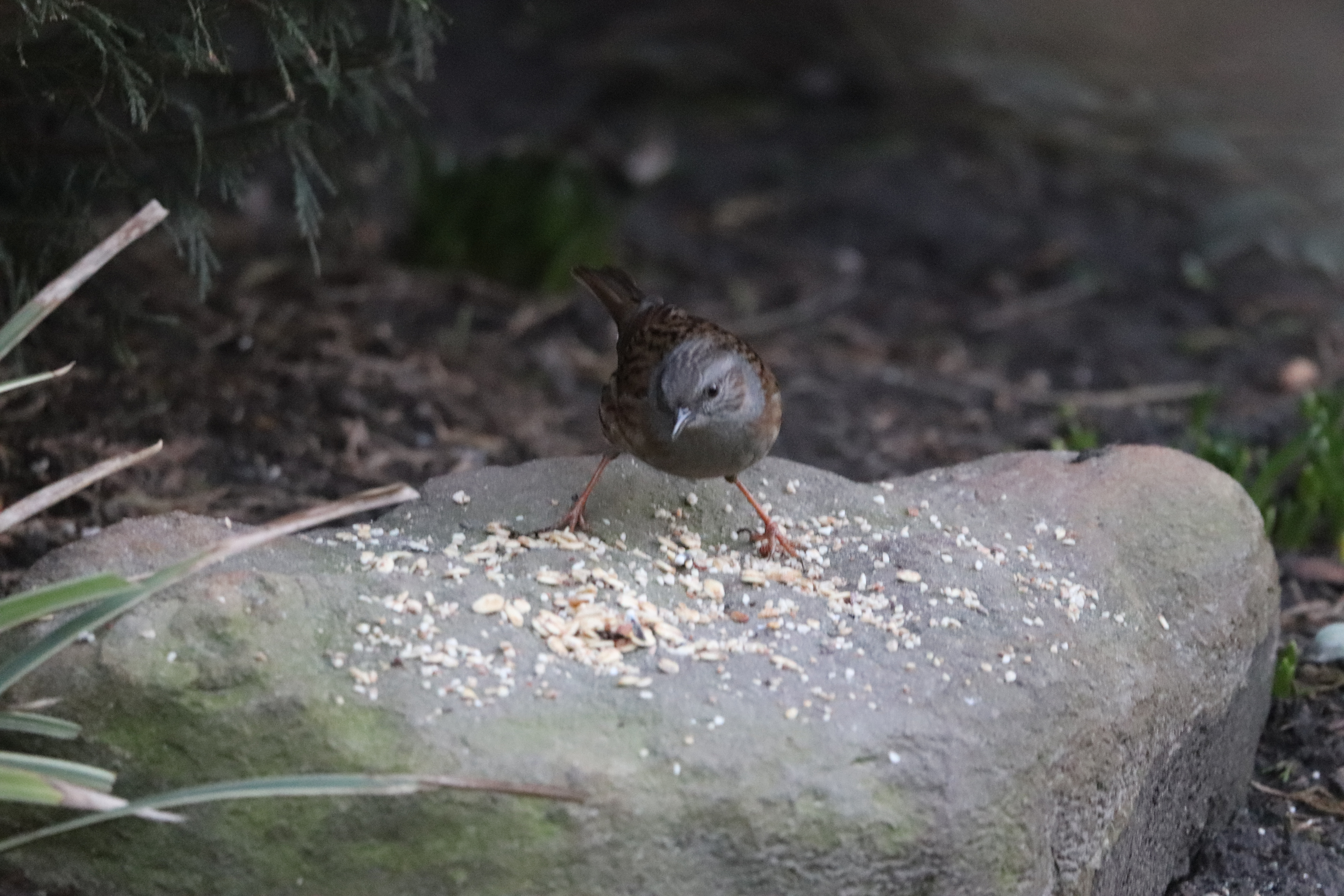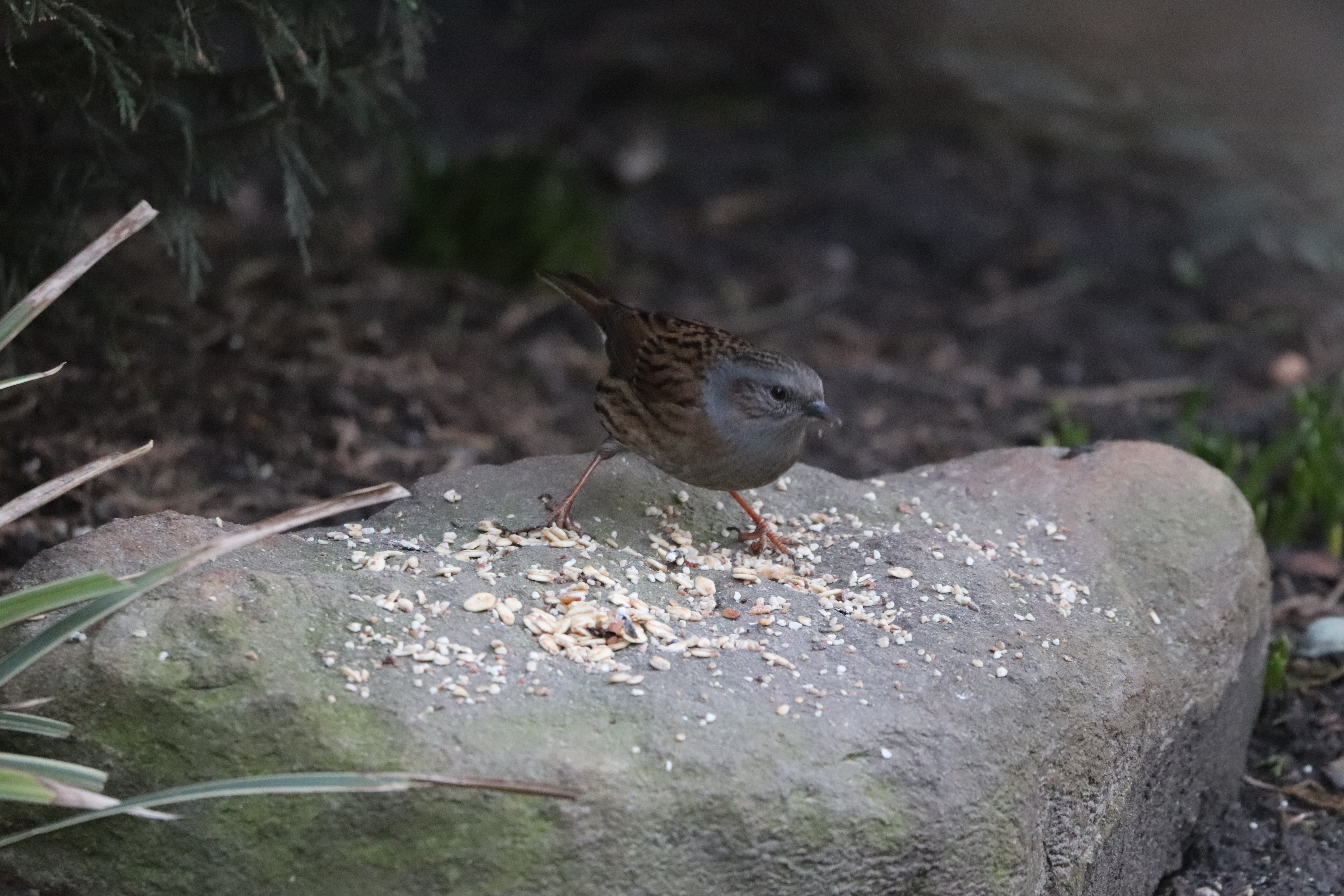 Die Heckenbraunelle ist aber nicht nur ein unscheinbarer Singvogel, sie ist auch eher schüchtern. Sie nimmt meistens nur das Futter, das auf den Boden gefallen ist. Und pirscht sich an diese Körner auch immer vorsichtig von hinten an. Dominanz und Durchsetzungsvermögen ist nicht ihre Sache.