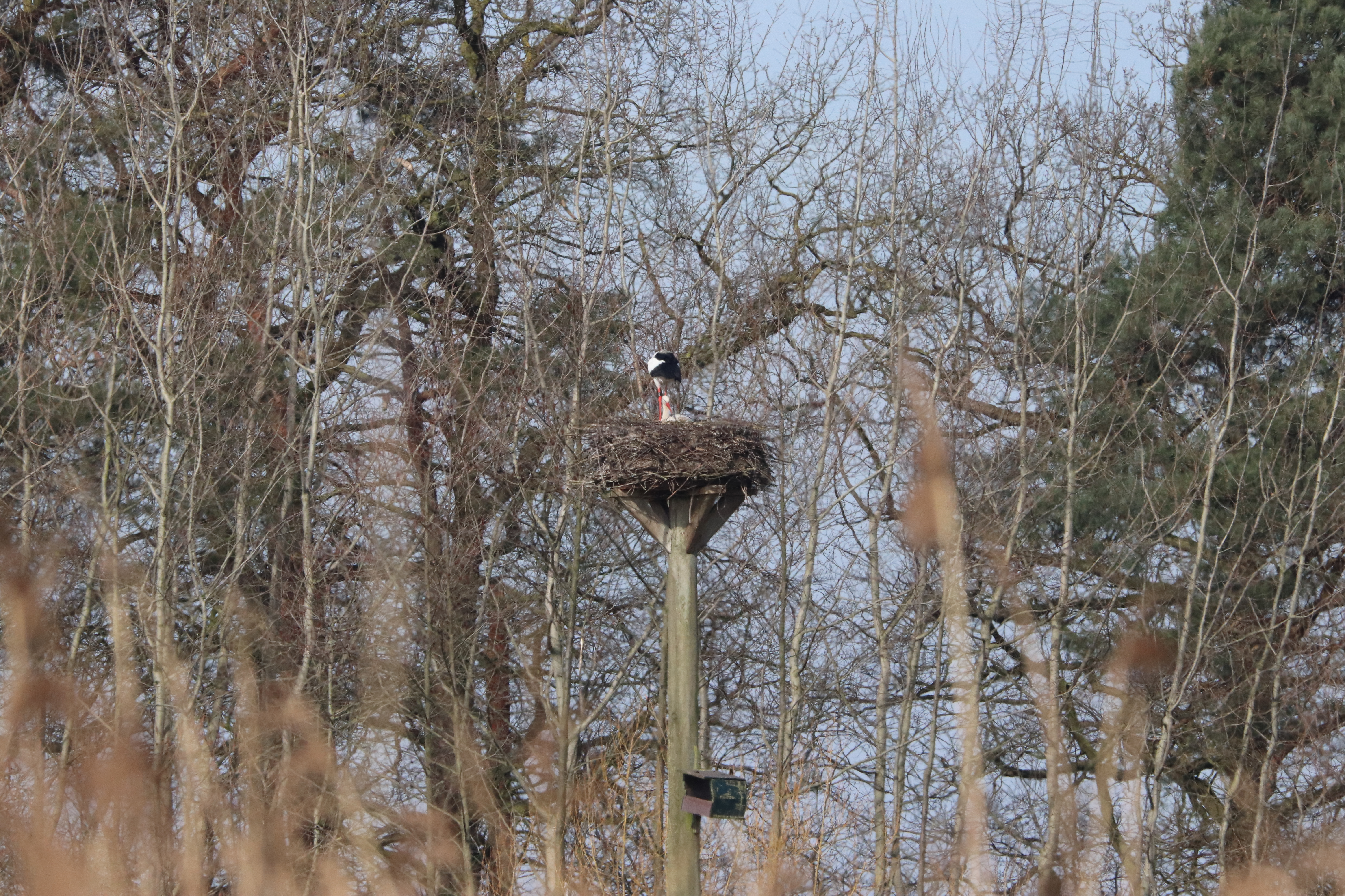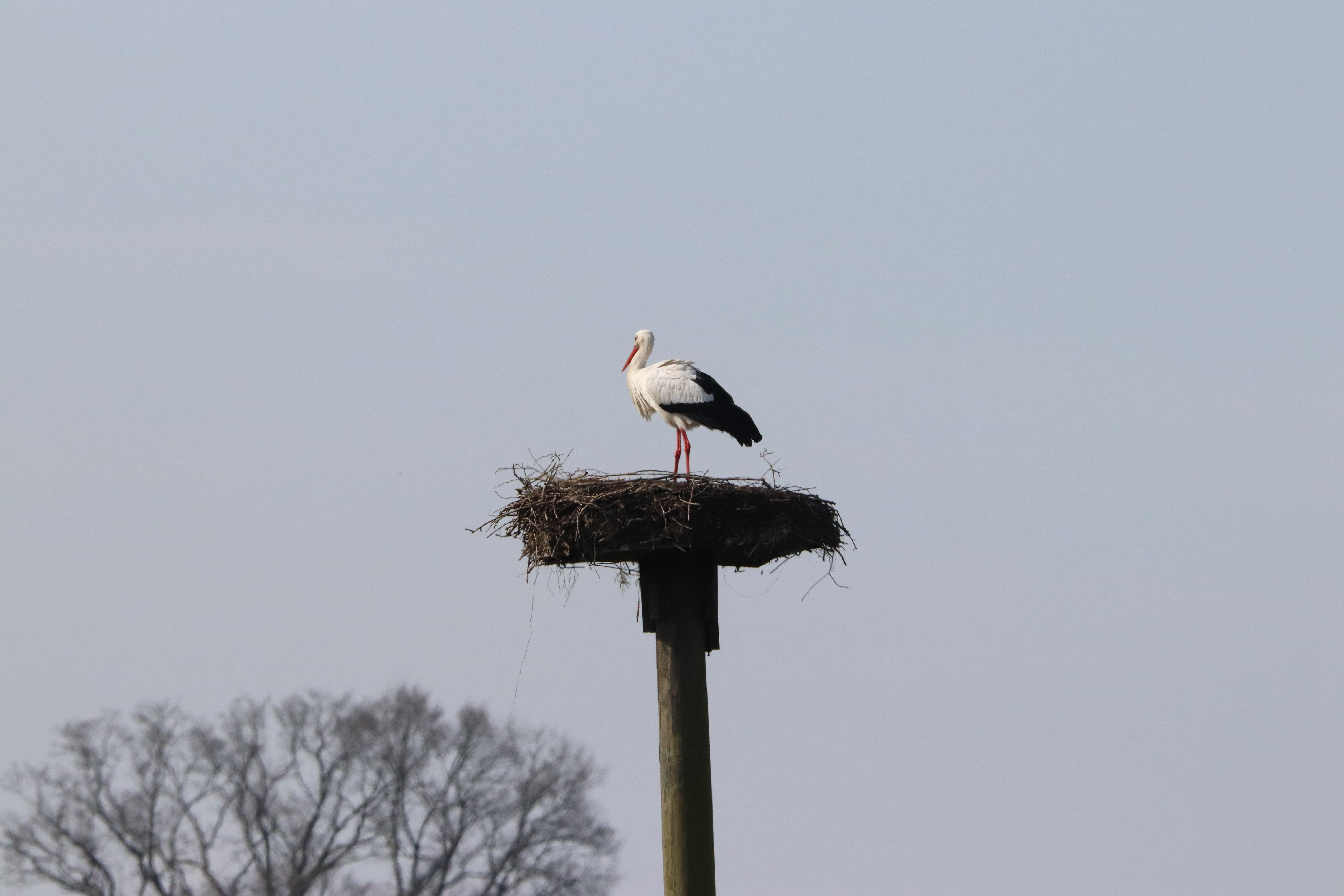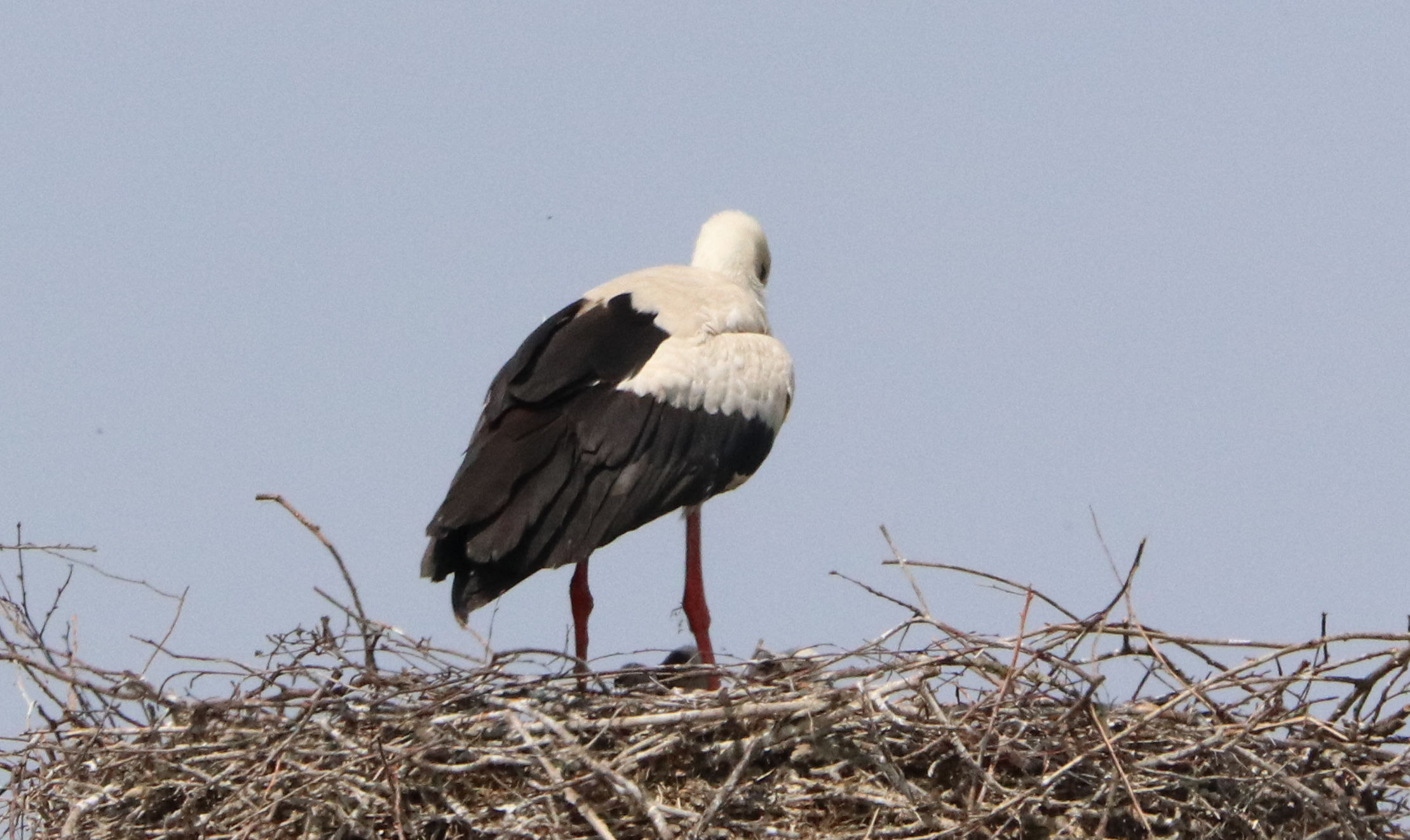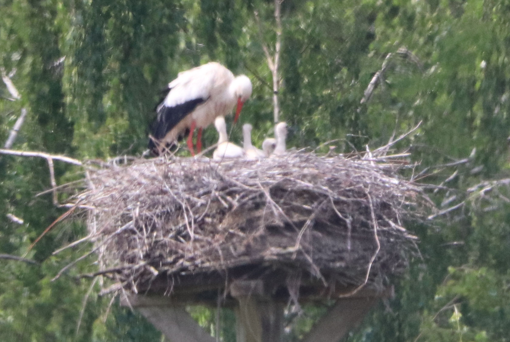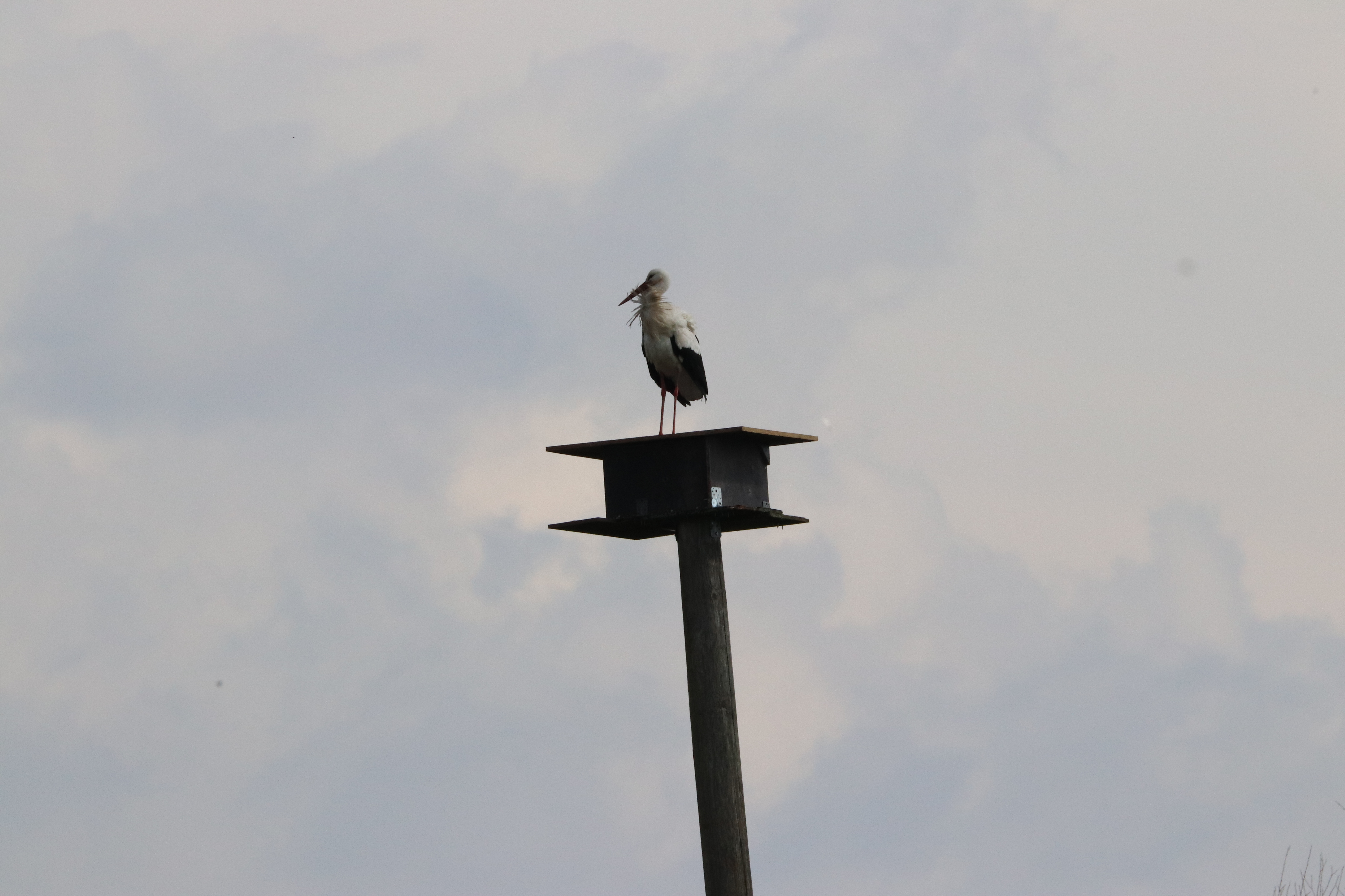 Die Altvögel sind auch nur noch selten am Nest. Ein Altvogel hält sich oft unterhalb des Storchenmastes auf der Kiebitzwiese auf. Aber er fliegt das Nest nie an. Der größere Jungvogel wird das Nest bald verlassen. Die Bruten an der Kiebitzwiese sind oft problematisch. In den letzten Jahren gab es meistens keine Paare an der Kiebitzwiese. Viele Brutversuche sind gescheitert. Auch das diesjährige Storchenpaar hatte Probleme. Wie ich hier berichtet habe, mussten sie lange mit den Nilgänsen um das Nest kämpfen. ==> Die Kämpfe um die Nester der Störche