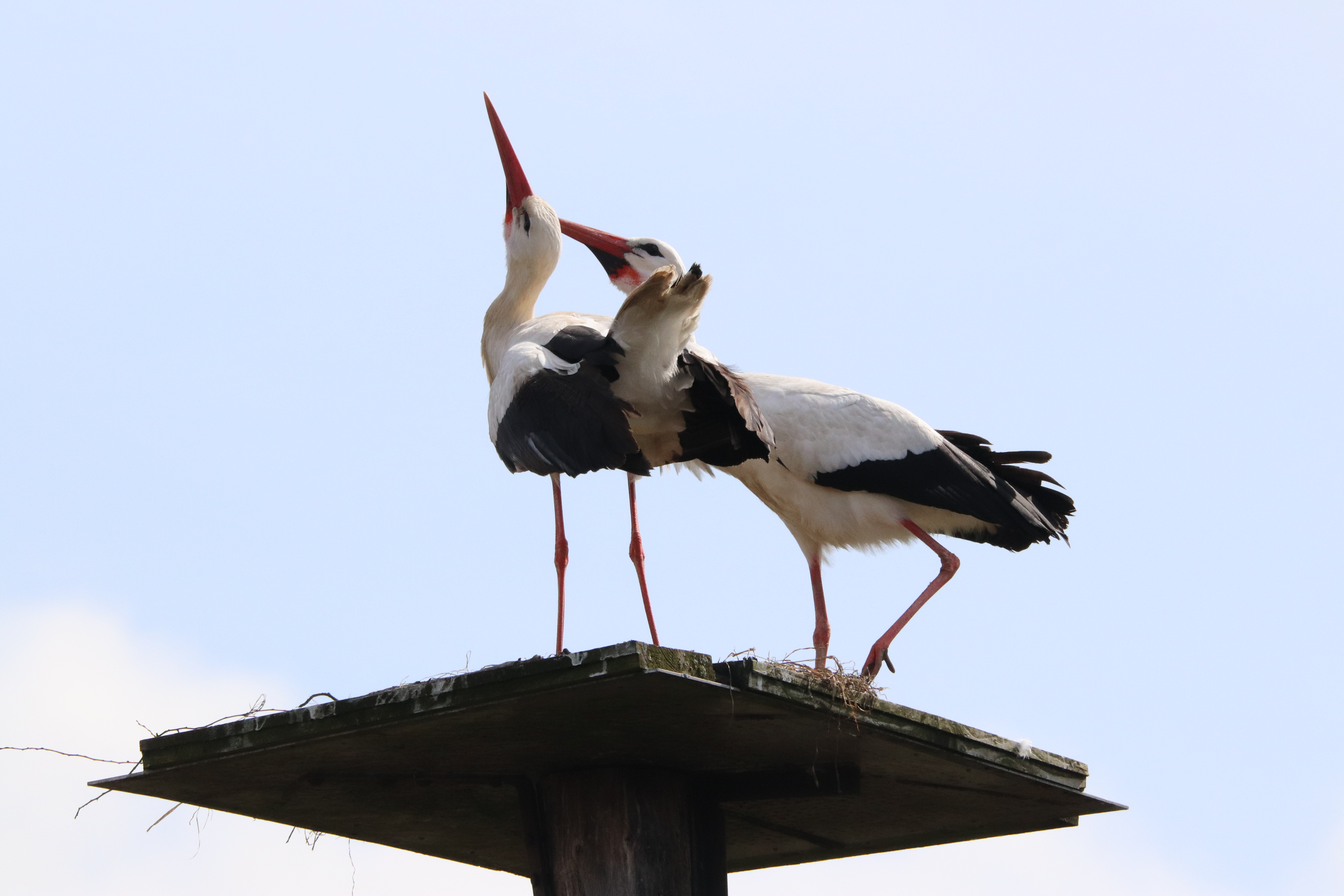 Beim Storchennachwuchs an der Kiebitzwiese gibt es zwei ungleiche Geschwister. Ich muss sagen, dass ich so etwas noch nicht erlebt habe. Der eine Jungvogel ist fast doppelt so weit in seiner Entwicklung, wie sein kleines Geschwisterchen. Es scheint fast so, als hätte der eine Jungvogel eine Behinderung. Er kann nicht stehen und liegt immer im Nest.