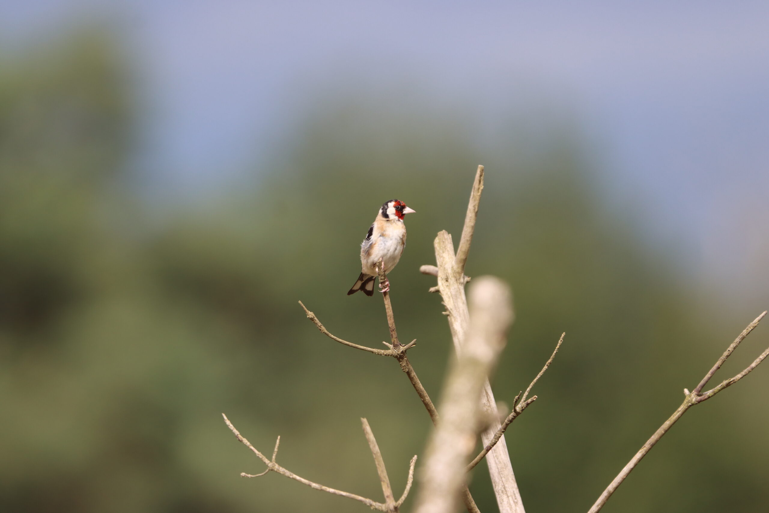 - Ein Bienenfresser hat sich nicht auf den Ansitz gesetzt. Dafür dieser Distelfink